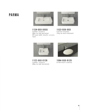 PARMA 1124-XXX-XXXX 1123-XXX-XXX Counter Lavatory Counter Lavatory (May be wall-mounted (May be wall-mounted) OR used with metallic console legs) 1122-XXX-0126 1384-XXX-0125 Counter Lavatory Undermount lavatory (May be wall-mounted) 43