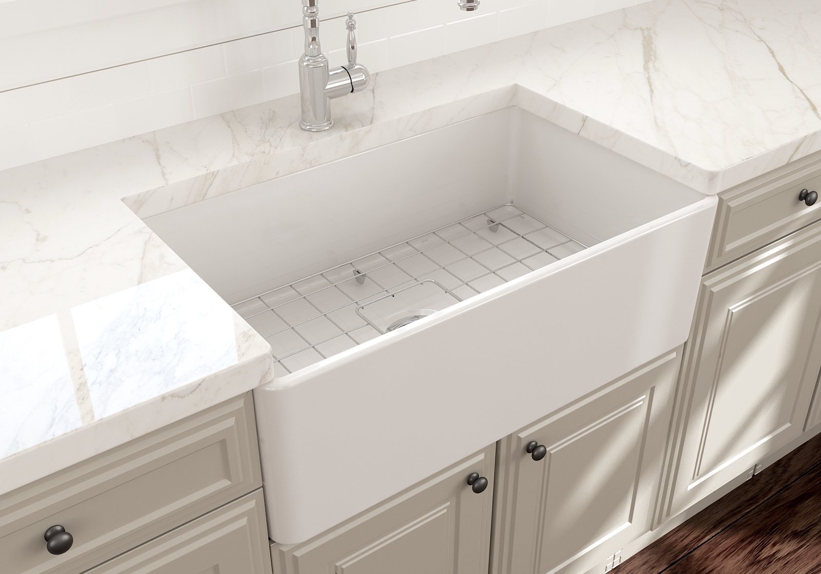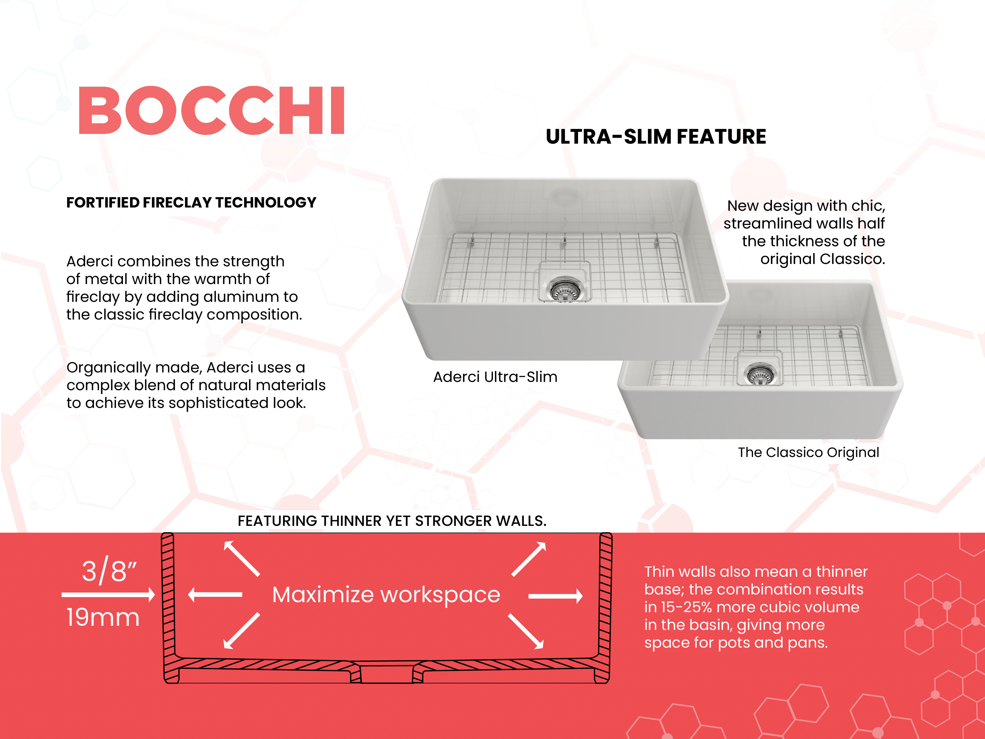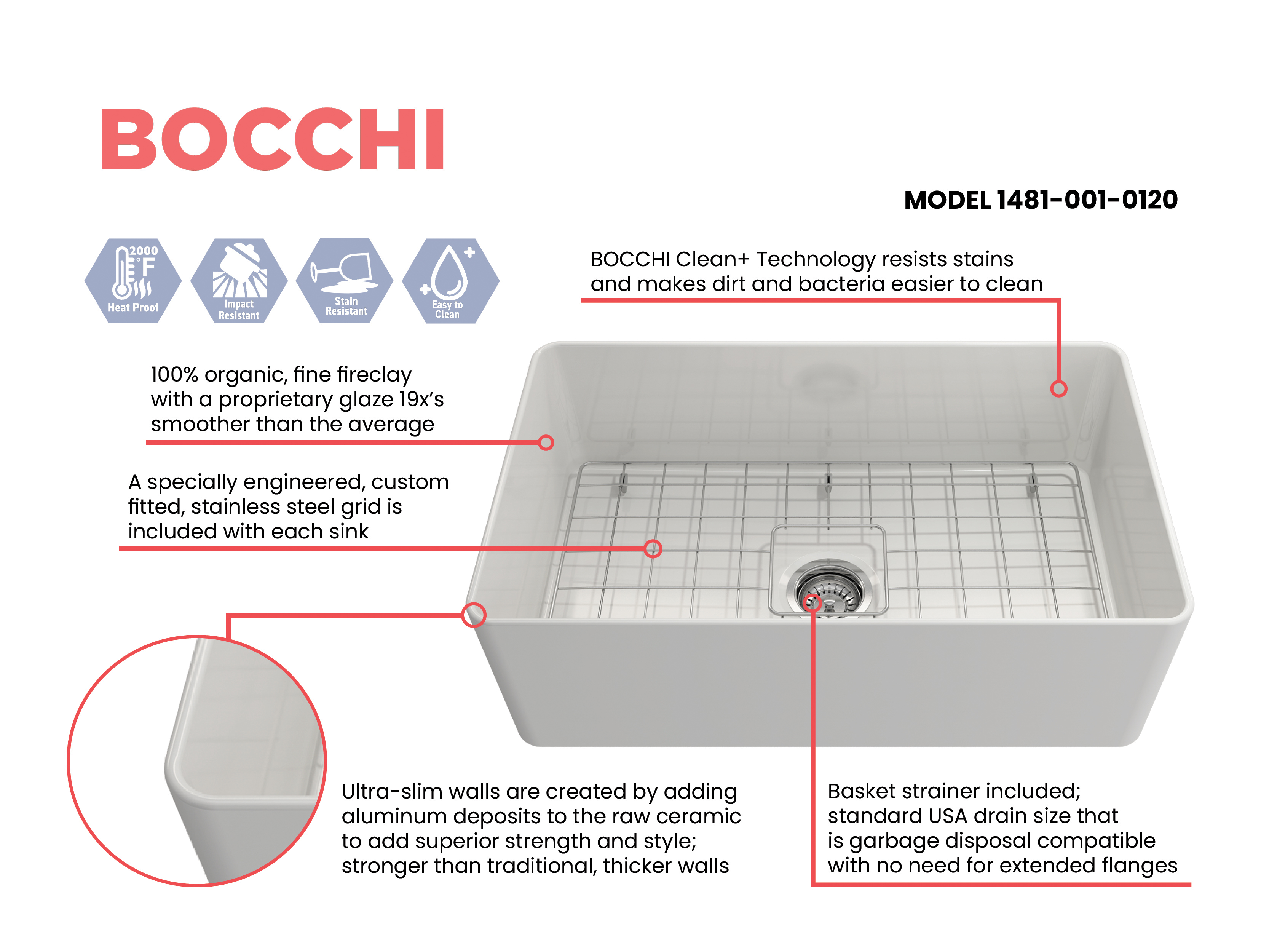 BOCCHI Farmhouse Sinks bring back the ultimate material to your kitchen. Fireclay, a 100% natural organic and recyclable material used by craftsman for centuries to create timeless appliances has now returned to your kitchen. With the firing in our kilns up to 2000°F temperatures, Fireclay becomes the most durable material used in today's kitchens. Thus, dealing with extreme heat coming from pots and pans is definitely not a problem. Due to their special glaze coating fused with the fireclay body, our sinks have a non-porous, uniform, scratch and stain resistant surface. With its protective bottom grid and distinctive looks, BOCCHI Farmhouse Sinks are truly crafted to match your design and functional desires.