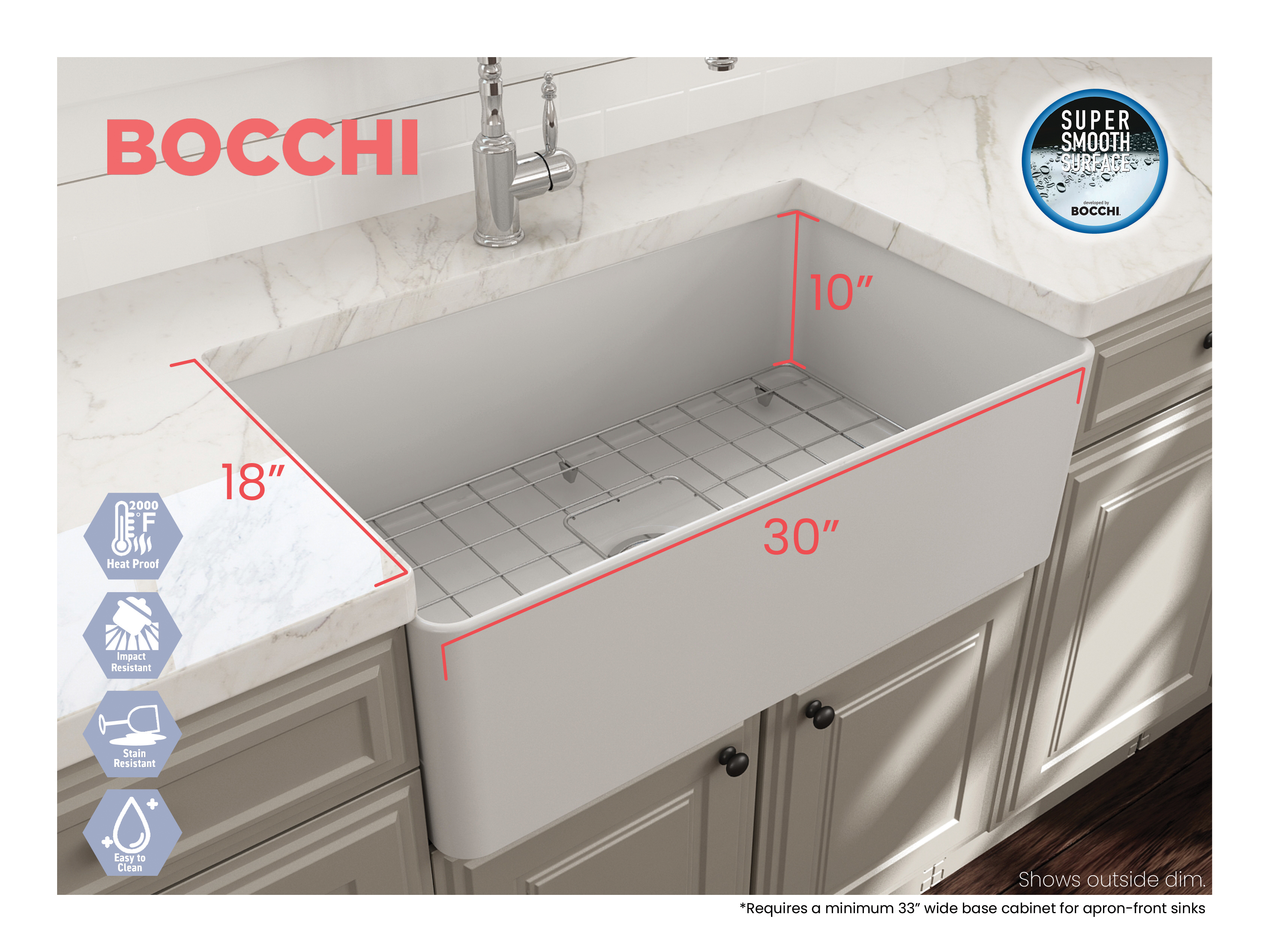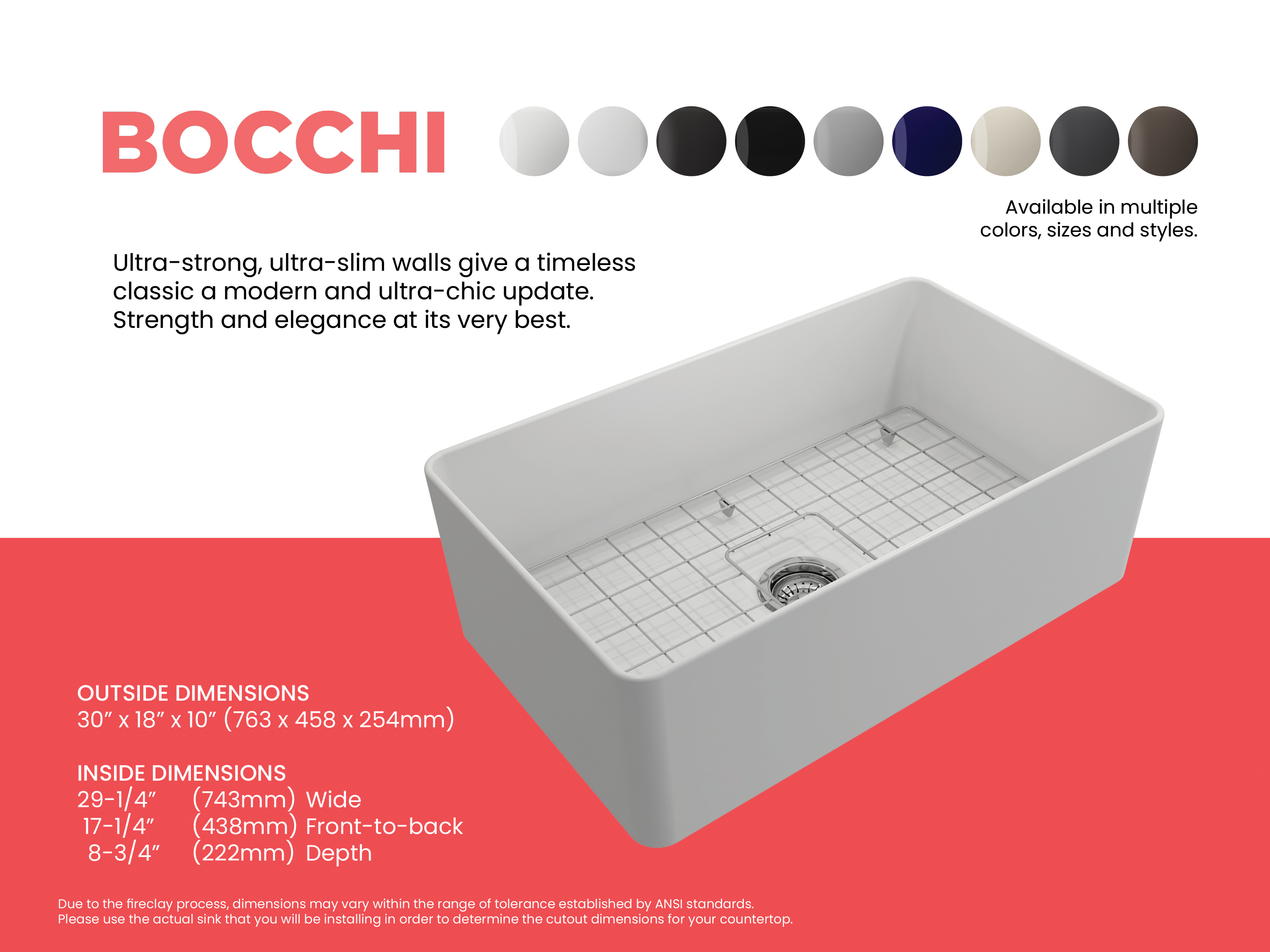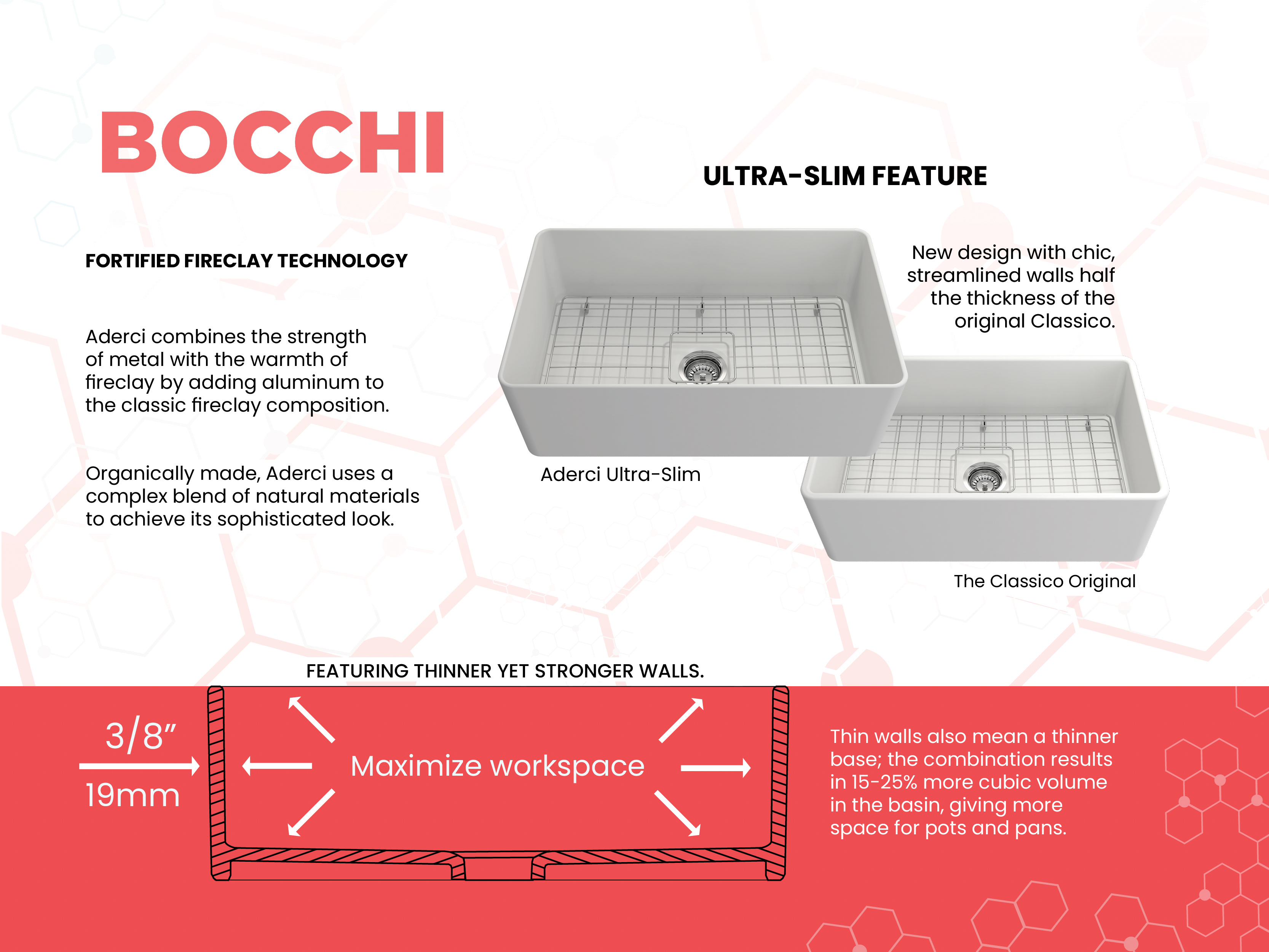 BOCCHI Farmhouse Sinks bring back the ultimate material to your kitchen. Fireclay, a 100% natural organic and recyclable material used by craftsman for centuries to create timeless appliances has now returned to your kitchen. With the firing in our kilns up to 2000°F temperatures, Fireclay becomes the most durable material used in today's kitchens. Thus, dealing with extreme heat coming from pots and pans is definitely not a problem. Due to their special glaze coating fused with the fireclay body, our sinks have a non-porous, uniform, scratch and stain resistant surface. With its protective bottom grid and distinctive looks, BOCCHI Farmhouse Sinks are truly crafted to match your design and functional desires.