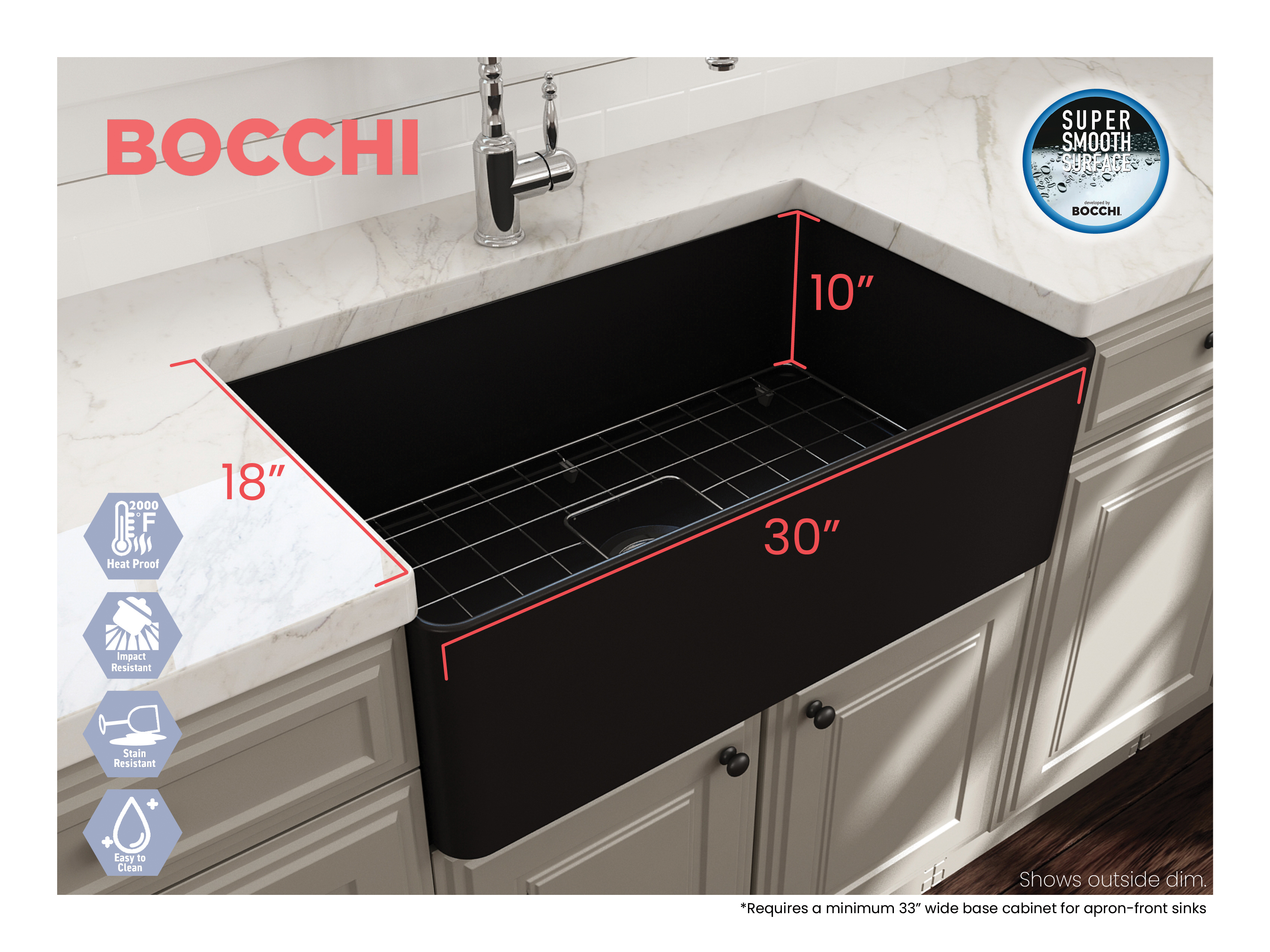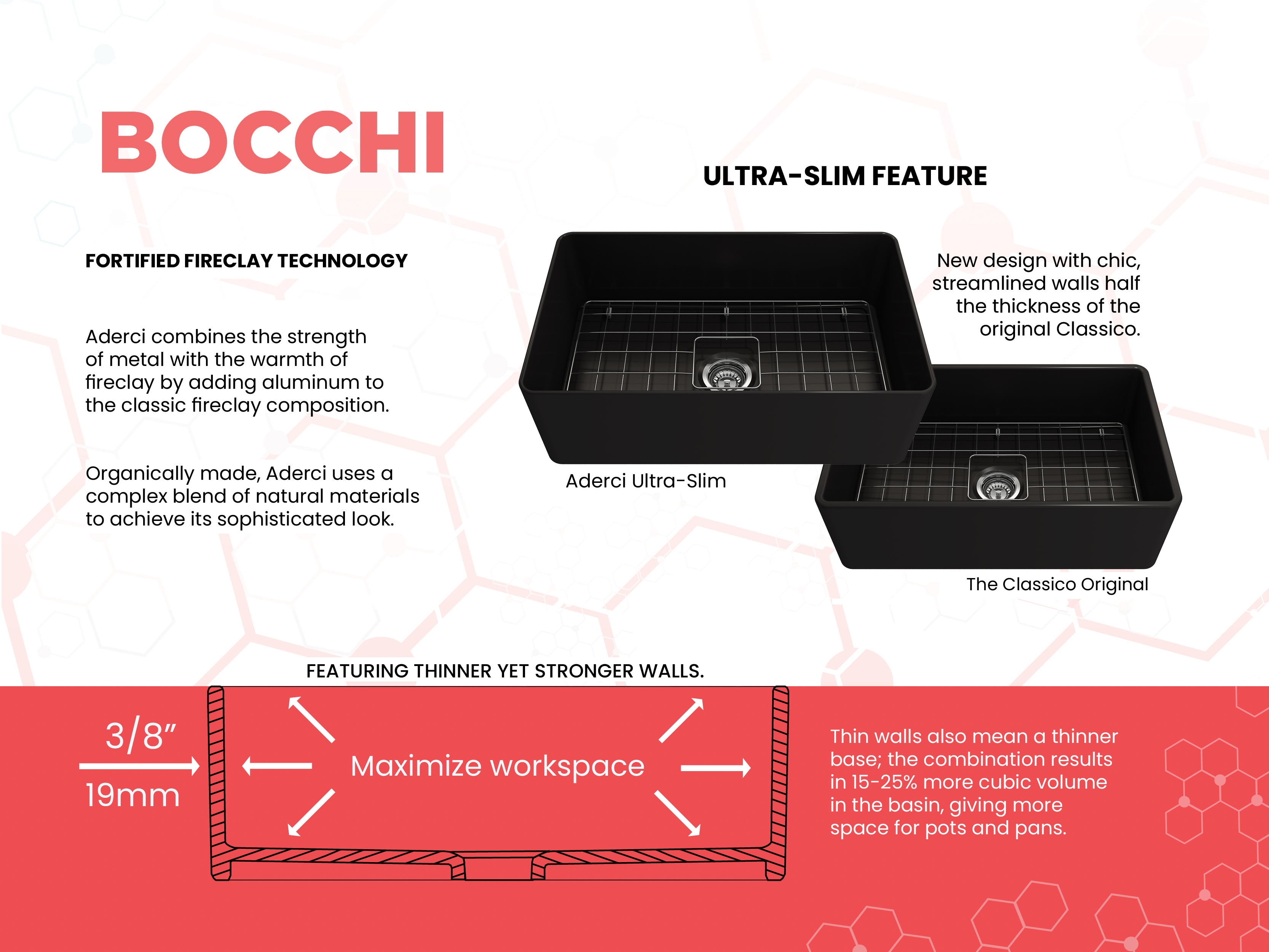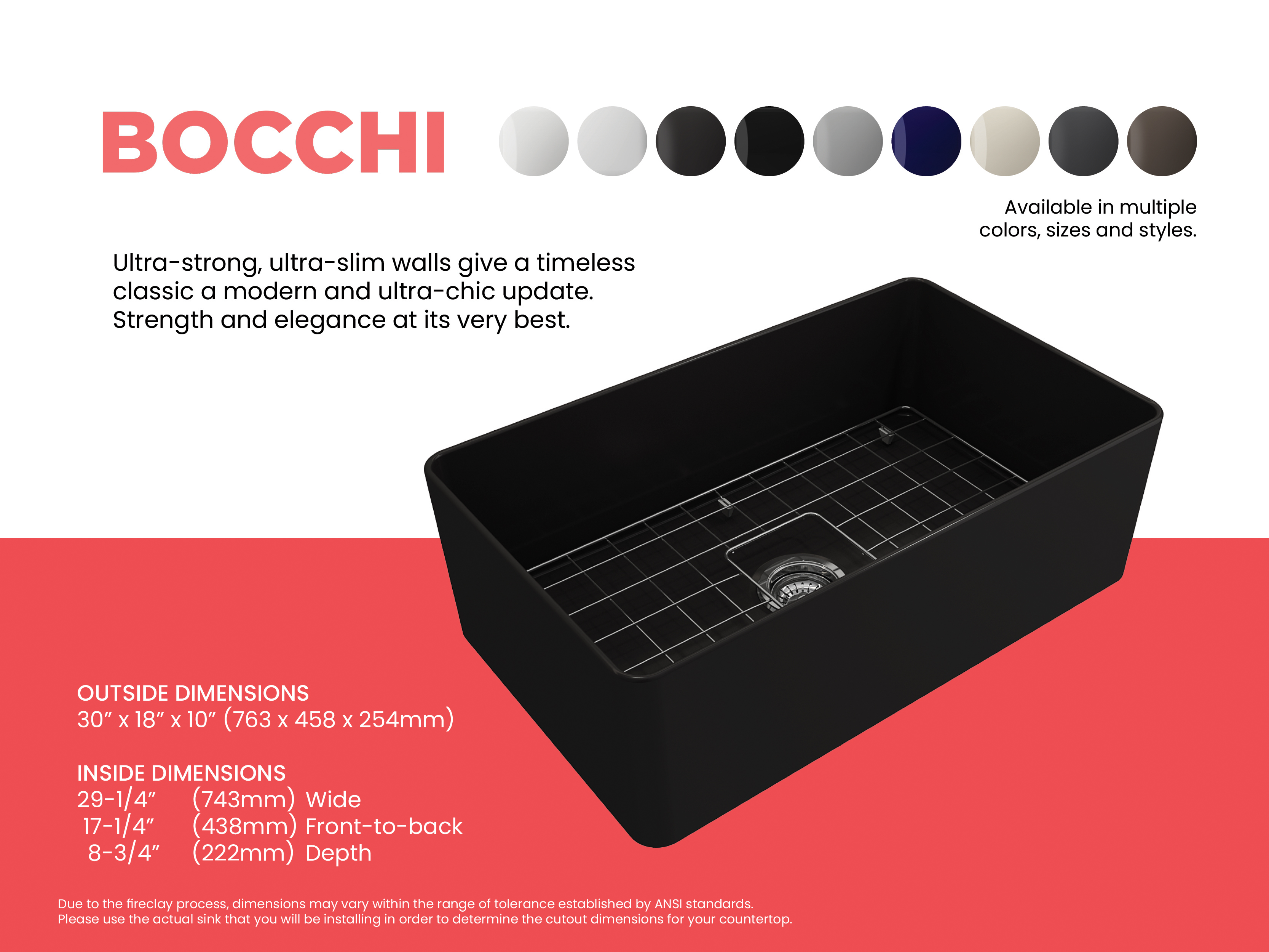 BOCCHI Farmhouse Sinks bring back the ultimate material to your kitchen. Fireclay, a 100% natural organic and recyclable material used by craftsman for centuries to create timeless appliances has now returned to your kitchen. With the firing in our kilns up to 2000°F temperatures, Fireclay becomes the most durable material used in today's kitchens. Thus, dealing with extreme heat coming from pots and pans is definitely not a problem. Due to their special glaze coating fused with the fireclay body, our sinks have a non-porous, uniform, scratch and stain resistant surface. With its protective bottom grid and distinctive looks, BOCCHI Farmhouse Sinks are truly crafted to match your design and functional desires.