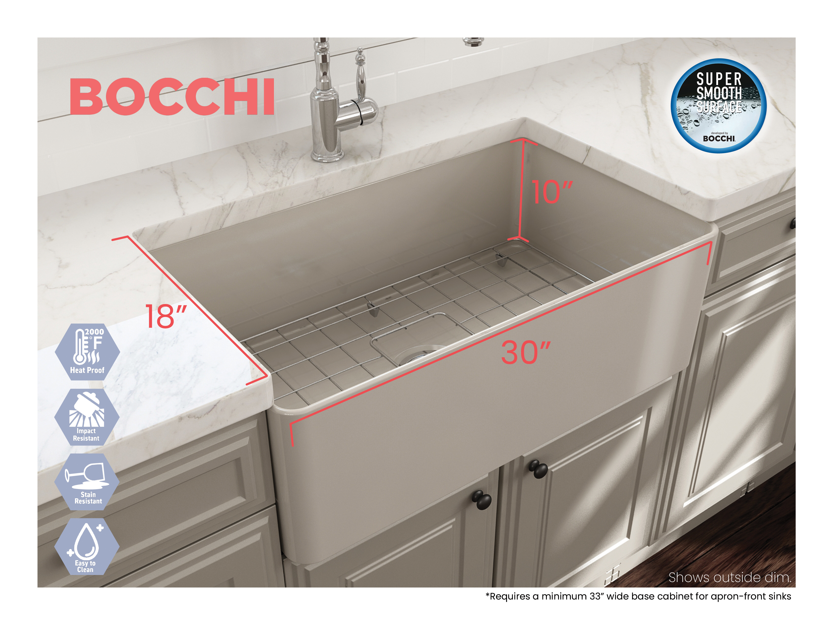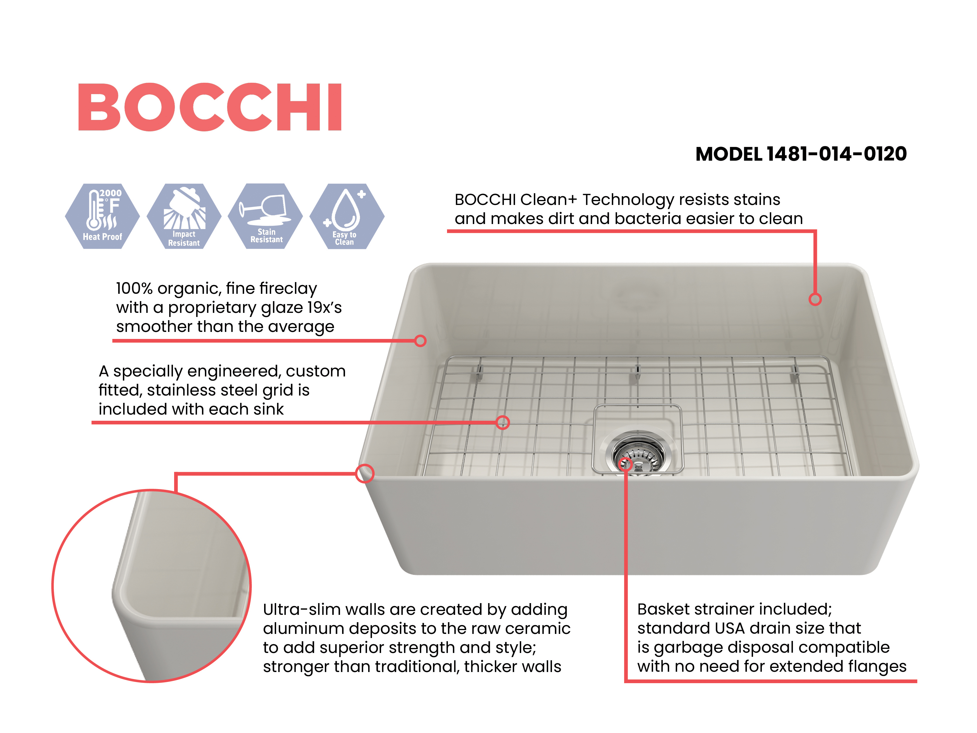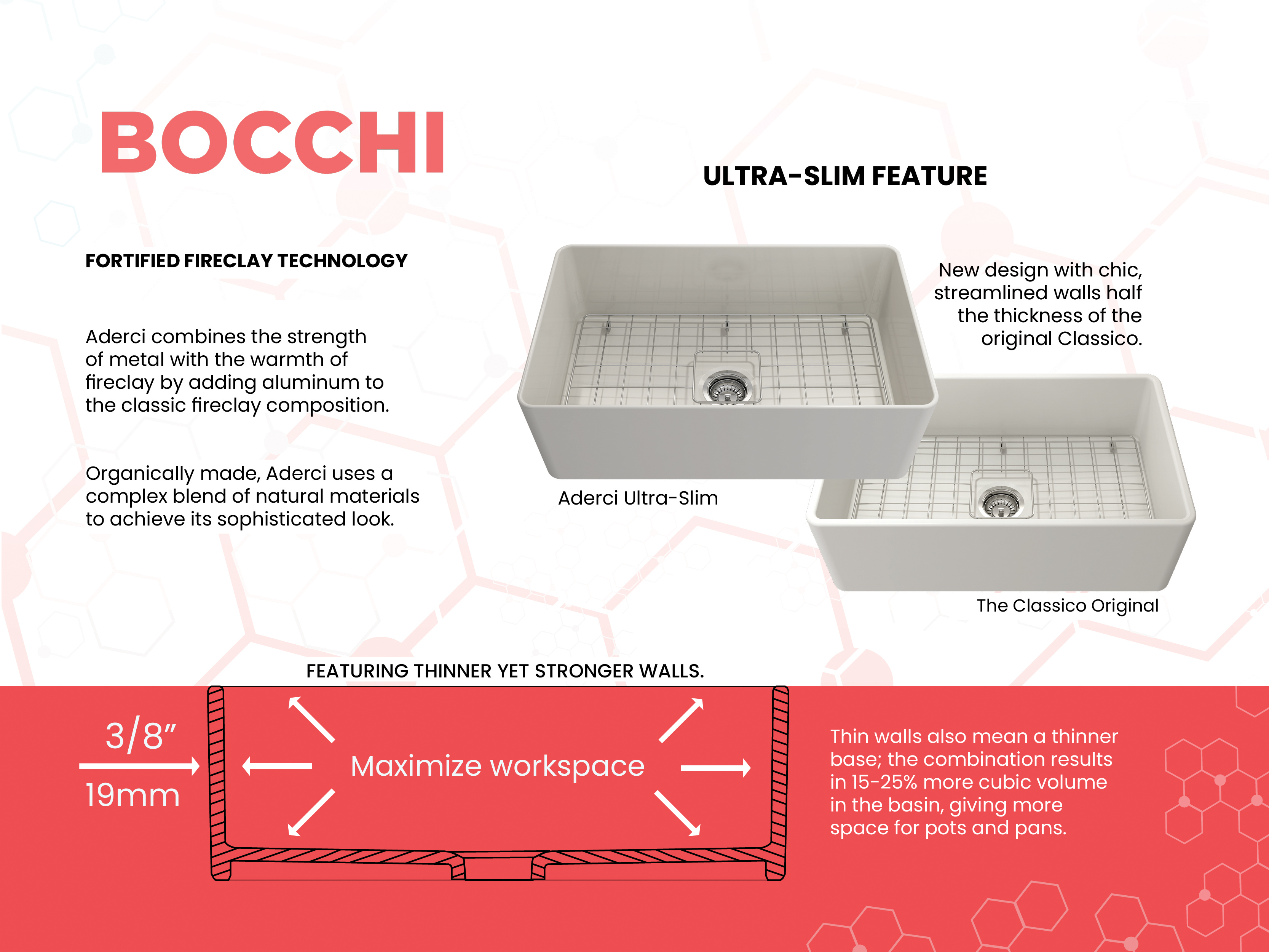 BOCCHI Farmhouse Sinks bring back the ultimate material to your kitchen. Fireclay, a 100% natural organic and recyclable material used by craftsman for centuries to create timeless appliances has now returned to your kitchen. With the firing in our kilns up to 2000°F temperatures, Fireclay becomes the most durable material used in today's kitchens. Thus, dealing with extreme heat coming from pots and pans is definitely not a problem. Due to their special glaze coating fused with the fireclay body, our sinks have a non-porous, uniform, scratch and stain resistant surface. With its protective bottom grid and distinctive looks, BOCCHI Farmhouse Sinks are truly crafted to match your design and functional desires.