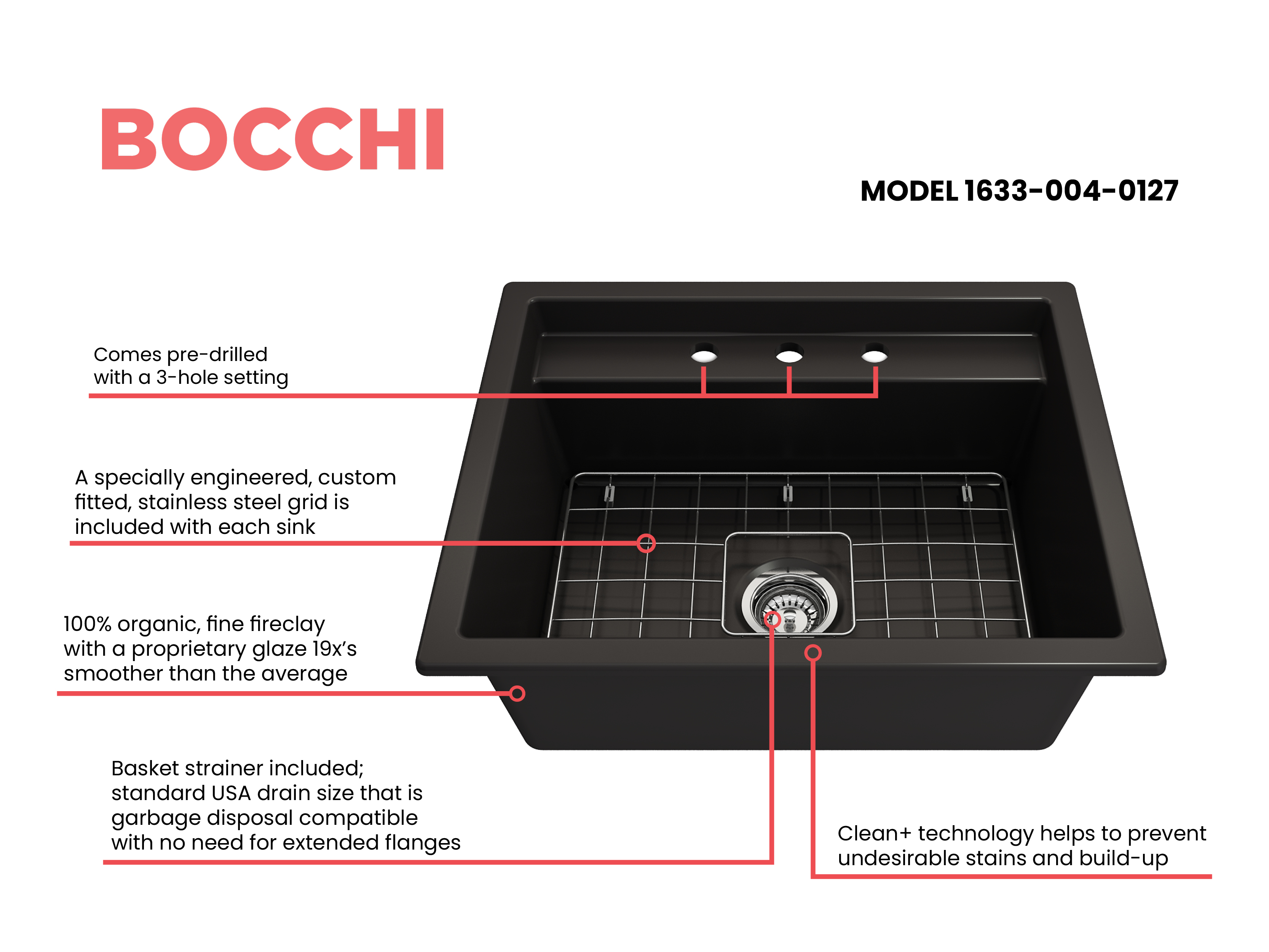 BOCCHI Farmhouse Sinks bring back the ultimate material to your kitchen. Fireclay, a 100% natural organic and recyclable material used by craftsman for centuries to create timeless appliances has now returned to your kitchen. With the firing in our kilns up to 2000°F temperatures, Fireclay becomes the most durable material used in today's kitchens. Thus, dealing with extreme heat coming from pots and pans is definitely not a problem. Due to their special glaze coating fused with the fireclay body, our sinks have a non-porous, uniform, scratch and stain resistant surface. With its protective bottom grid and distinctive looks, BOCCHI Farmhouse Sinks are truly crafted to match your design and functional desires.