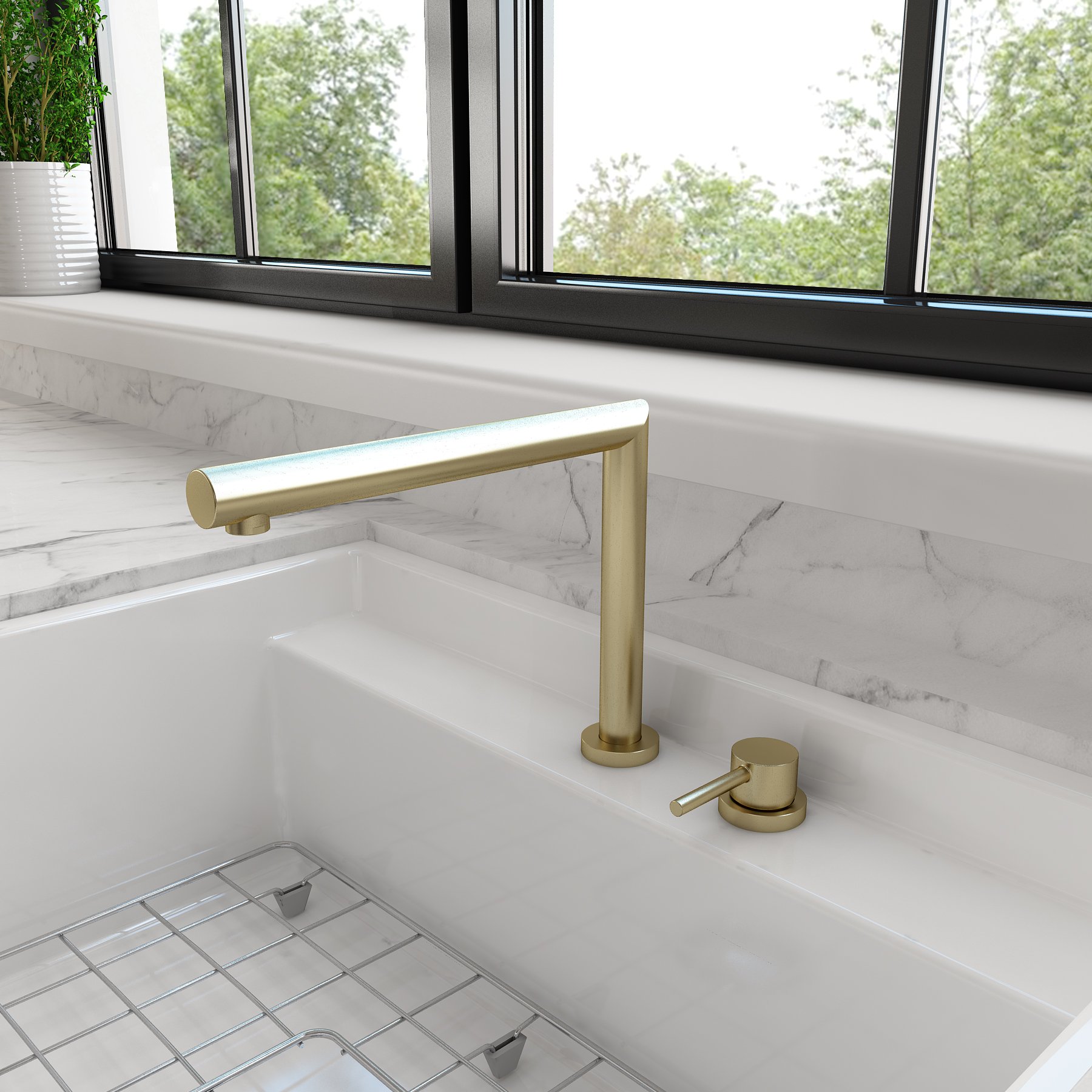 Pull-down kitchen faucet with ceramic cartridges and brass body. Features standard or needle spray with weighted shower hose.
