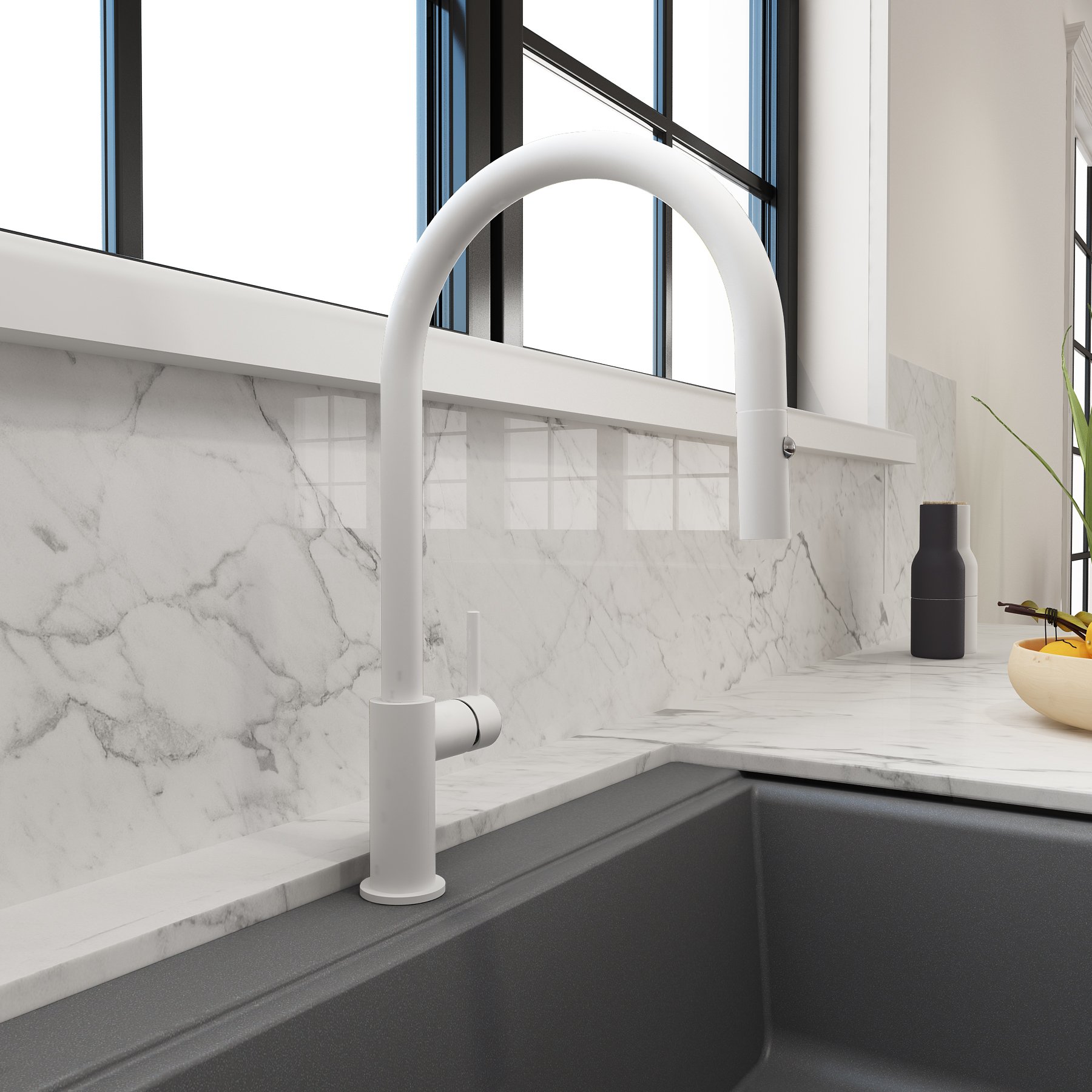 Pull-down kitchen faucet with ceramic cartridges and brass body. Features standard or needle spray with weighted shower hose.