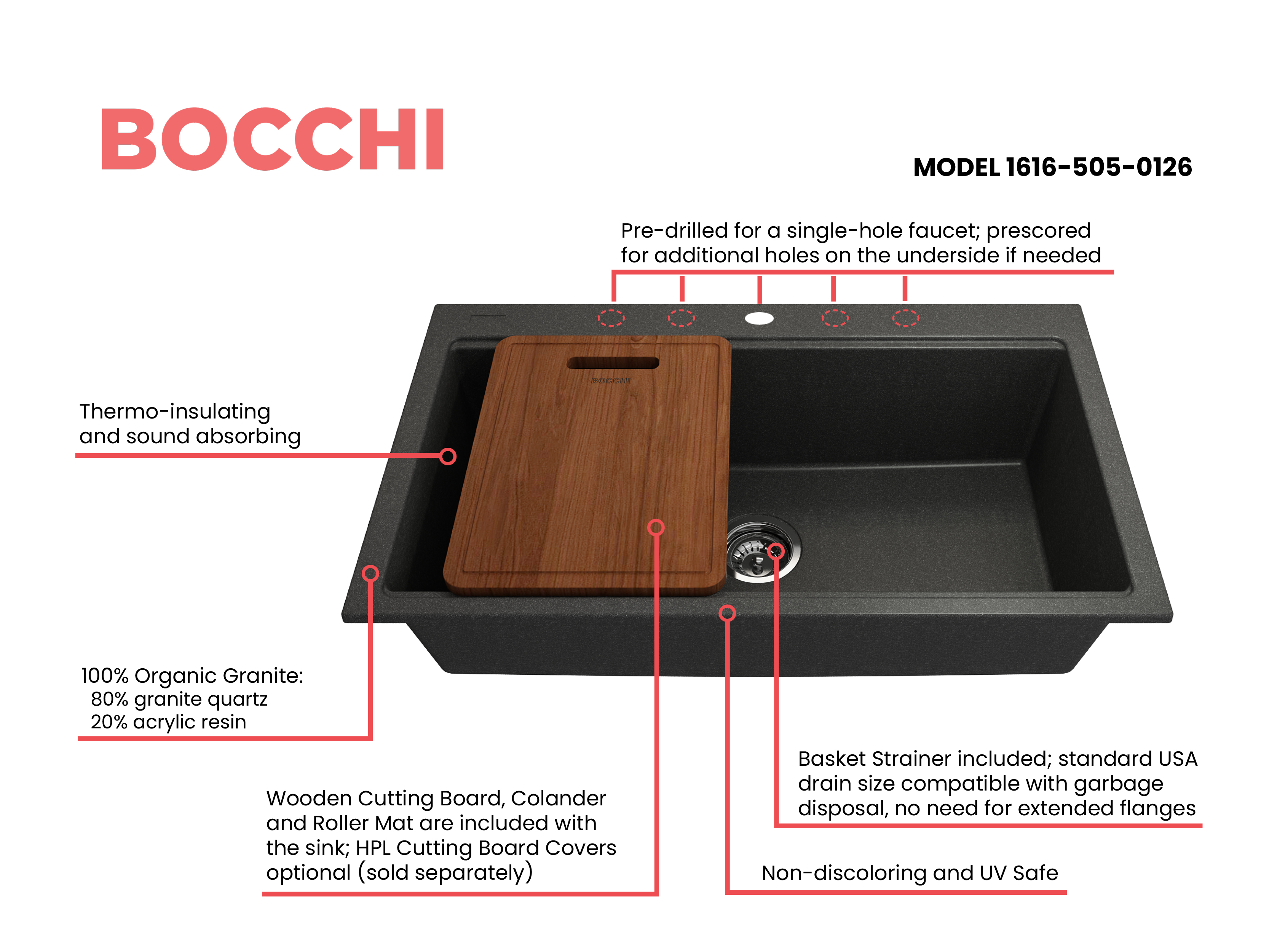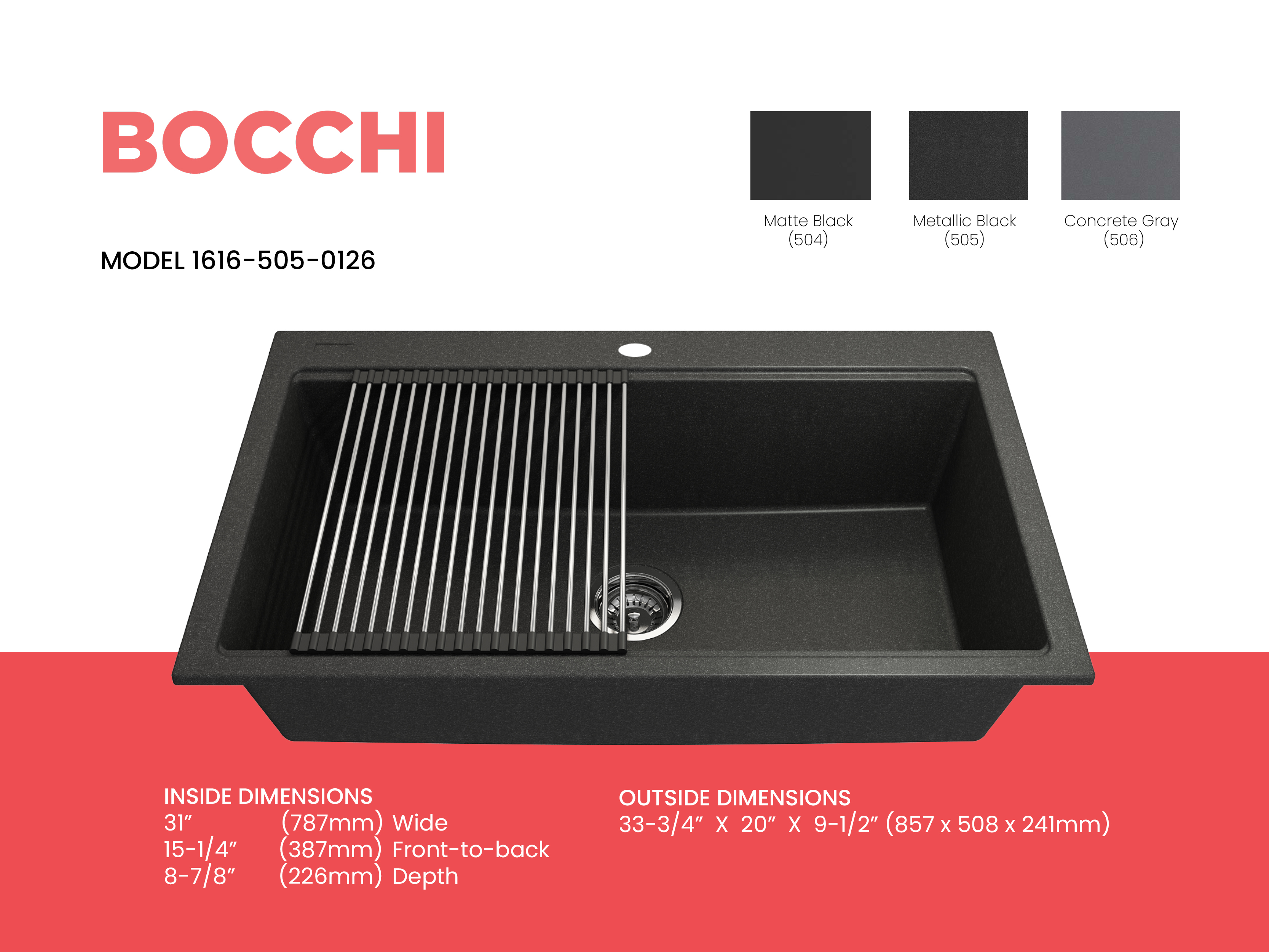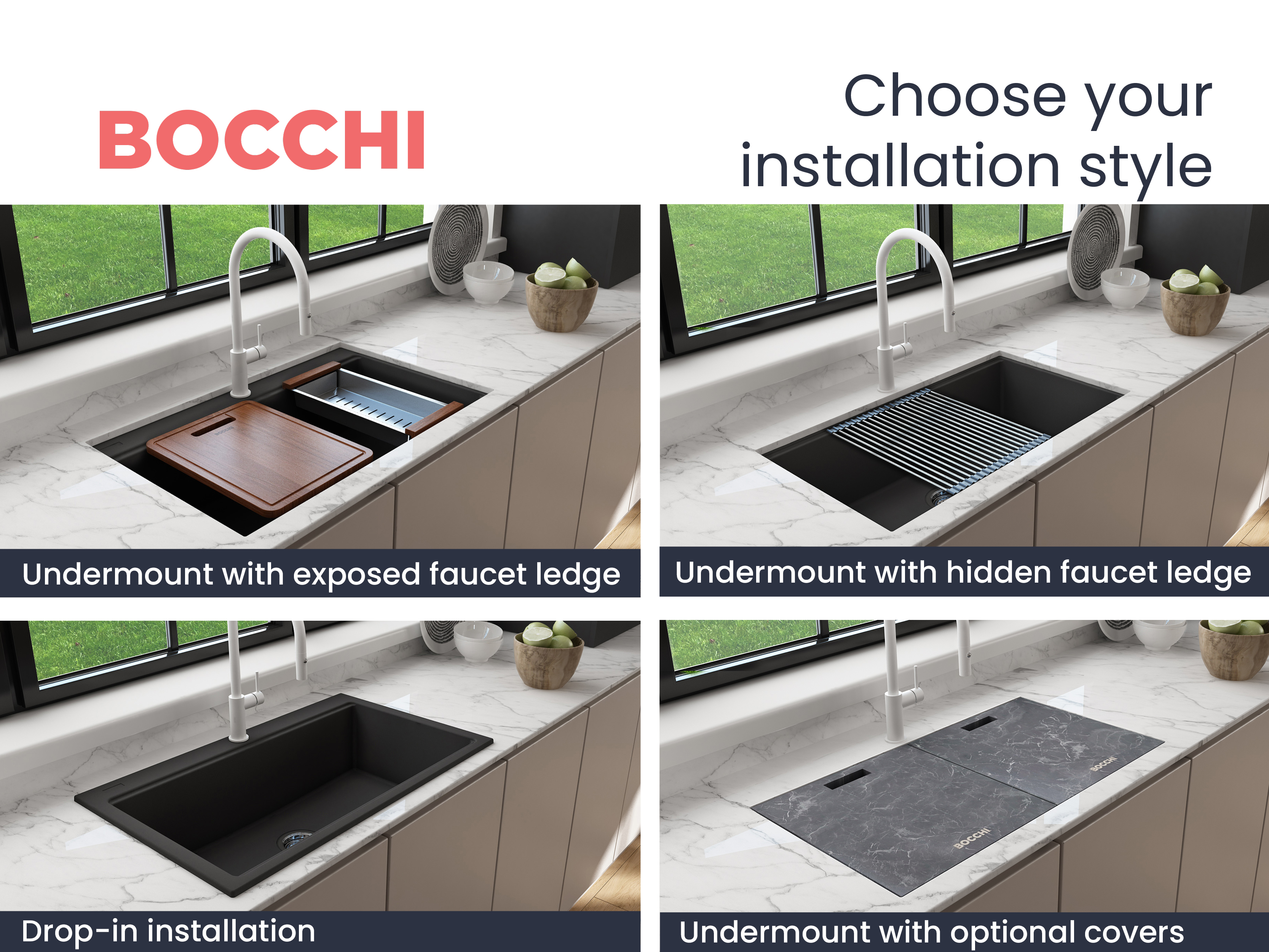 BOCCHI Granite Sinks bring a timeless, durable and all-natural material to your home with all the latest in technology and style. Crafted in Italy, BOCCHI Granite Sinks are anti-bacterial, odor neutralizing, impact and scratch proof and won’t discolor due to sun while resisting stains and other buildup. Unique installation options allow homeowners to choose their style and personalize their homes.