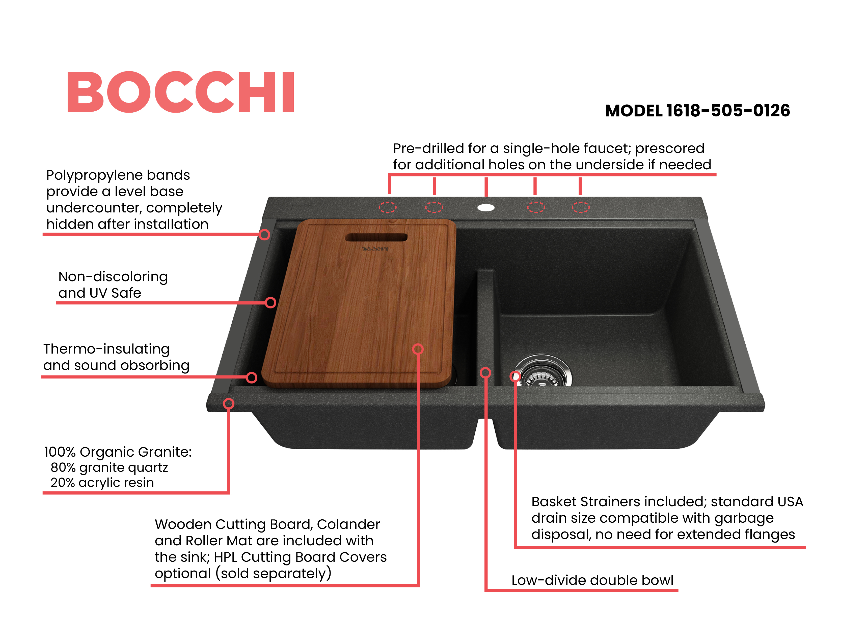 BOCCHI Granite Sinks bring a timeless, durable and all-natural material to your home with all the latest in technology and style. Crafted in Italy, BOCCHI Granite Sinks are anti-bacterial, odor neutralizing, impact and scratch proof and won’t discolor due to sun while resisting stains and other buildup. Unique installation options allow homeowners to choose their style and personalize their homes.