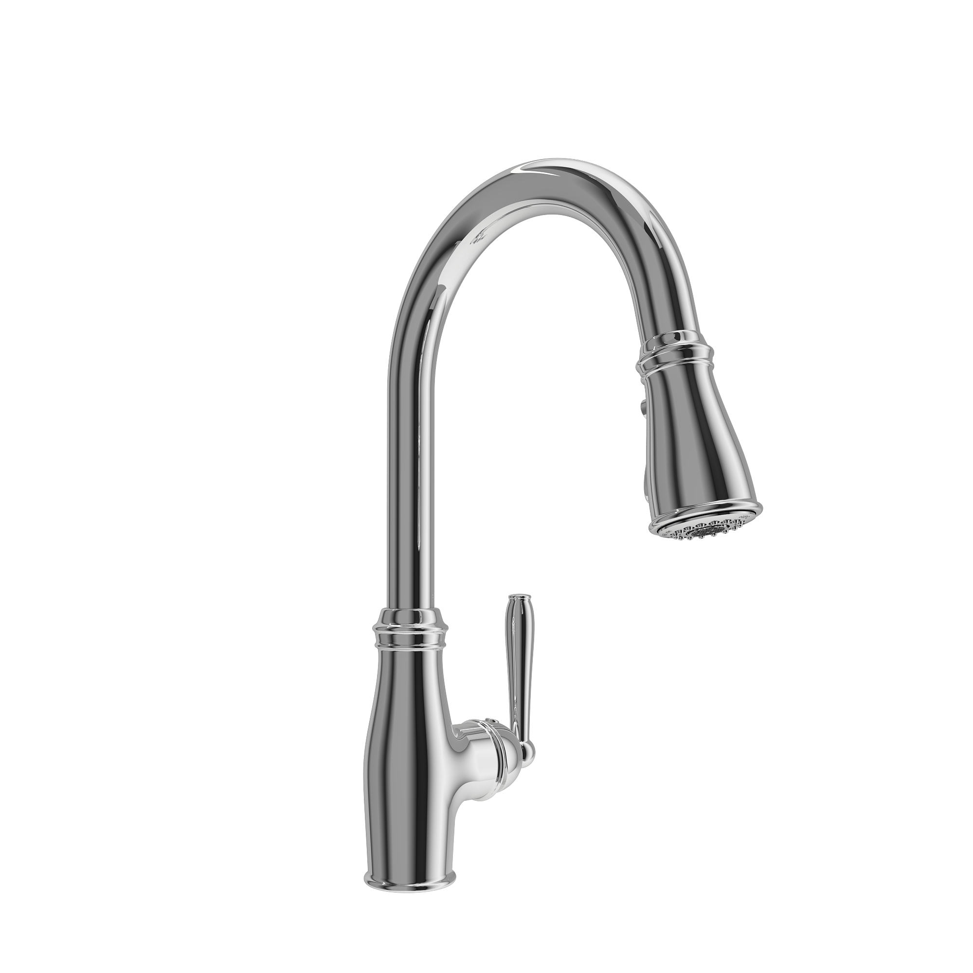 Pull-down kitchen faucet with ceramic cartridge and brass body. Features standard or needle spray with weighted shower hose and boost feature.