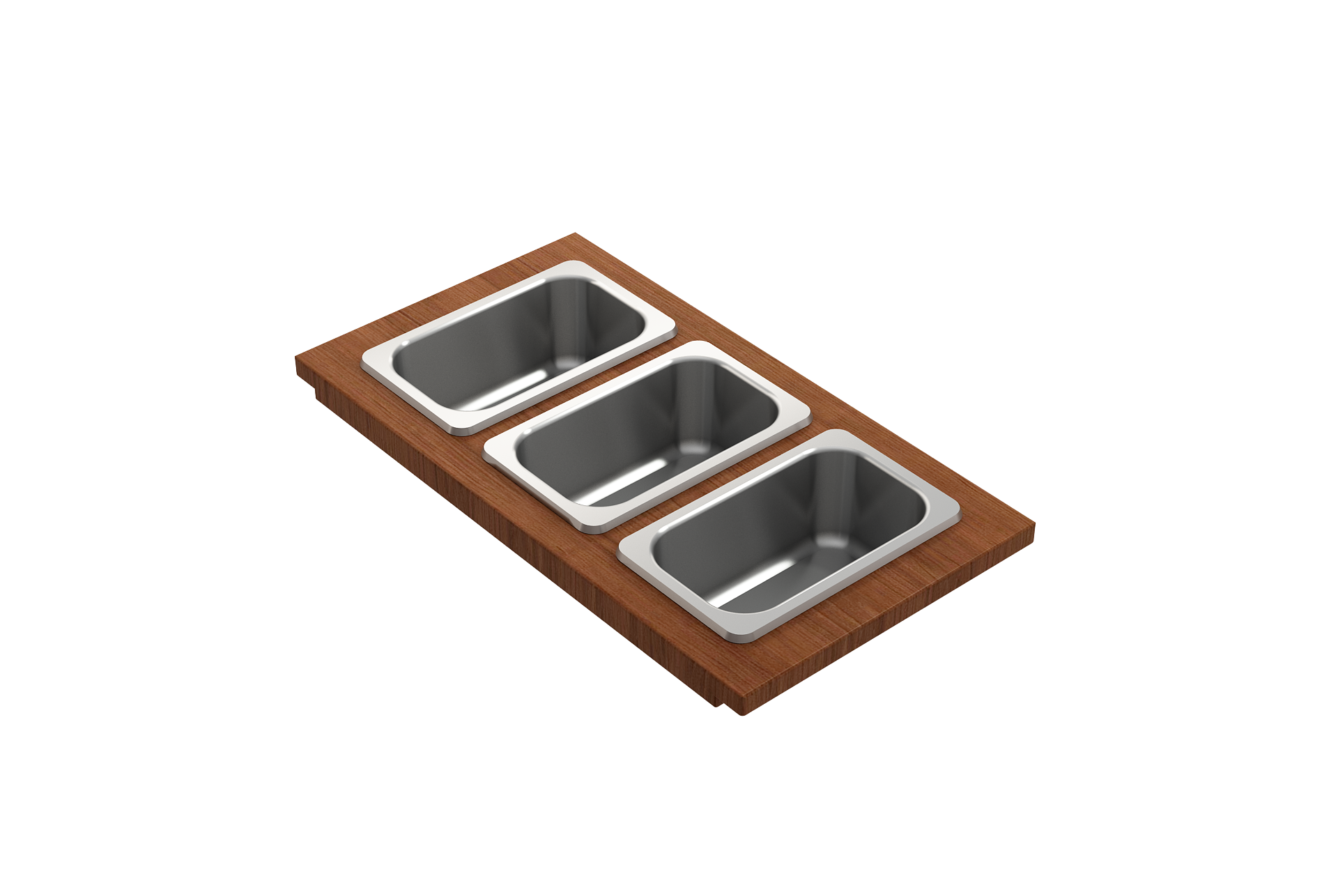 Sapele Wood Board with 3 Rectangular Stainless Steel Bowls for food prep, entertaining and serving appetizers