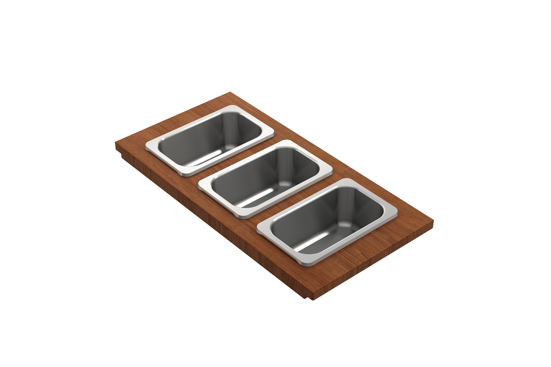 Sapele Wood Board with 3 Rectangular Stainless Steel Bowls for food prep, entertaining and serving appetizers