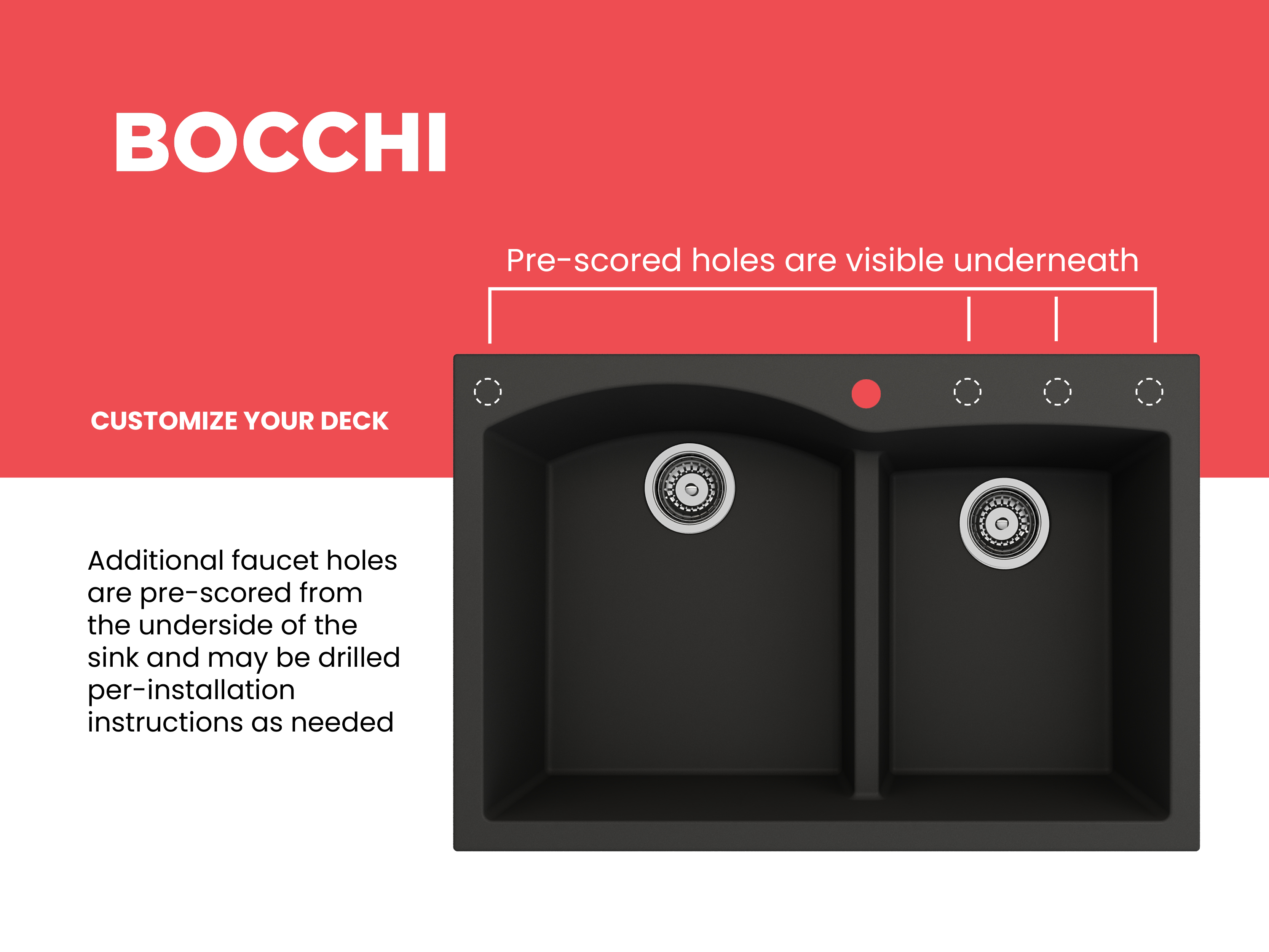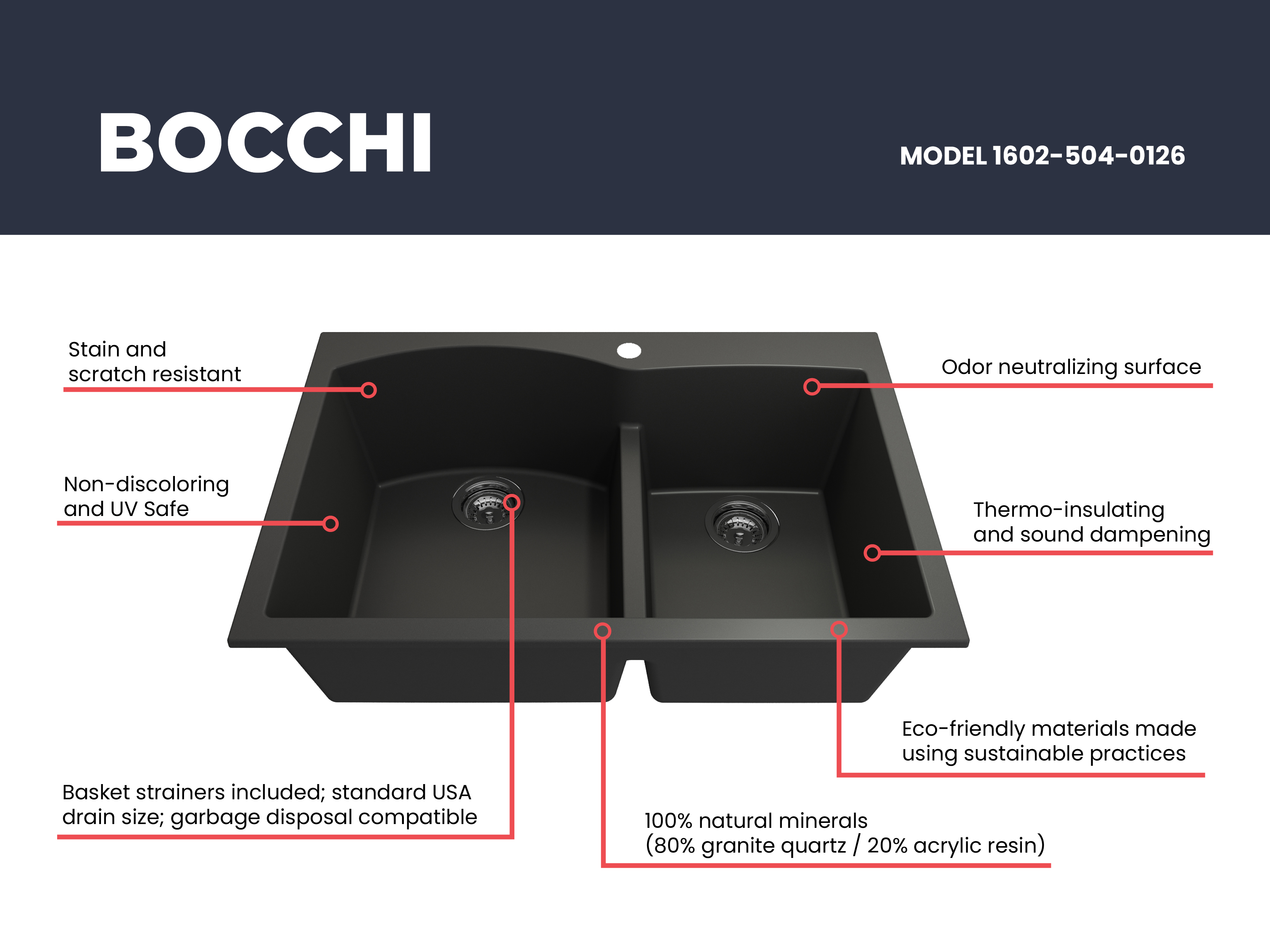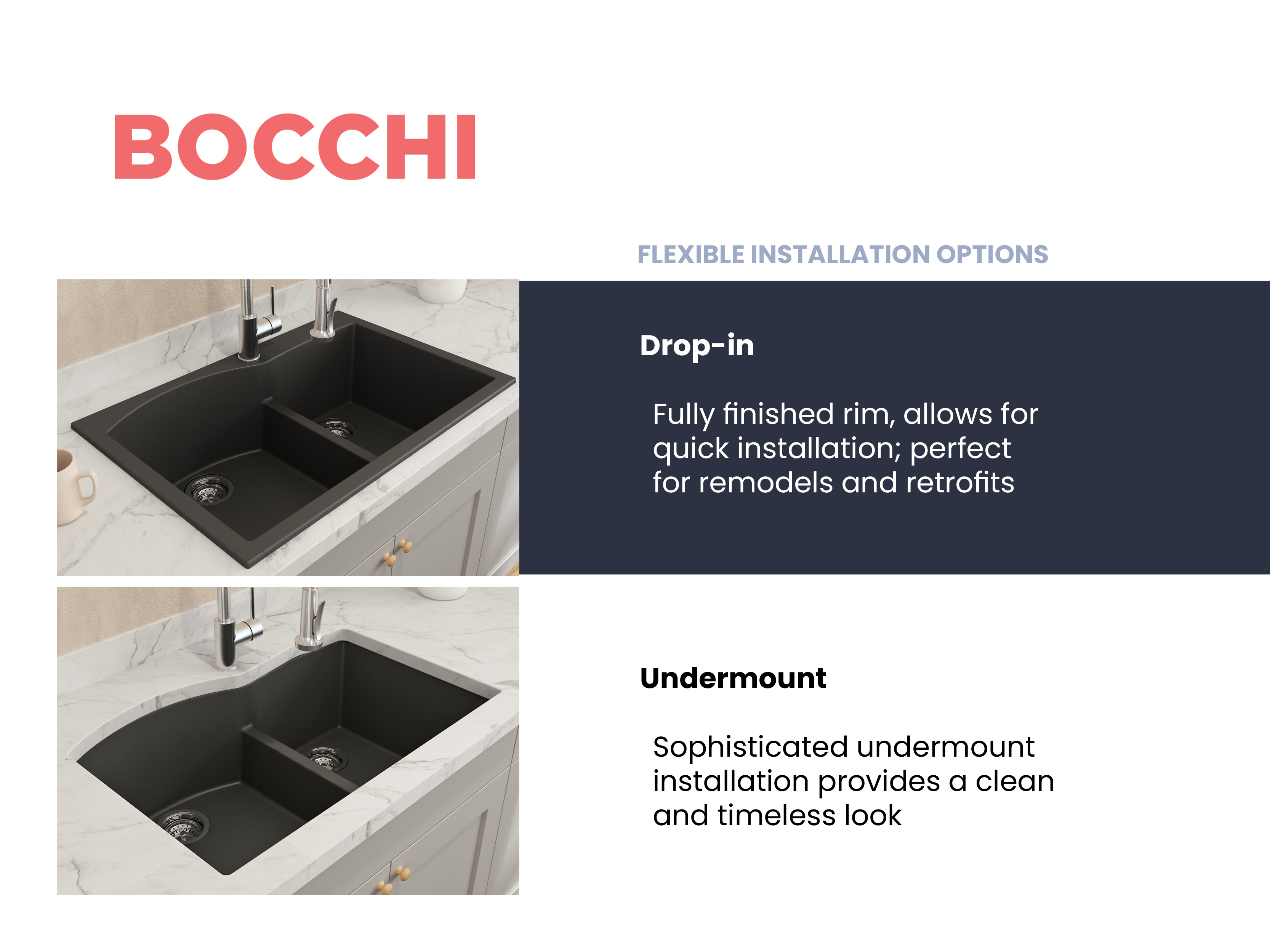 BOCCHI Granite Sinks bring a timeless, durable and all-natural material to your home with all the latest in technology and style. Crafted in Italy, BOCCHI Granite Sinks are anti-bacterial, odor neutralizing, impact and scratch proof and won’t discolor due to sun while resisting stains and other buildup. Unique installation options allow homeowners to choose their style and personalize their homes.