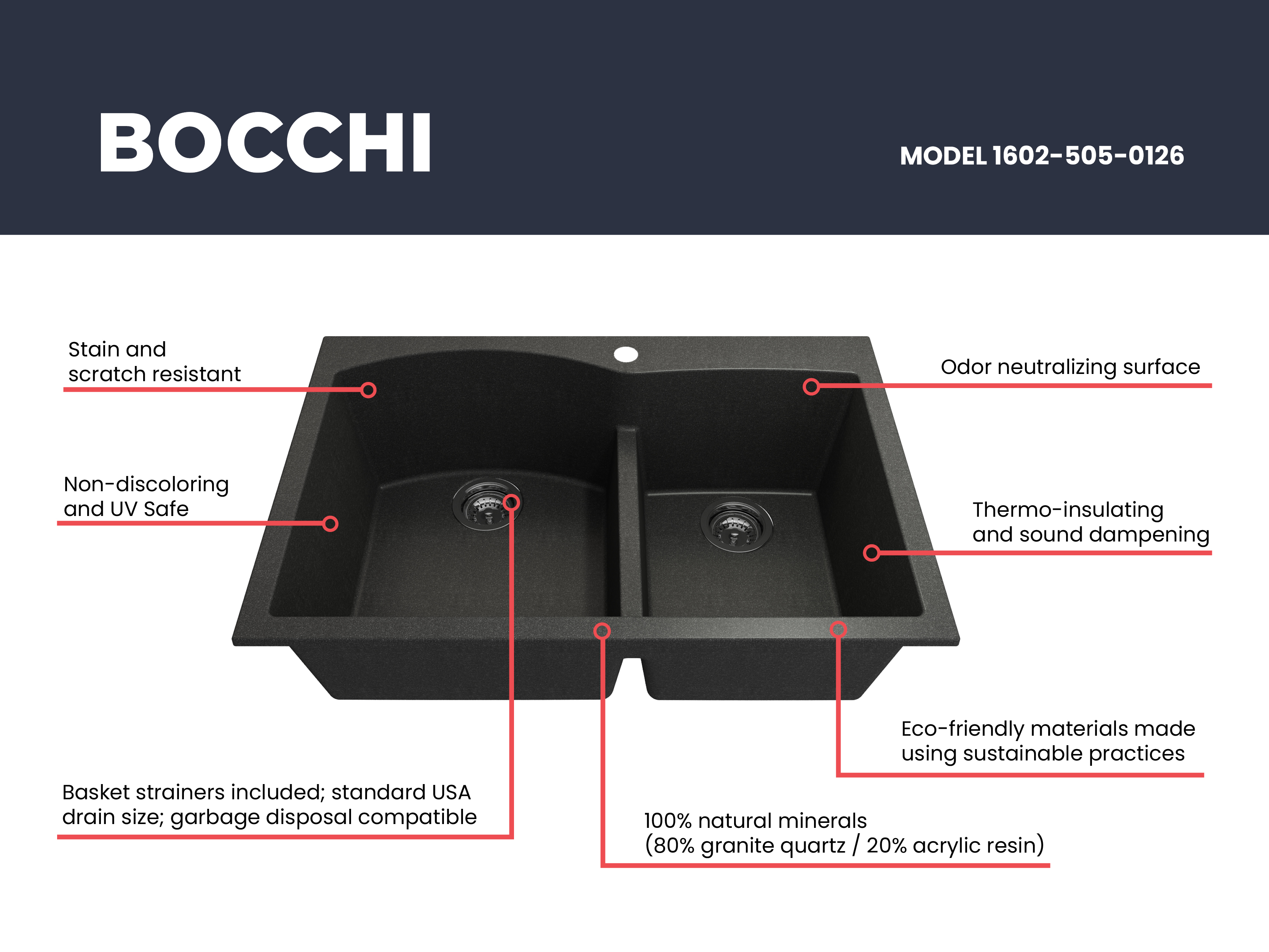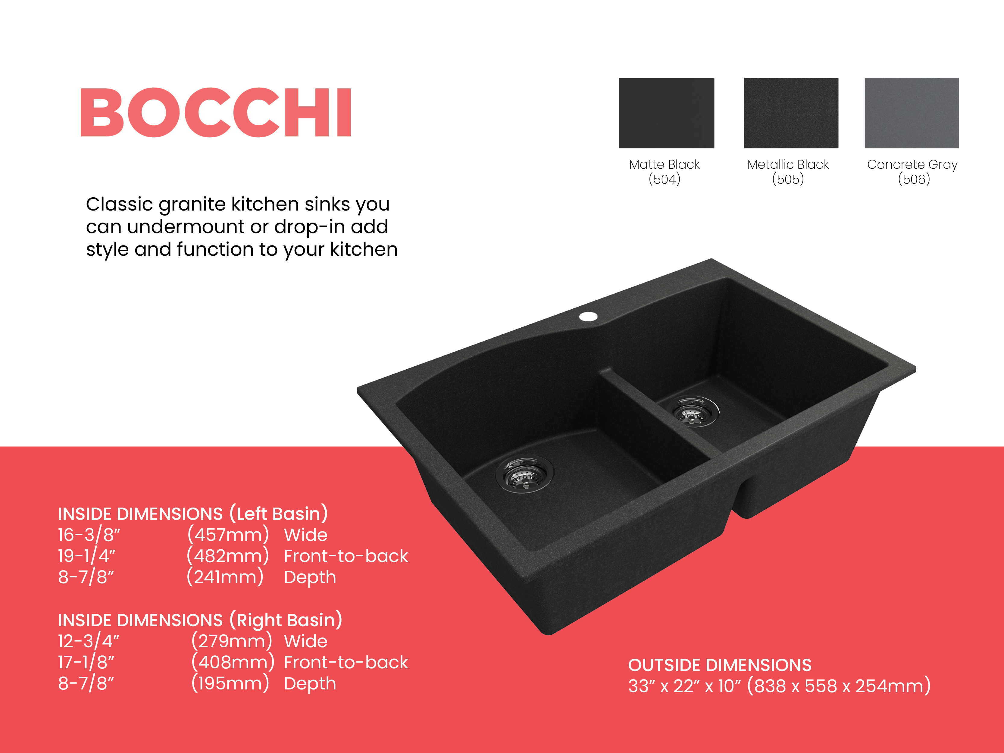BOCCHI Granite Sinks bring a timeless, durable and all-natural material to your home with all the latest in technology and style. Crafted in Italy, BOCCHI Granite Sinks are anti-bacterial, odor neutralizing, impact and scratch proof and won’t discolor due to sun while resisting stains and other buildup. Unique installation options allow homeowners to choose their style and personalize their homes.