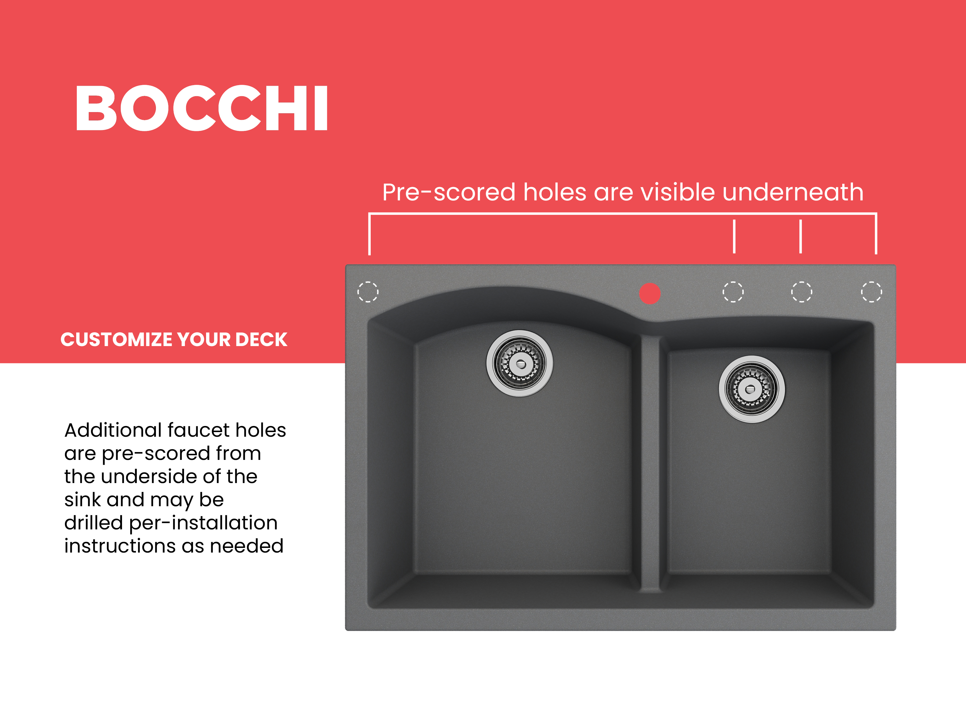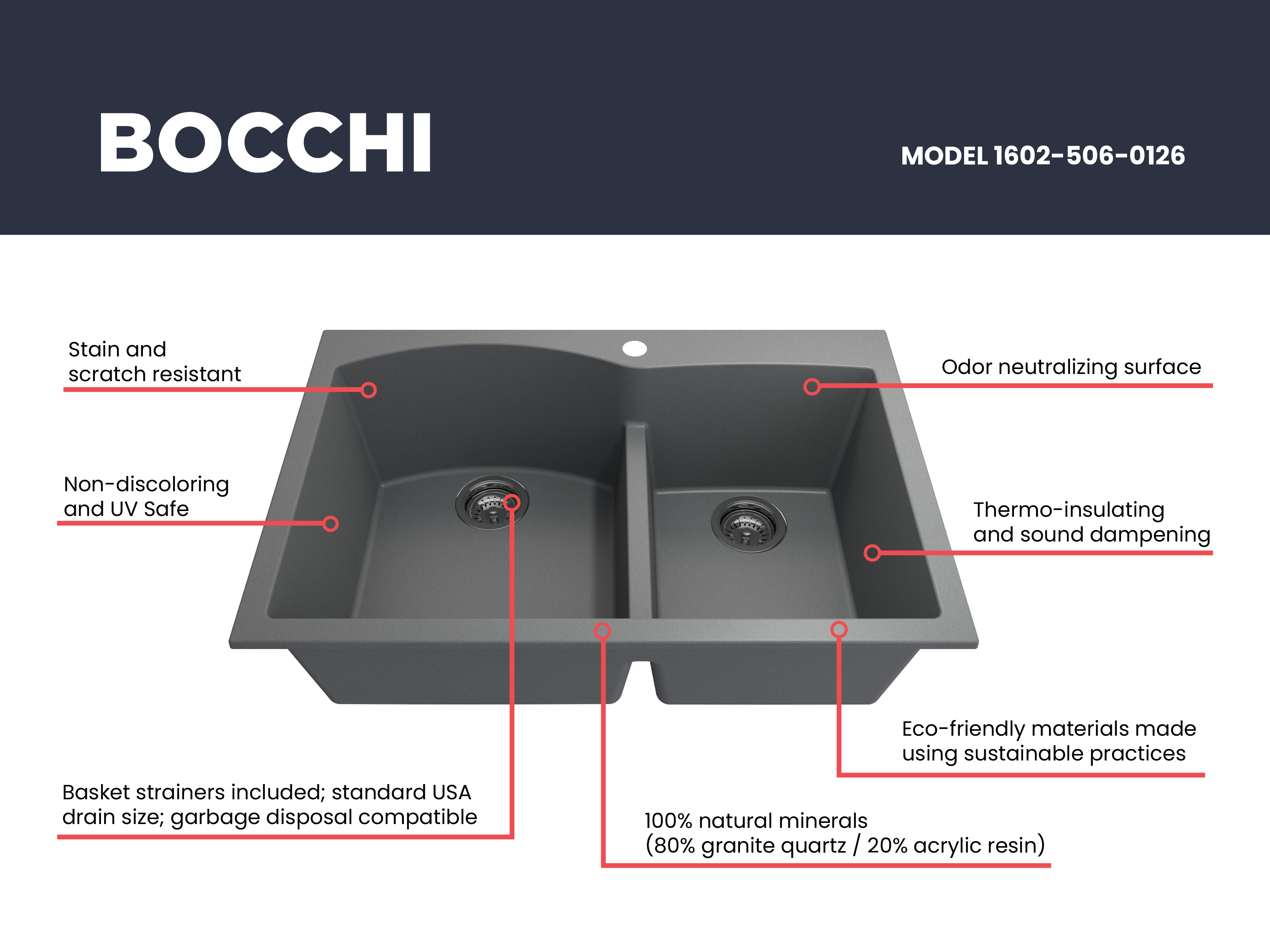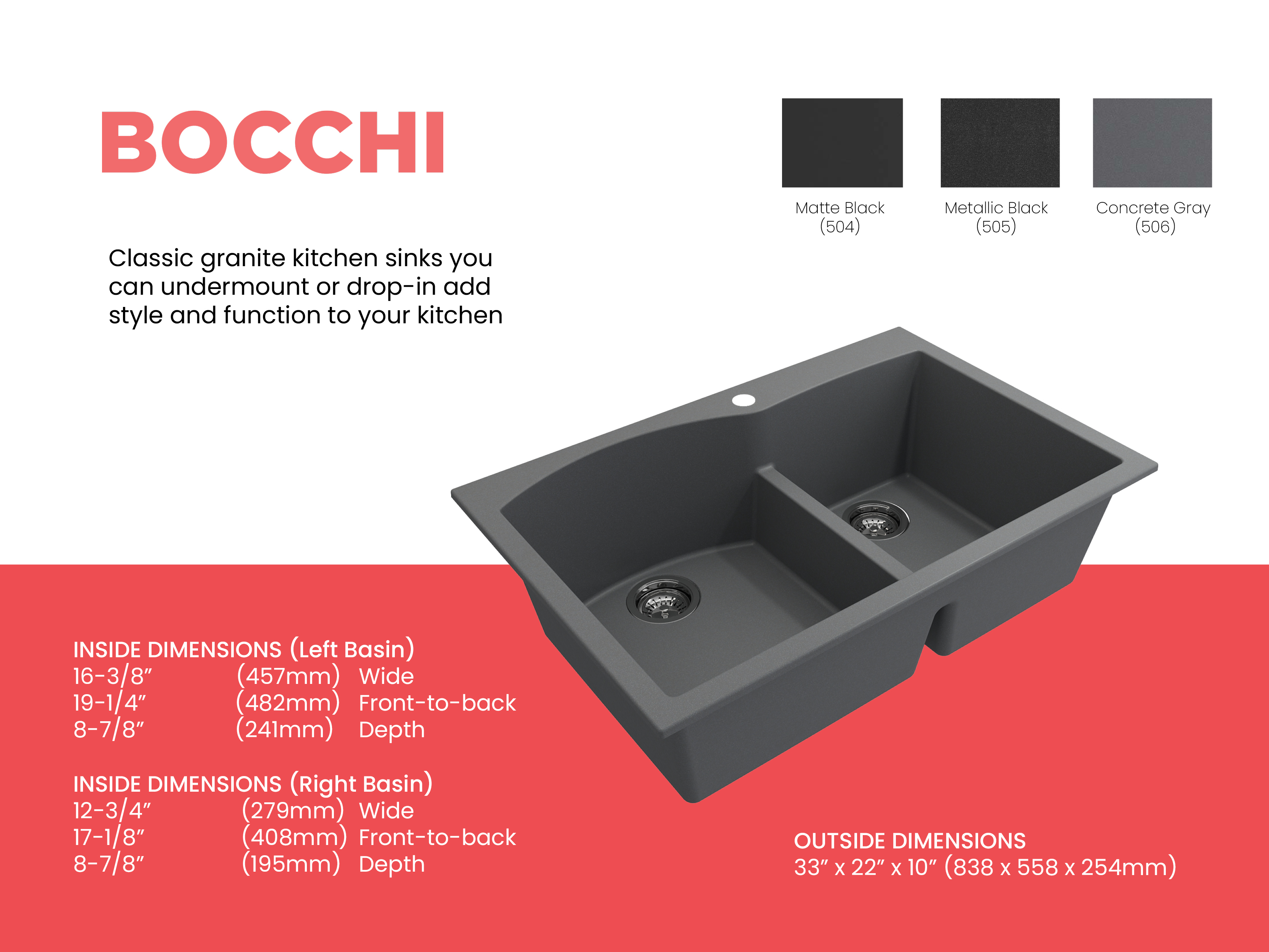 BOCCHI Granite Sinks bring a timeless, durable and all-natural material to your home with all the latest in technology and style. Crafted in Italy, BOCCHI Granite Sinks are anti-bacterial, odor neutralizing, impact and scratch proof and won’t discolor due to sun while resisting stains and other buildup. Unique installation options allow homeowners to choose their style and personalize their homes.