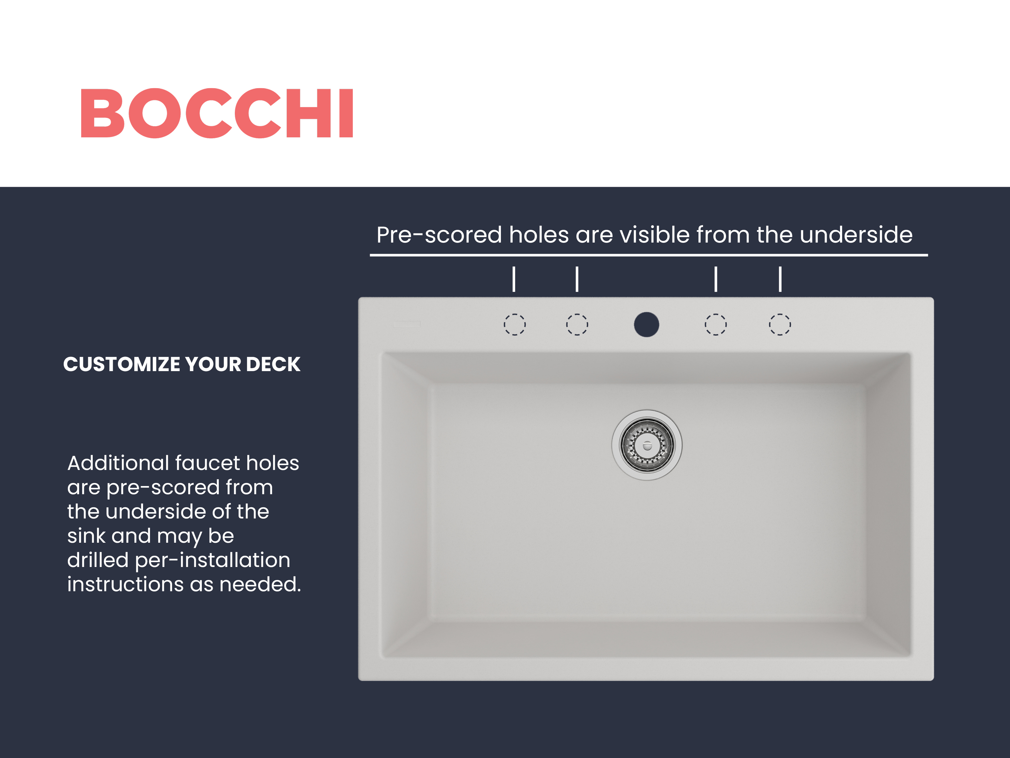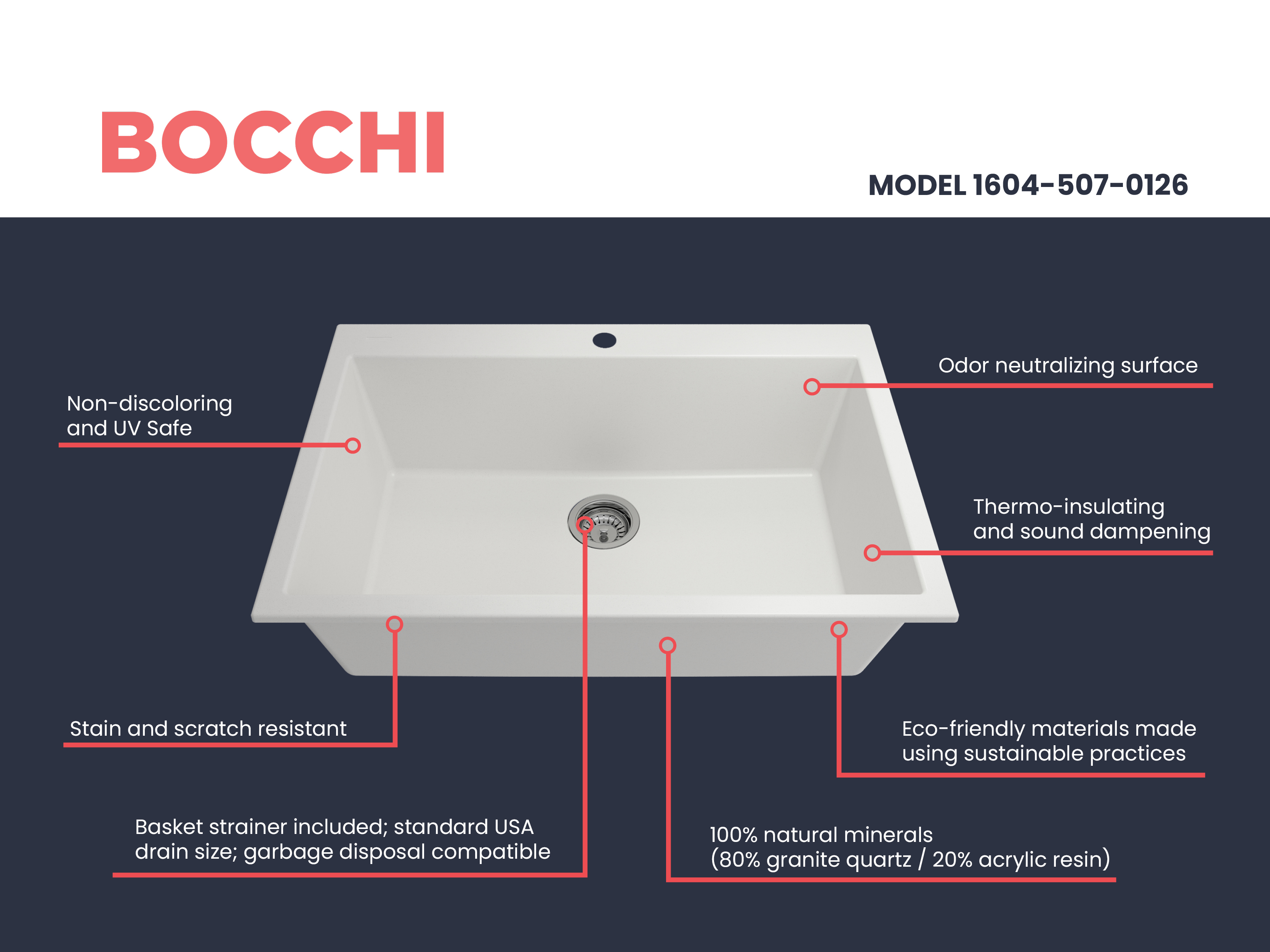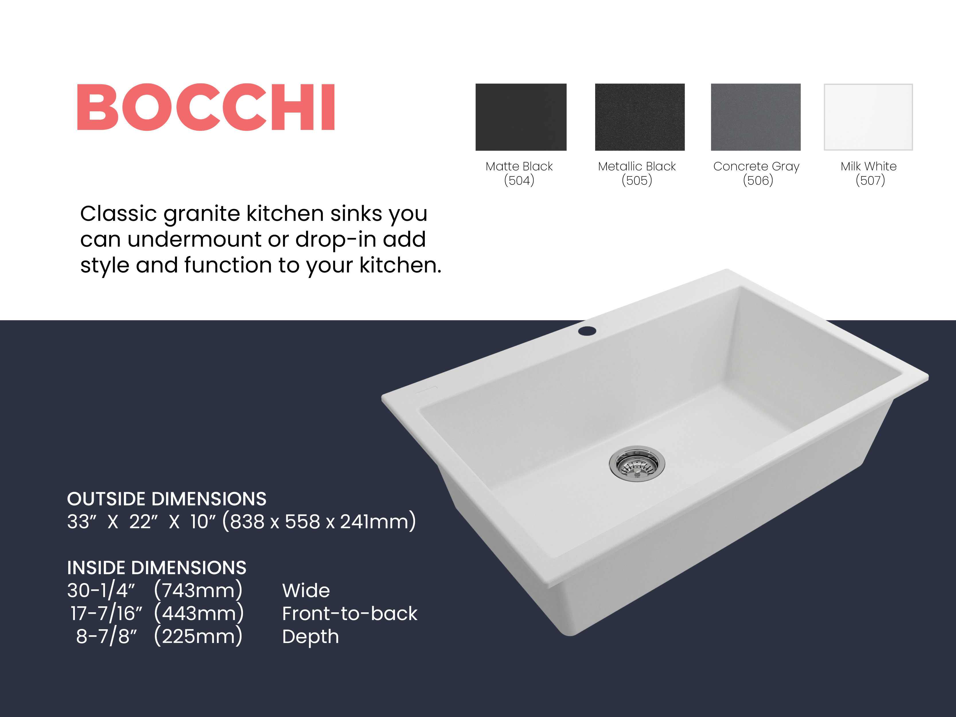 BOCCHI Granite Sinks bring a timeless, durable and all-natural material to your home with all the latest in technology and style. Crafted in Italy, BOCCHI Granite Sinks are anti-bacterial, odor neutralizing, impact and scratch proof and won’t discolor due to sun while resisting stains and other buildup. Unique installation options allow homeowners to choose their style and personalize their homes.