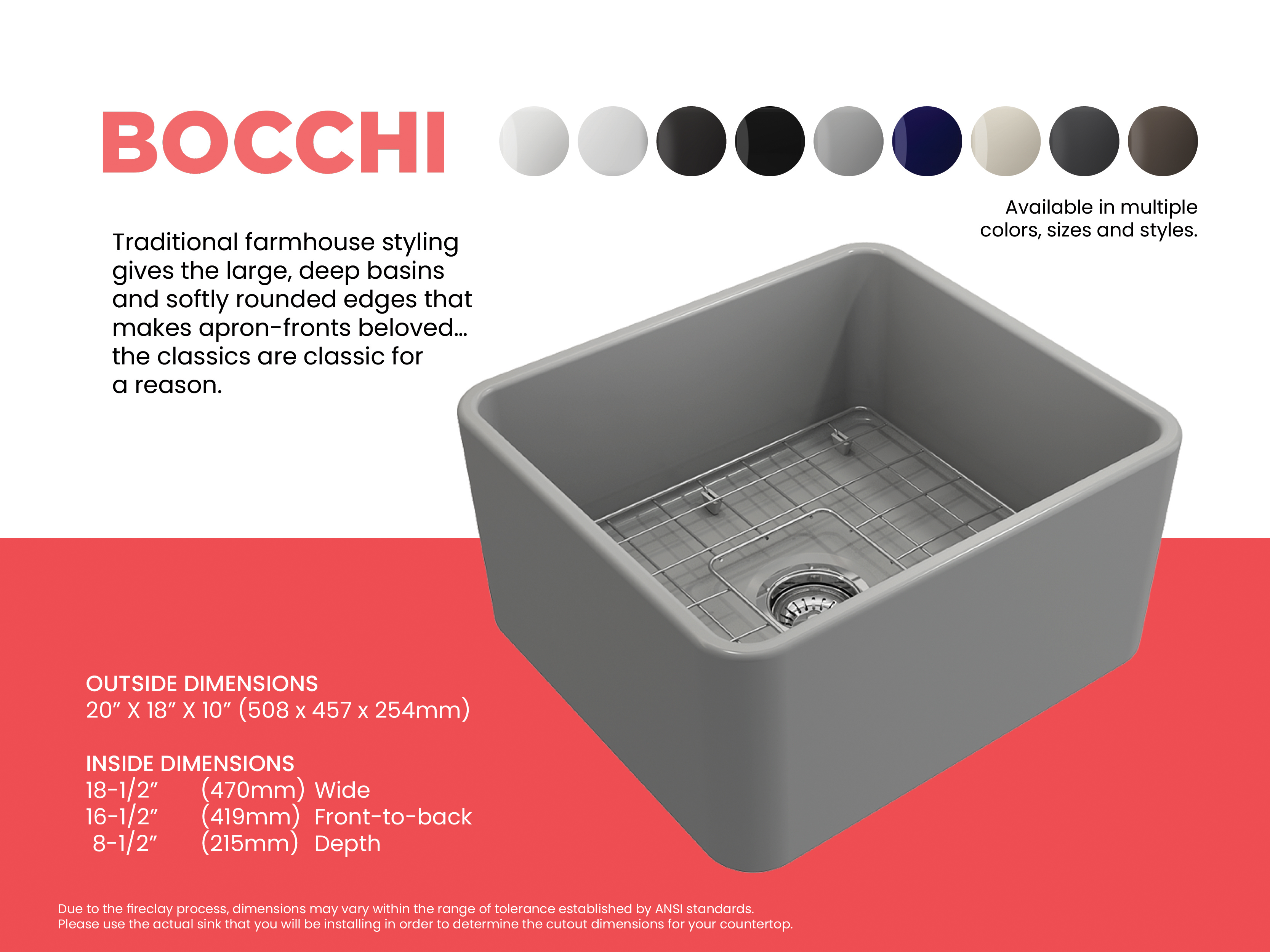 BOCCHI Farmhouse Sinks bring back the ultimate material to your kitchen. Fireclay, a 100% natural organic and recyclable material used by craftsman for centuries to create timeless appliances has now returned to your kitchen. With the firing in our kilns up to 2000°F temperatures, Fireclay becomes the most durable material used in today's kitchens. Thus, dealing with extreme heat coming from pots and pans is definitely not a problem. Due to their special glaze coating fused with the fireclay body, our sinks have a non-porous, uniform, scratch and stain resistant surface. With its protective bottom grid and distinctive looks, BOCCHI Farmhouse Sinks are truly crafted to match your design and functional desires.