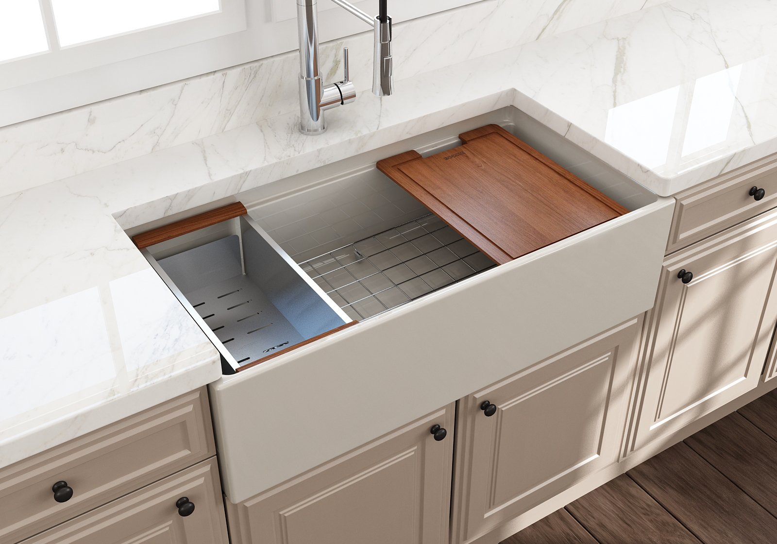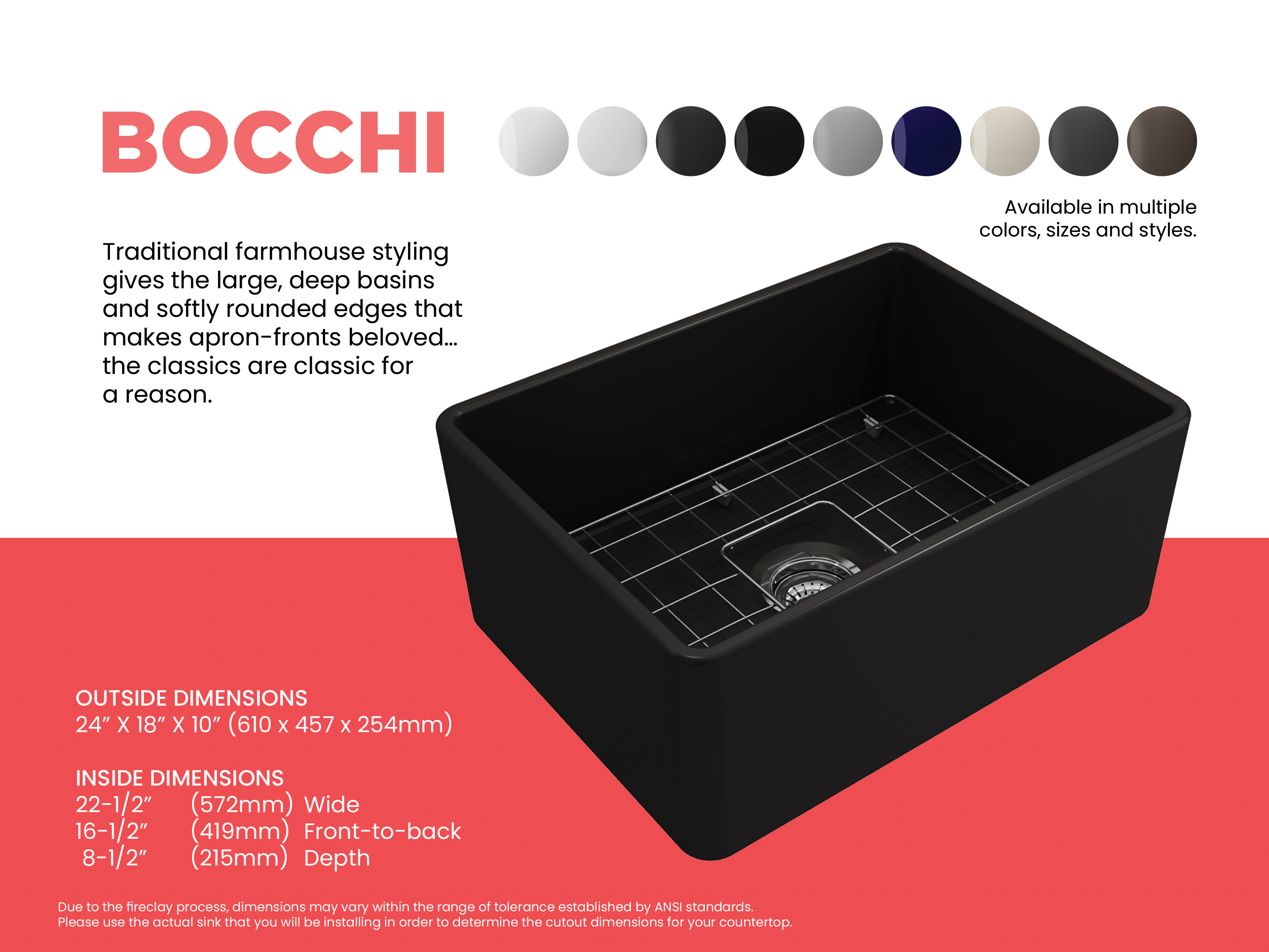 BOCCHI Farmhouse Sinks bring back the ultimate material to your kitchen. Fireclay, a 100% natural organic and recyclable material used by craftsman for centuries to create timeless appliances has now returned to your kitchen. With the firing in our kilns up to 2000°F temperatures, Fireclay becomes the most durable material used in today's kitchens. Thus, dealing with extreme heat coming from pots and pans is definitely not a problem. Due to their special glaze coating fused with the fireclay body, our sinks have a non-porous, uniform, scratch and stain resistant surface. With its protective bottom grid and distinctive looks, BOCCHI Farmhouse Sinks are truly crafted to match your design and functional desires.