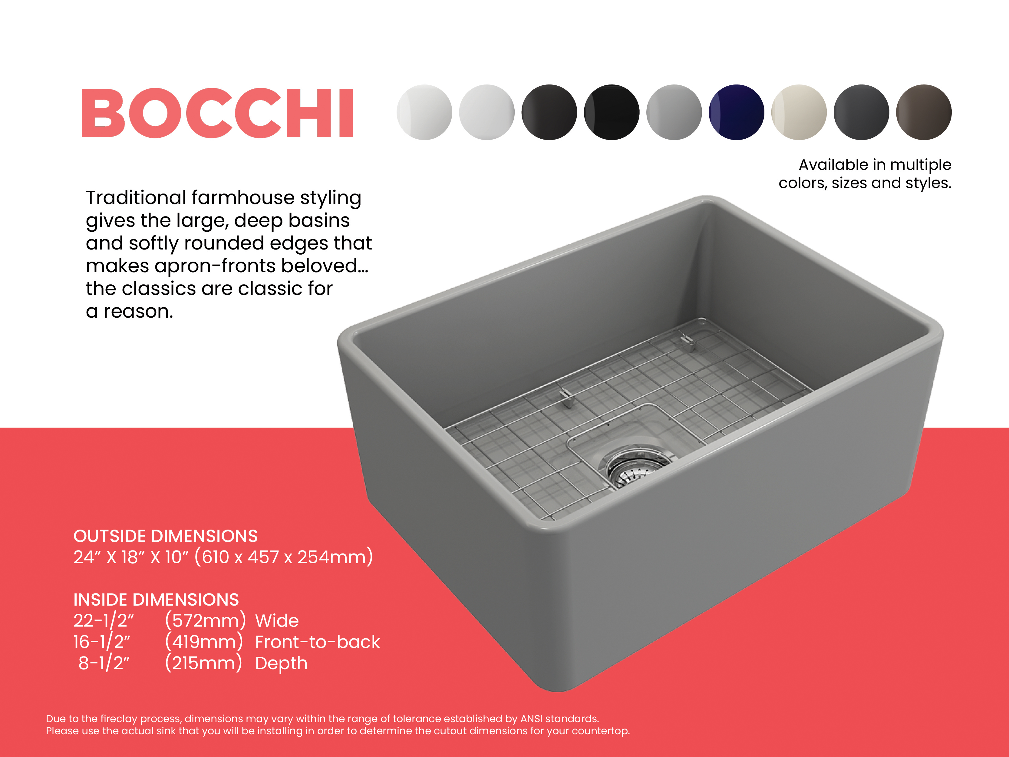 BOCCHI Farmhouse Sinks bring back the ultimate material to your kitchen. Fireclay, a 100% natural organic and recyclable material used by craftsman for centuries to create timeless appliances has now returned to your kitchen. With the firing in our kilns up to 2000°F temperatures, Fireclay becomes the most durable material used in today's kitchens. Thus, dealing with extreme heat coming from pots and pans is definitely not a problem. Due to their special glaze coating fused with the fireclay body, our sinks have a non-porous, uniform, scratch and stain resistant surface. With its protective bottom grid and distinctive looks, BOCCHI Farmhouse Sinks are truly crafted to match your design and functional desires.