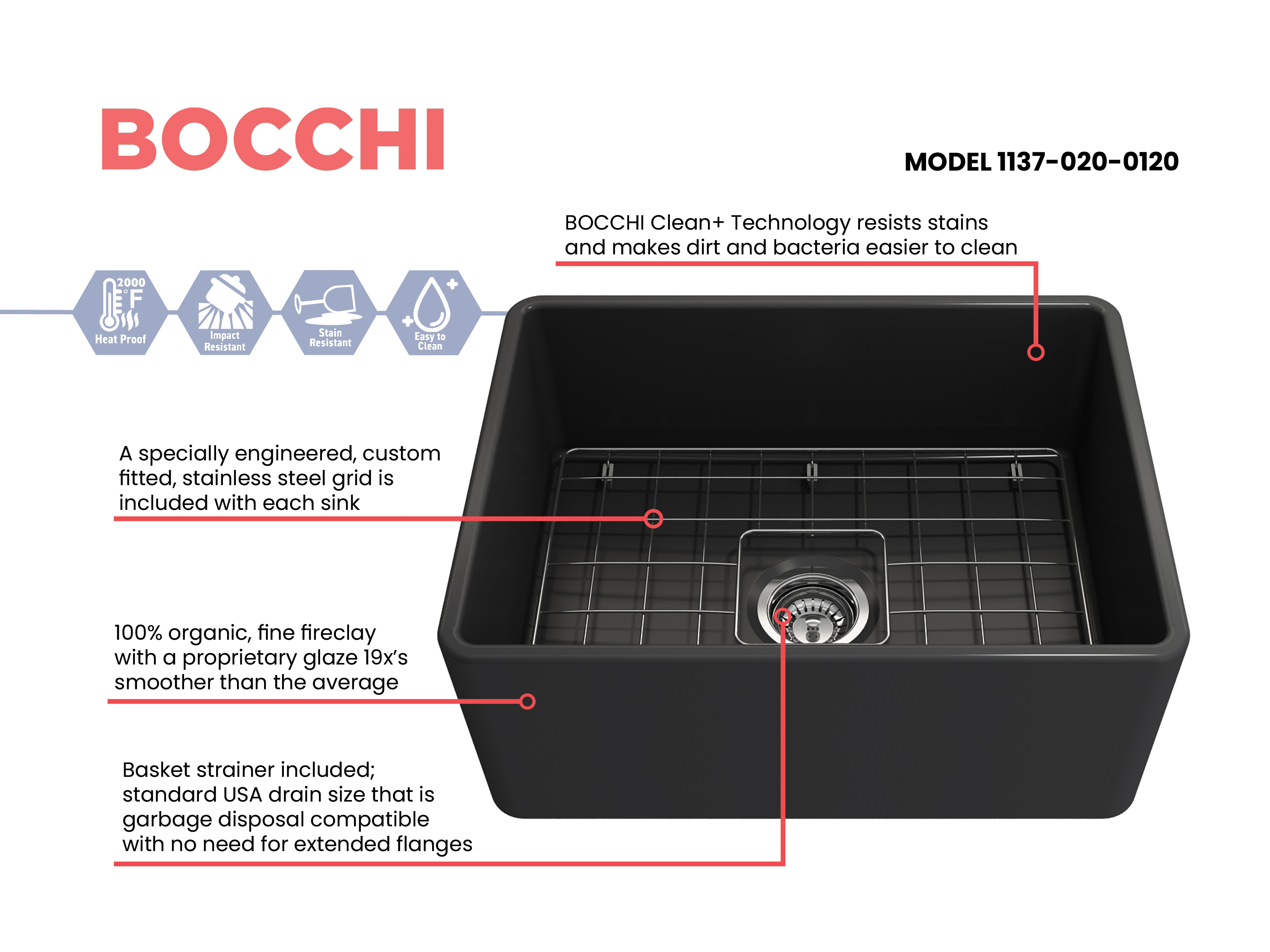 BOCCHI Farmhouse Sinks bring back the ultimate material to your kitchen. Fireclay, a 100% natural organic and recyclable material used by craftsman for centuries to create timeless appliances has now returned to your kitchen. With the firing in our kilns up to 2000°F temperatures, Fireclay becomes the most durable material used in today's kitchens. Thus, dealing with extreme heat coming from pots and pans is definitely not a problem. Due to their special glaze coating fused with the fireclay body, our sinks have a non-porous, uniform, scratch and stain resistant surface. With its protective bottom grid and distinctive looks, BOCCHI Farmhouse Sinks are truly crafted to match your design and functional desires.