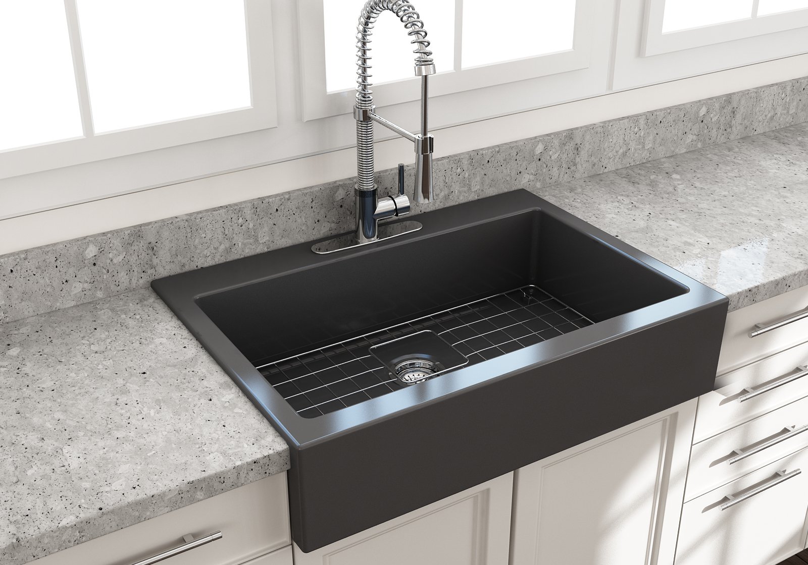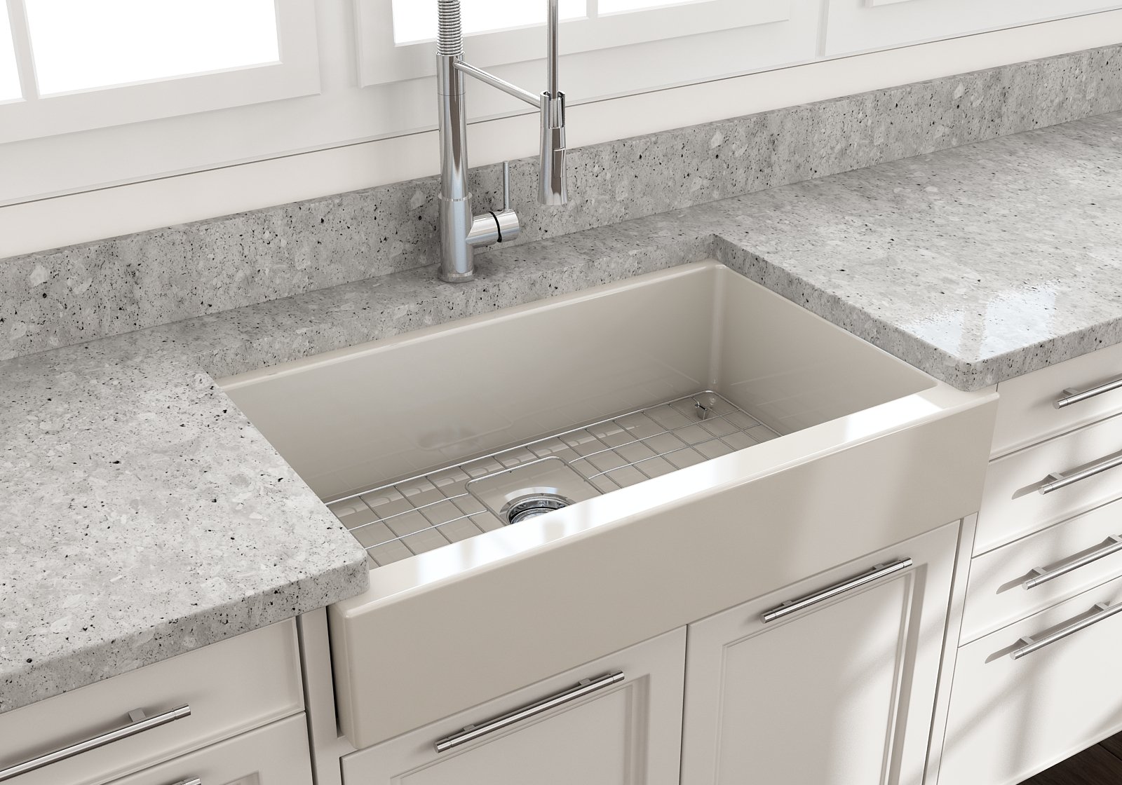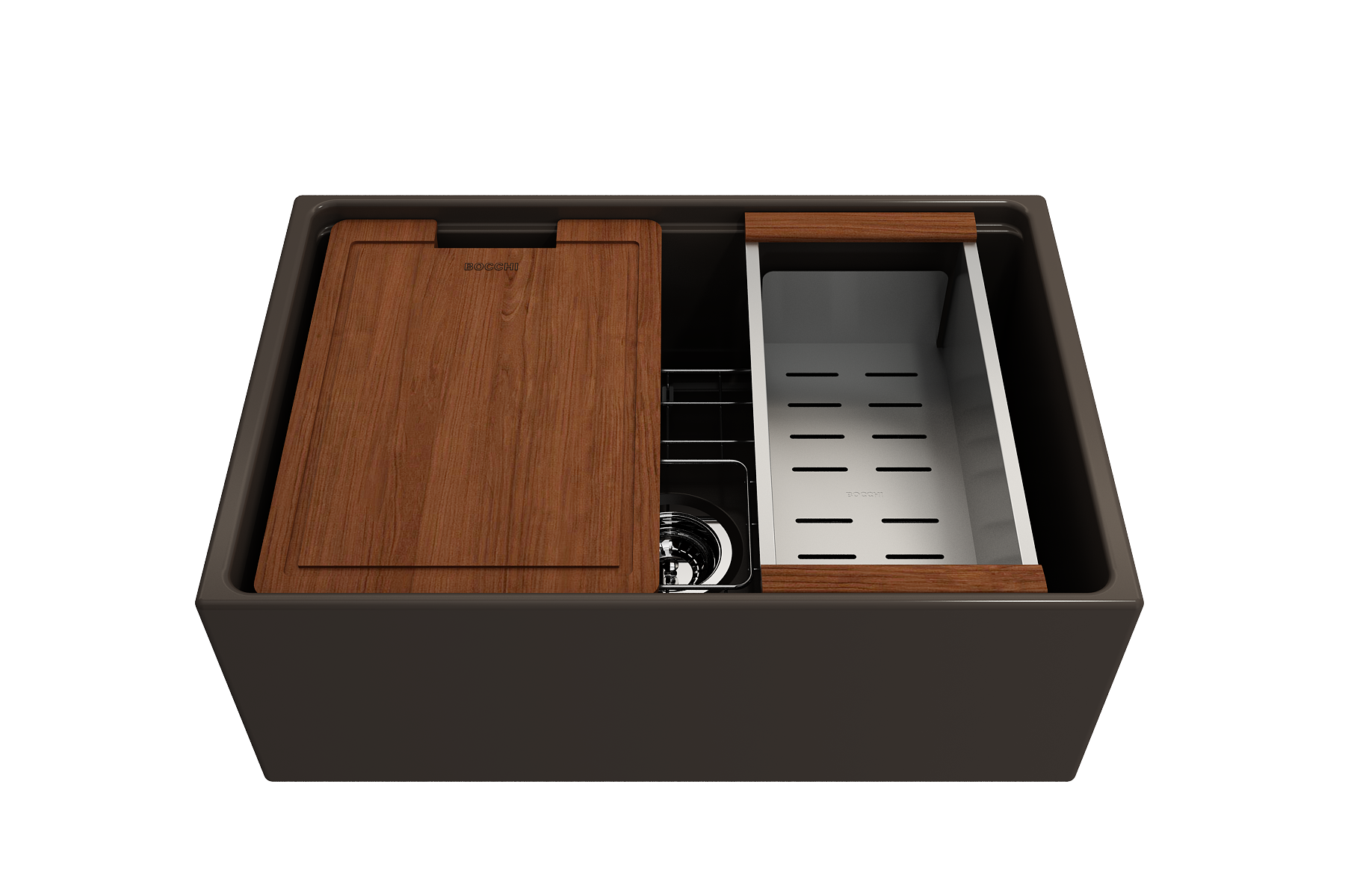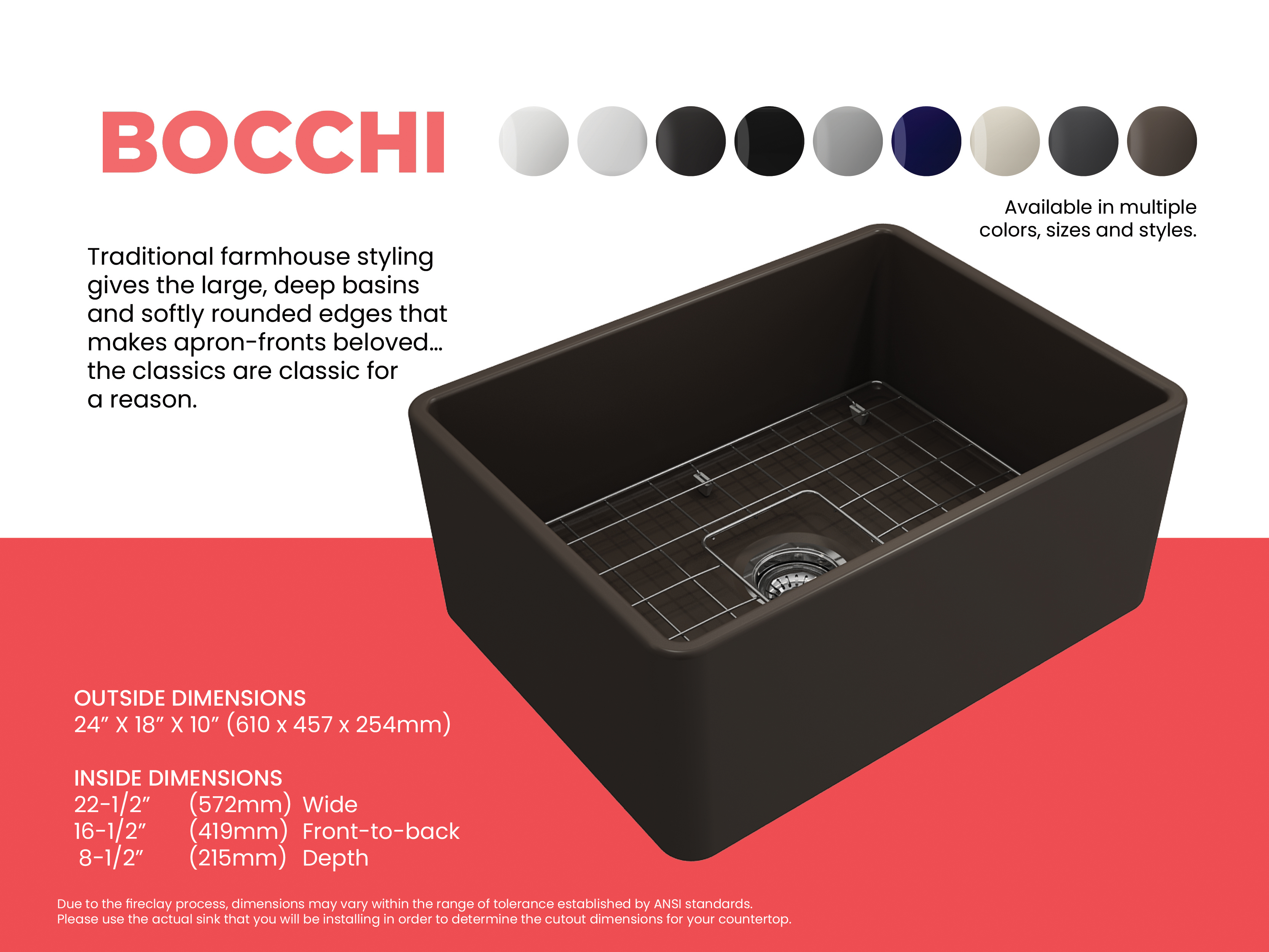 BOCCHI Farmhouse Sinks bring back the ultimate material to your kitchen. Fireclay, a 100% natural organic and recyclable material used by craftsman for centuries to create timeless appliances has now returned to your kitchen. With the firing in our kilns up to 2000°F temperatures, Fireclay becomes the most durable material used in today's kitchens. Thus, dealing with extreme heat coming from pots and pans is definitely not a problem. Due to their special glaze coating fused with the fireclay body, our sinks have a non-porous, uniform, scratch and stain resistant surface. With its protective bottom grid and distinctive looks, BOCCHI Farmhouse Sinks are truly crafted to match your design and functional desires.