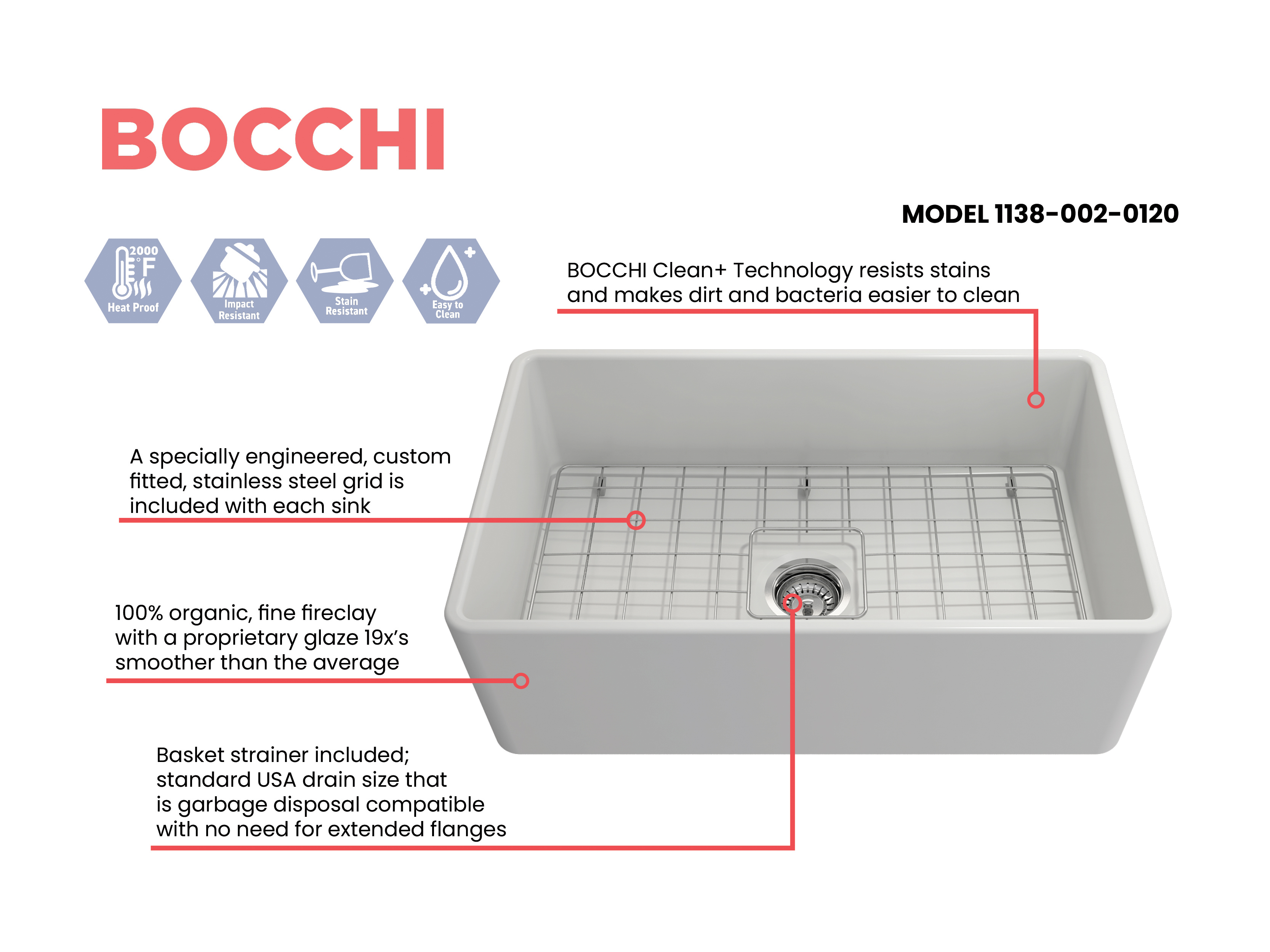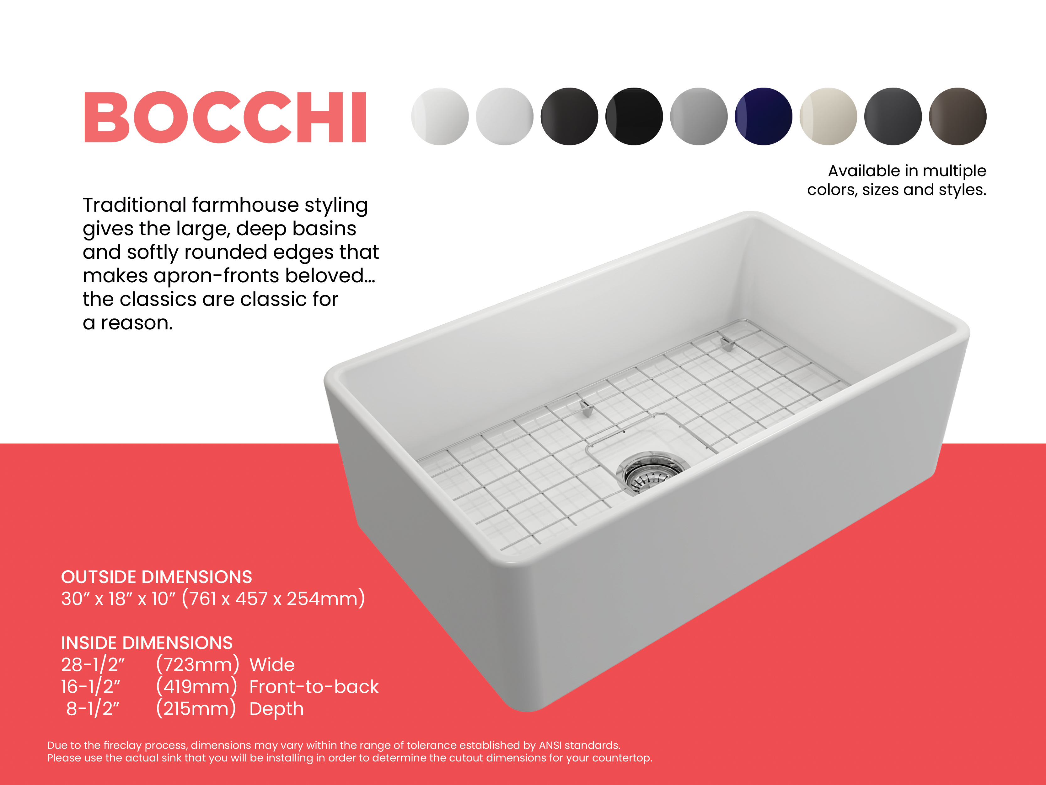 BOCCHI Farmhouse Sinks bring back the ultimate material to your kitchen. Fireclay, a 100% natural organic and recyclable material used by craftsman for centuries to create timeless appliances has now returned to your kitchen. With the firing in our kilns up to 2000°F temperatures, Fireclay becomes the most durable material used in today's kitchens. Thus, dealing with extreme heat coming from pots and pans is definitely not a problem. Due to their special glaze coating fused with the fireclay body, our sinks have a non-porous, uniform, scratch and stain resistant surface. With its protective bottom grid and distinctive looks, BOCCHI Farmhouse Sinks are truly crafted to match your design and functional desires.