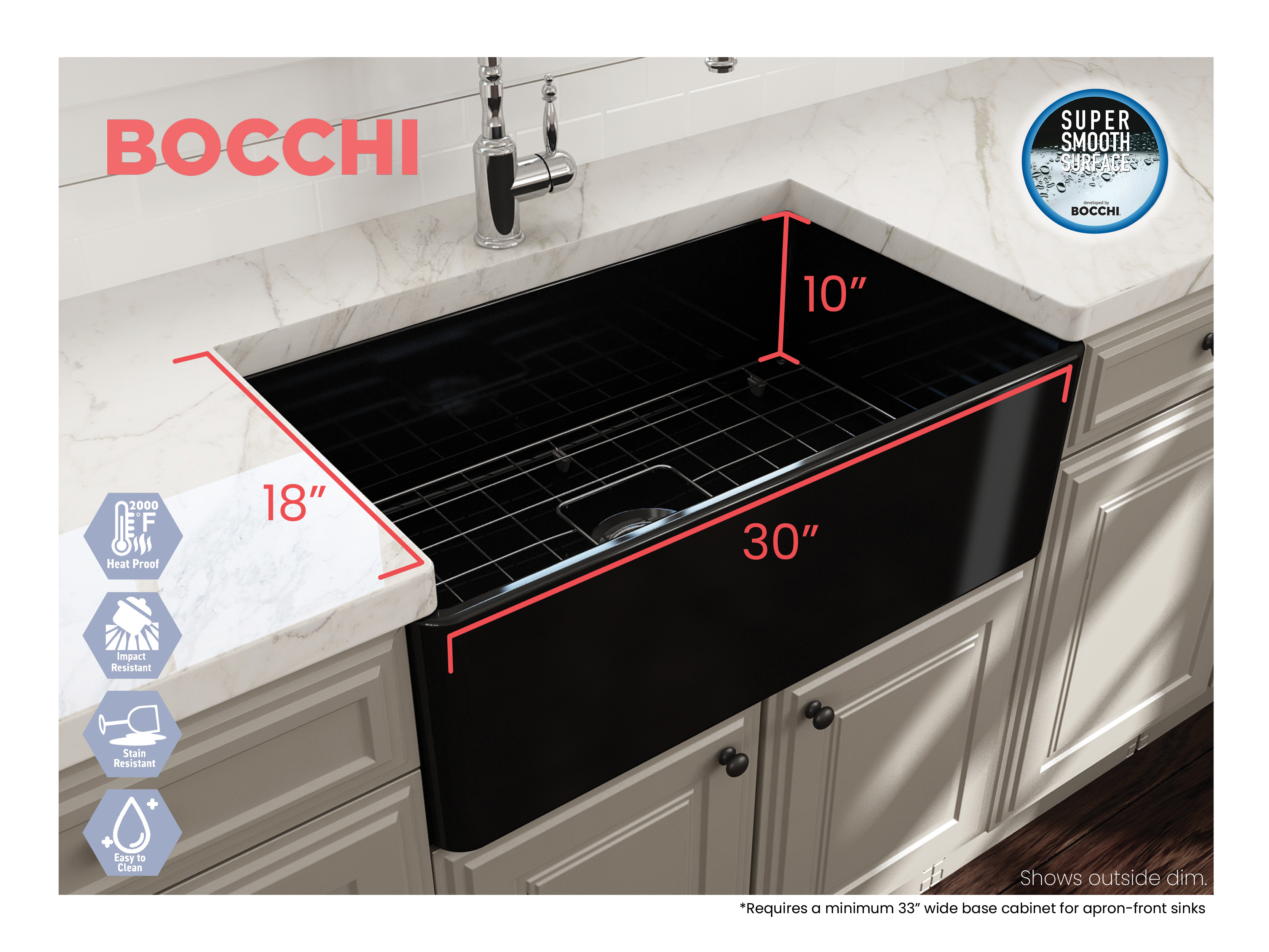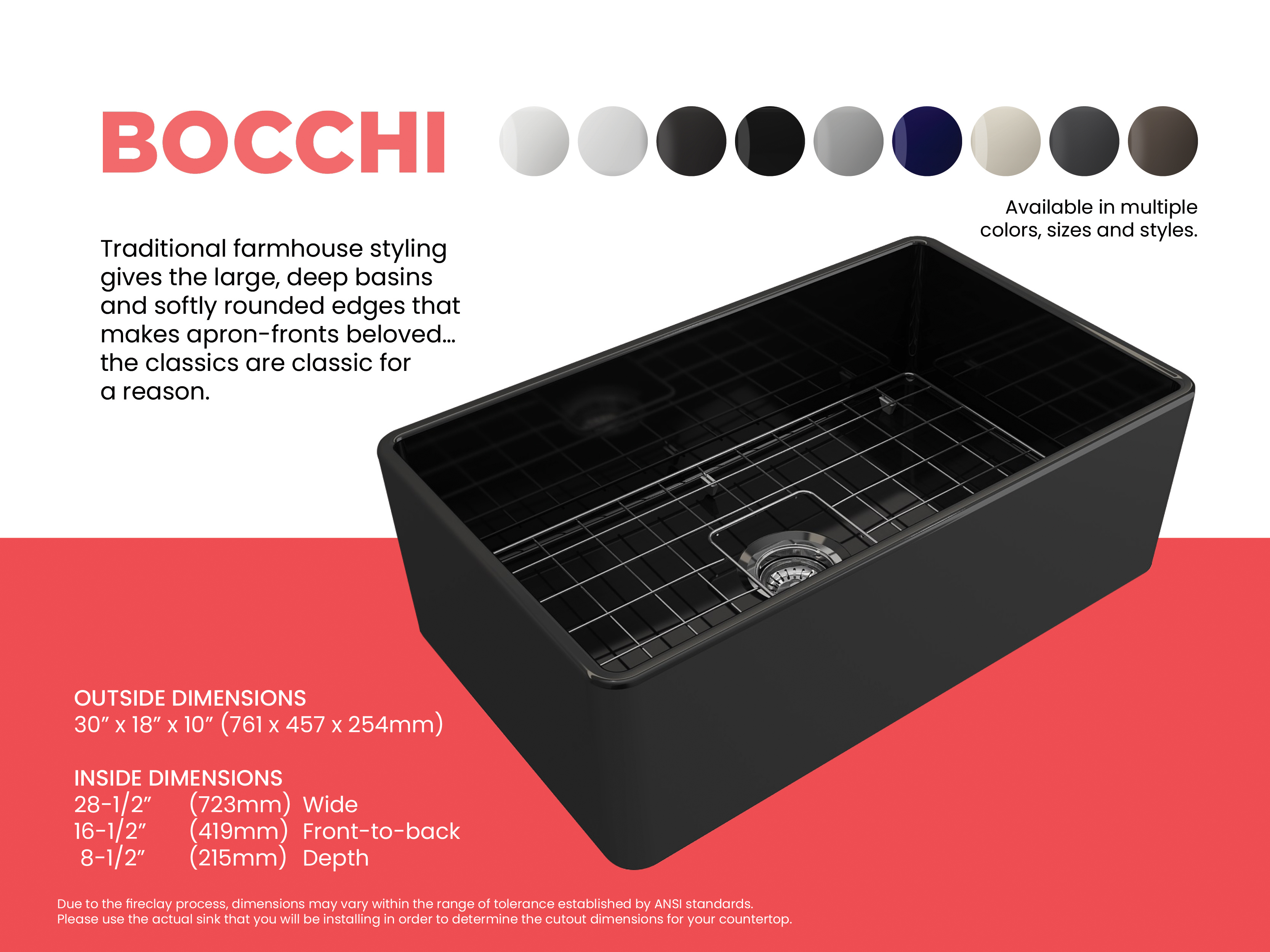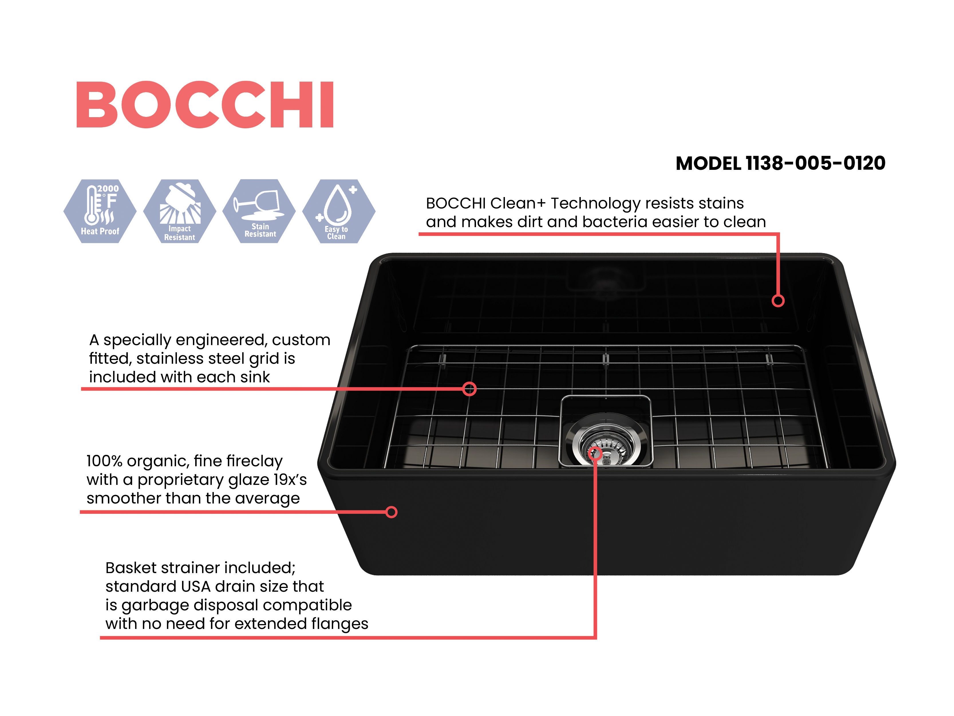 BOCCHI Farmhouse Sinks bring back the ultimate material to your kitchen. Fireclay, a 100% natural organic and recyclable material used by craftsman for centuries to create timeless appliances has now returned to your kitchen. With the firing in our kilns up to 2000°F temperatures, Fireclay becomes the most durable material used in today's kitchens. Thus, dealing with extreme heat coming from pots and pans is definitely not a problem. Due to their special glaze coating fused with the fireclay body, our sinks have a non-porous, uniform, scratch and stain resistant surface. With its protective bottom grid and distinctive looks, BOCCHI Farmhouse Sinks are truly crafted to match your design and functional desires.