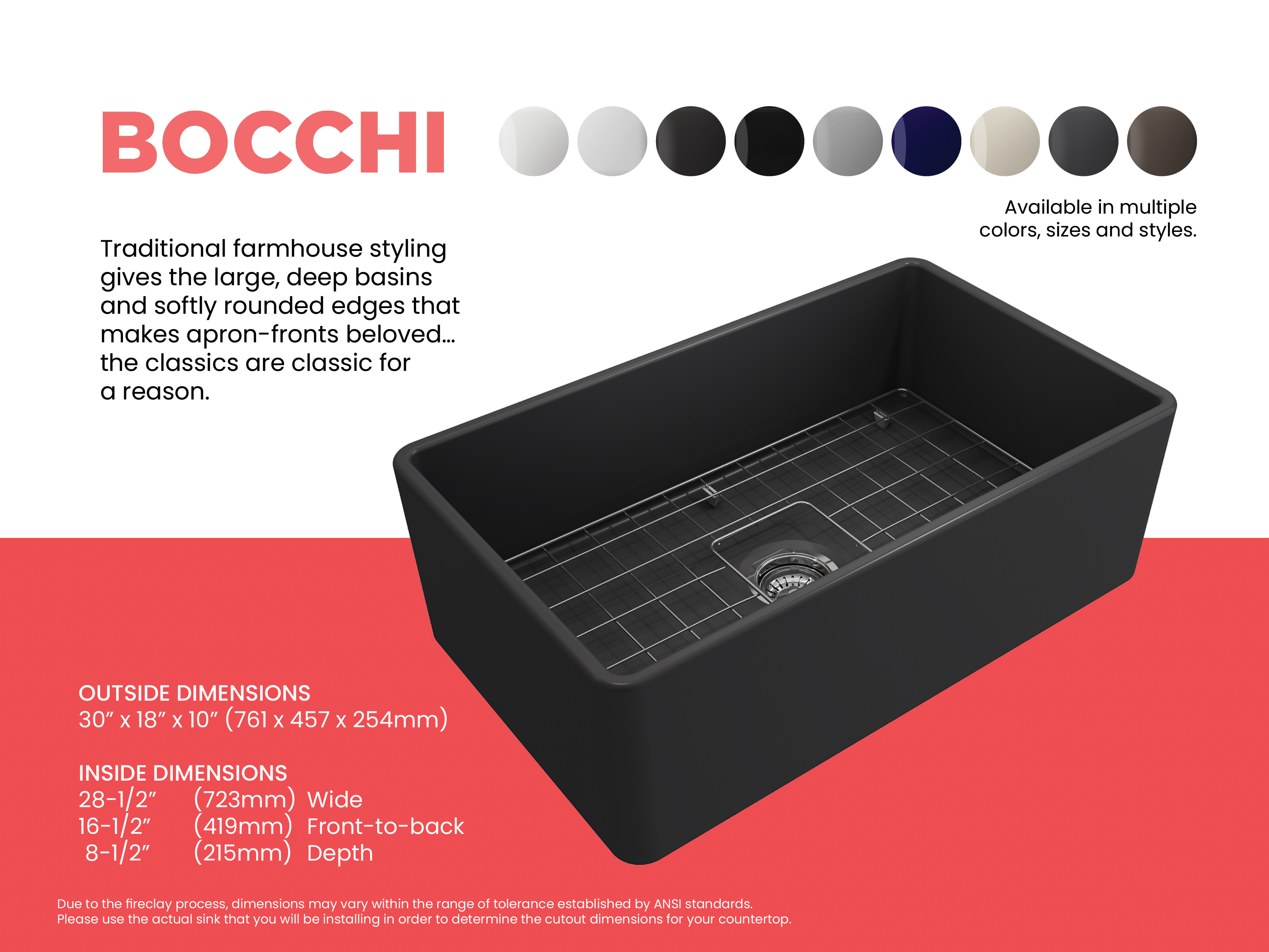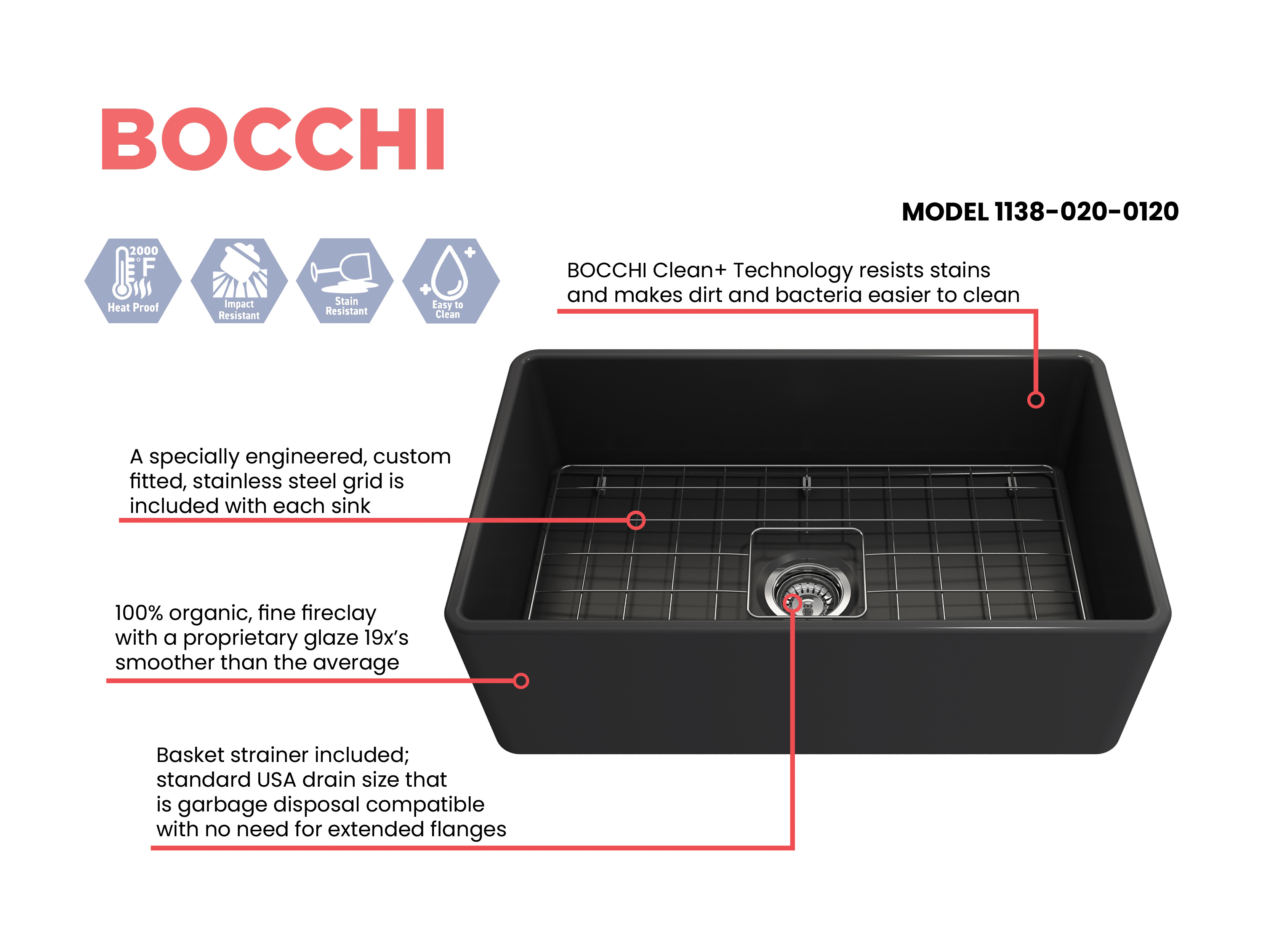 BOCCHI Farmhouse Sinks bring back the ultimate material to your kitchen. Fireclay, a 100% natural organic and recyclable material used by craftsman for centuries to create timeless appliances has now returned to your kitchen. With the firing in our kilns up to 2000°F temperatures, Fireclay becomes the most durable material used in today's kitchens. Thus, dealing with extreme heat coming from pots and pans is definitely not a problem. Due to their special glaze coating fused with the fireclay body, our sinks have a non-porous, uniform, scratch and stain resistant surface. With its protective bottom grid and distinctive looks, BOCCHI Farmhouse Sinks are truly crafted to match your design and functional desires.