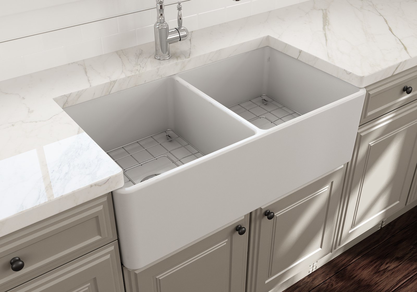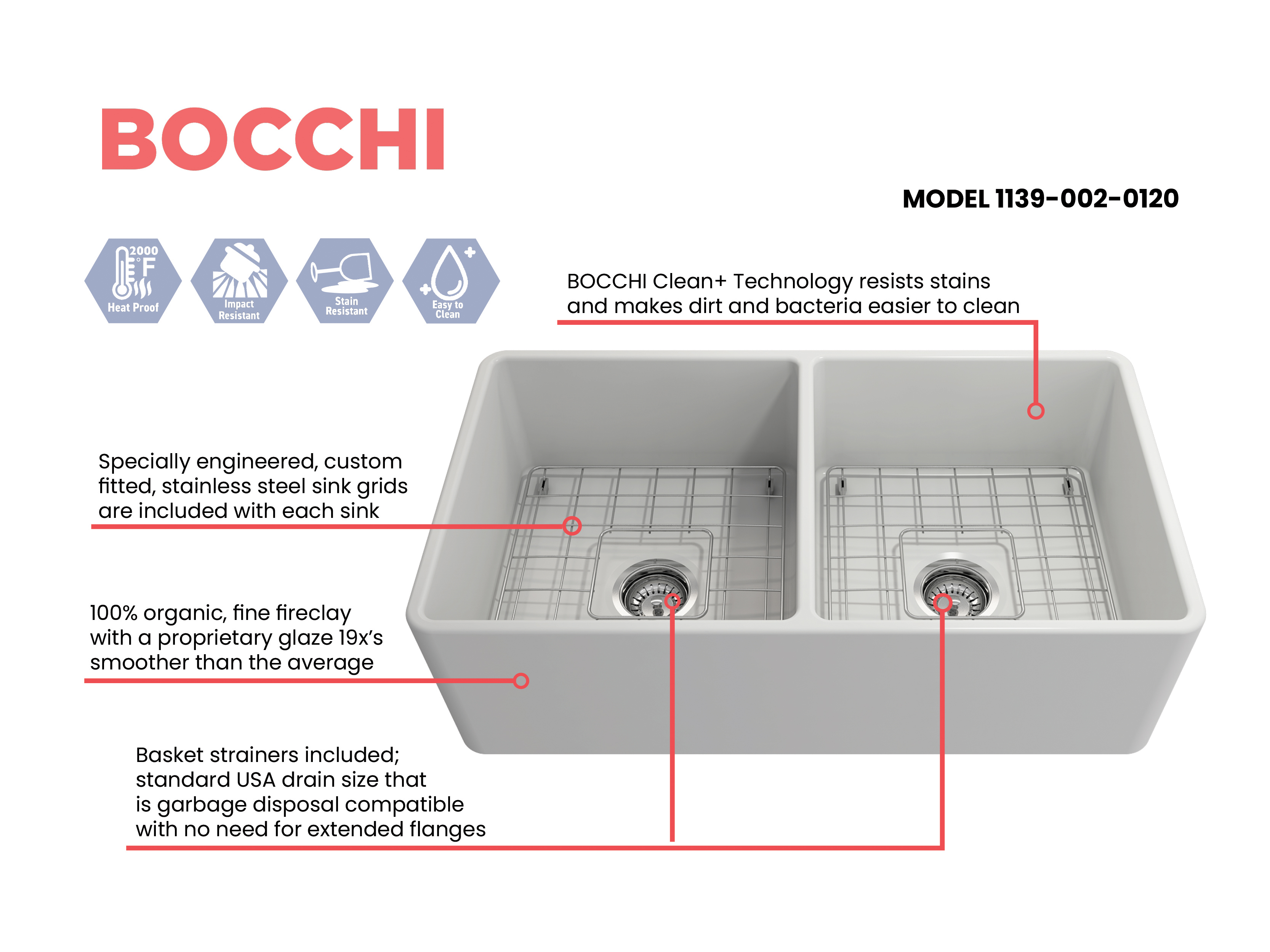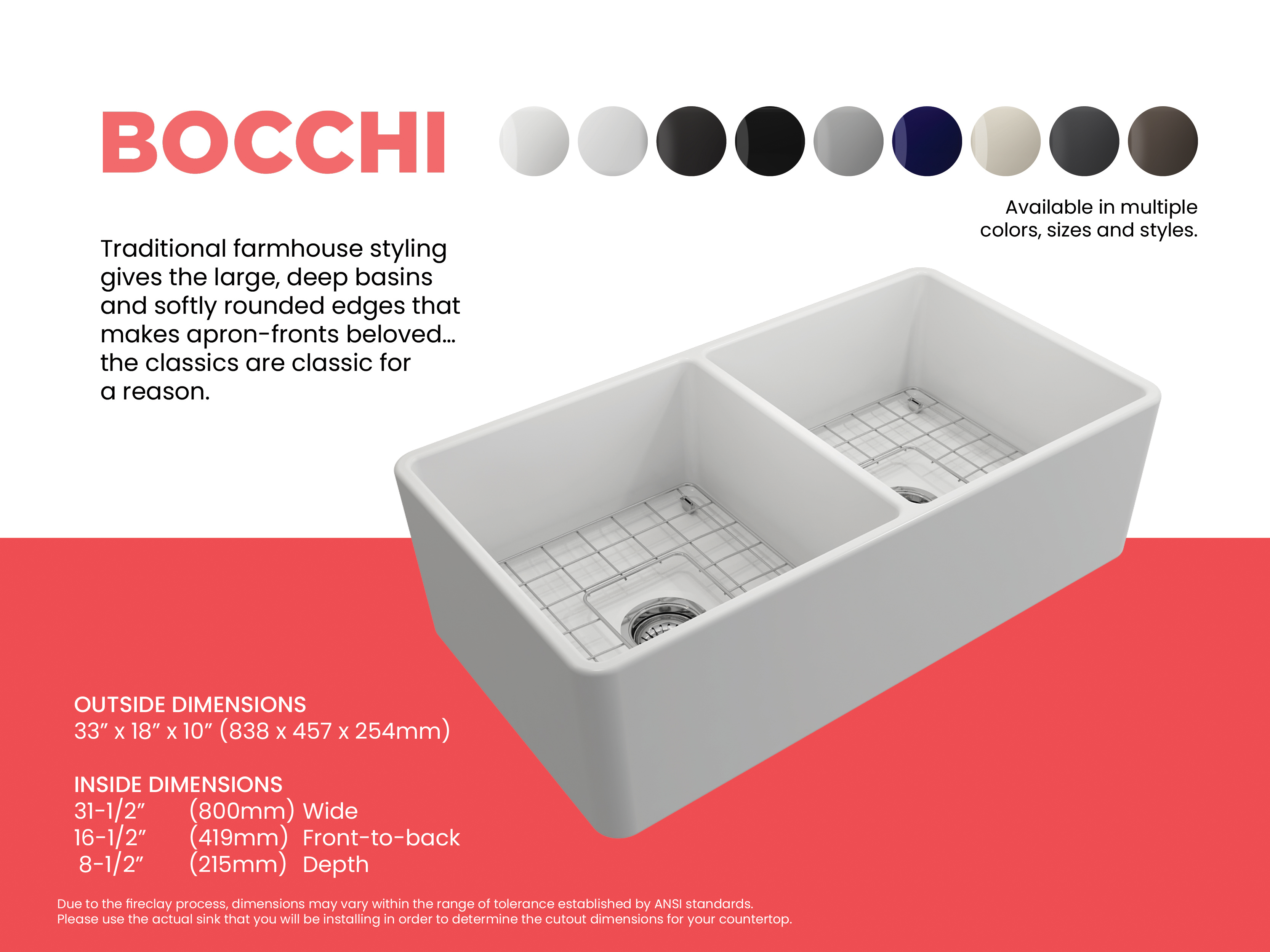 BOCCHI Farmhouse Sinks bring back the ultimate material to your kitchen. Fireclay, a 100% natural organic and recyclable material used by craftsman for centuries to create timeless appliances has now returned to your kitchen. With the firing in our kilns up to 2000°F temperatures, Fireclay becomes the most durable material used in today's kitchens. Thus, dealing with extreme heat coming from pots and pans is definitely not a problem. Due to their special glaze coating fused with the fireclay body, our sinks have a non-porous, uniform, scratch and stain resistant surface. With its protective bottom grid and distinctive looks, BOCCHI Farmhouse Sinks are truly crafted to match your design and functional desires.