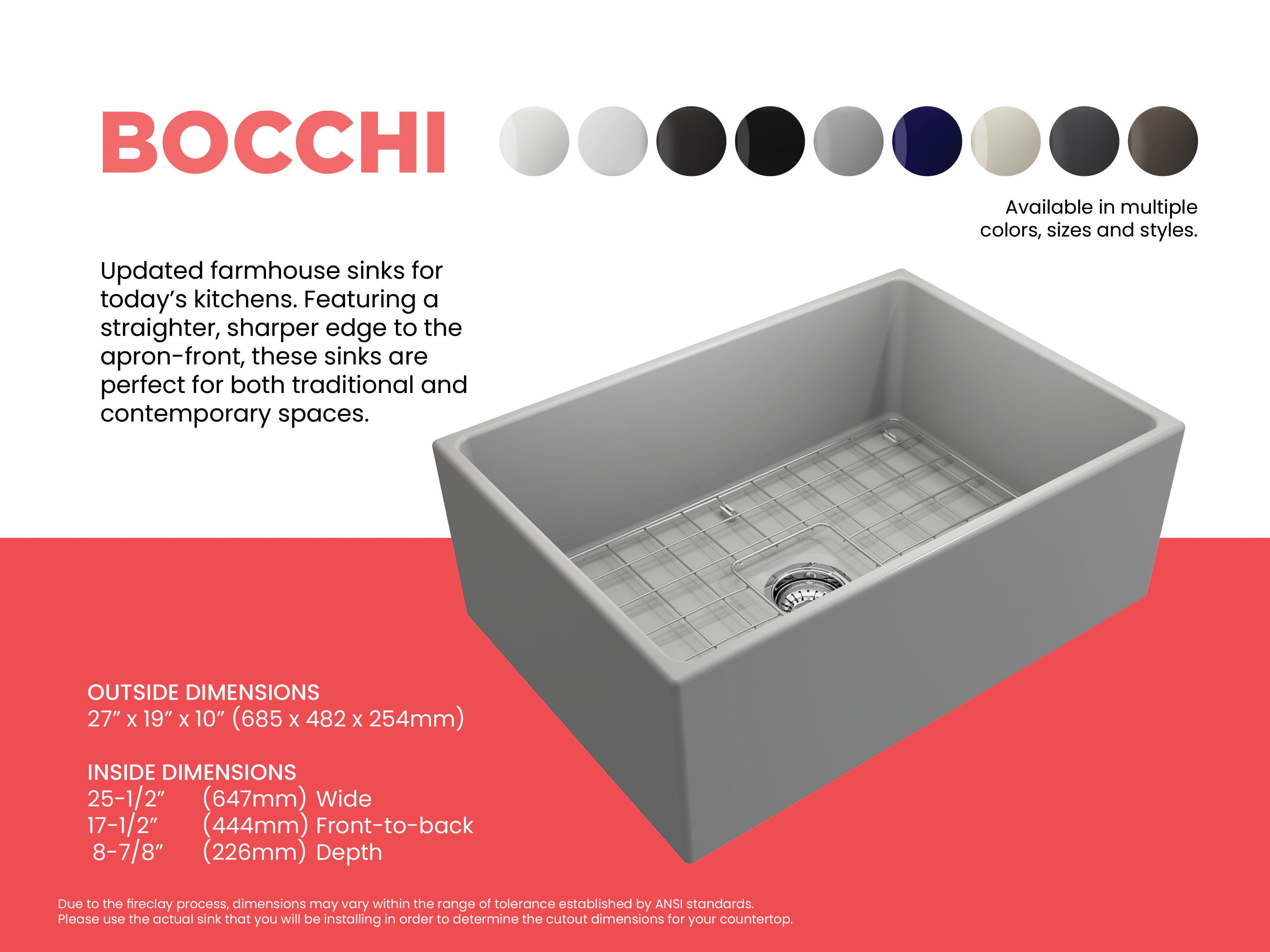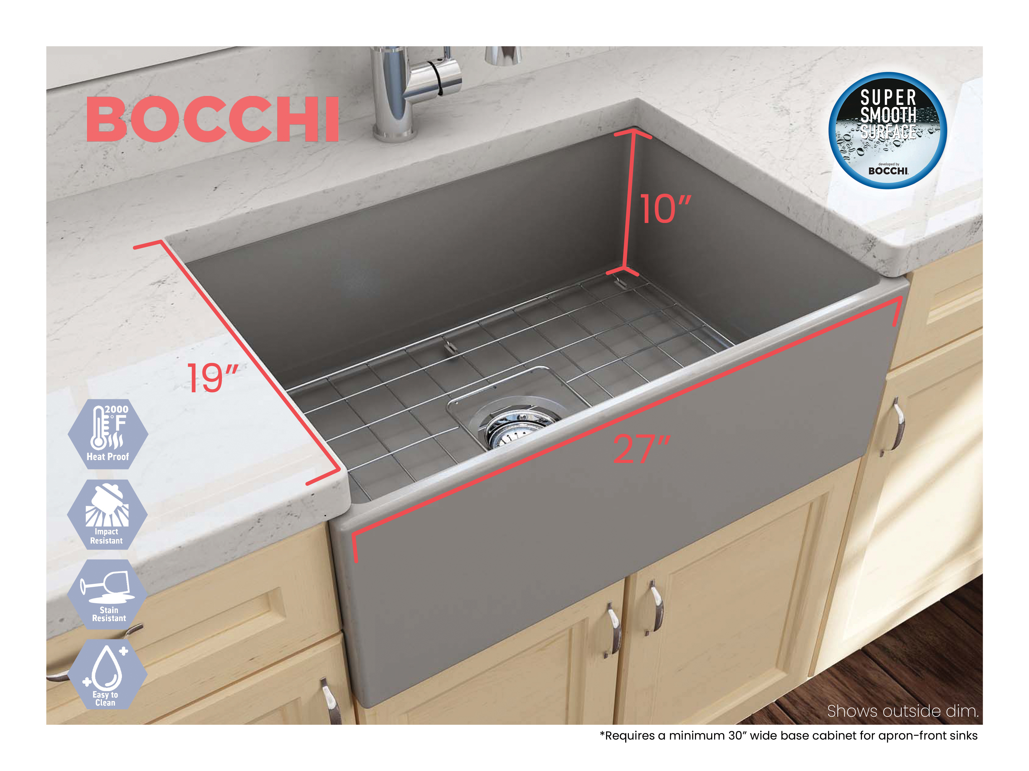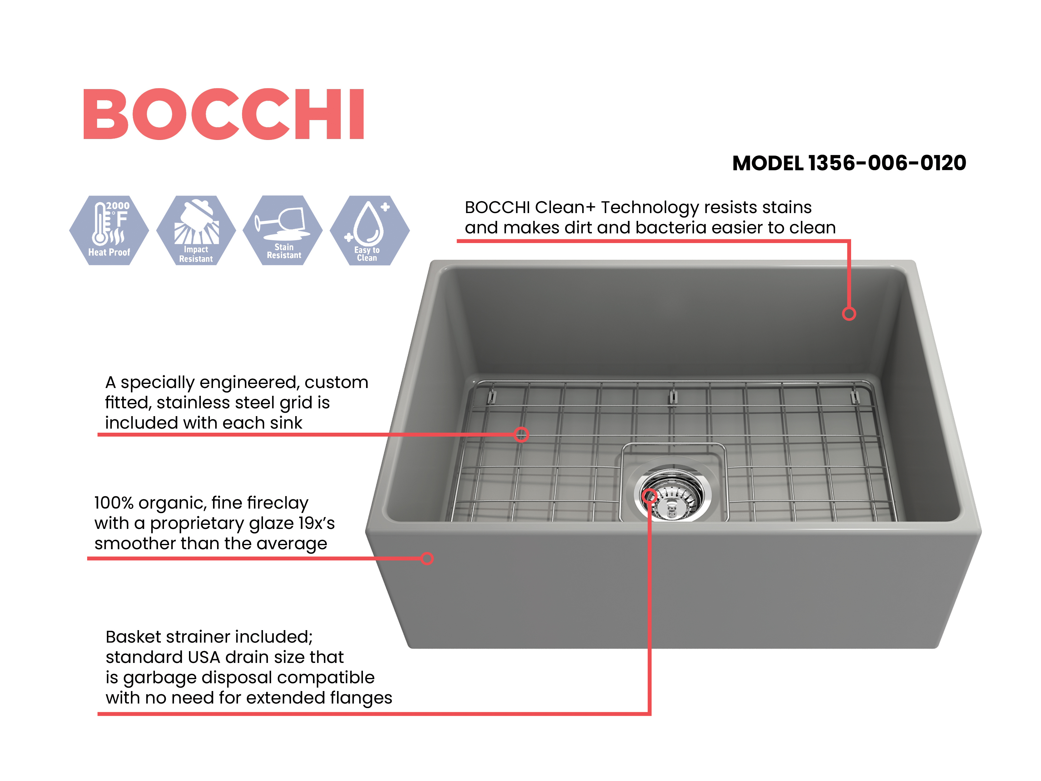 BOCCHI Farmhouse Sinks bring back the ultimate material to your kitchen. Fireclay, a 100% natural organic and recyclable material used by craftsman for centuries to create timeless appliances has now returned to your kitchen. With the firing in our kilns up to 2000°F temperatures, Fireclay becomes the most durable material used in today's kitchens. Thus, dealing with extreme heat coming from pots and pans is definitely not a problem. Due to their special glaze coating fused with the fireclay body, our sinks have a non-porous, uniform, scratch and stain resistant surface. With its protective bottom grid and distinctive looks, BOCCHI Farmhouse Sinks are truly crafted to match your design and functional desires.