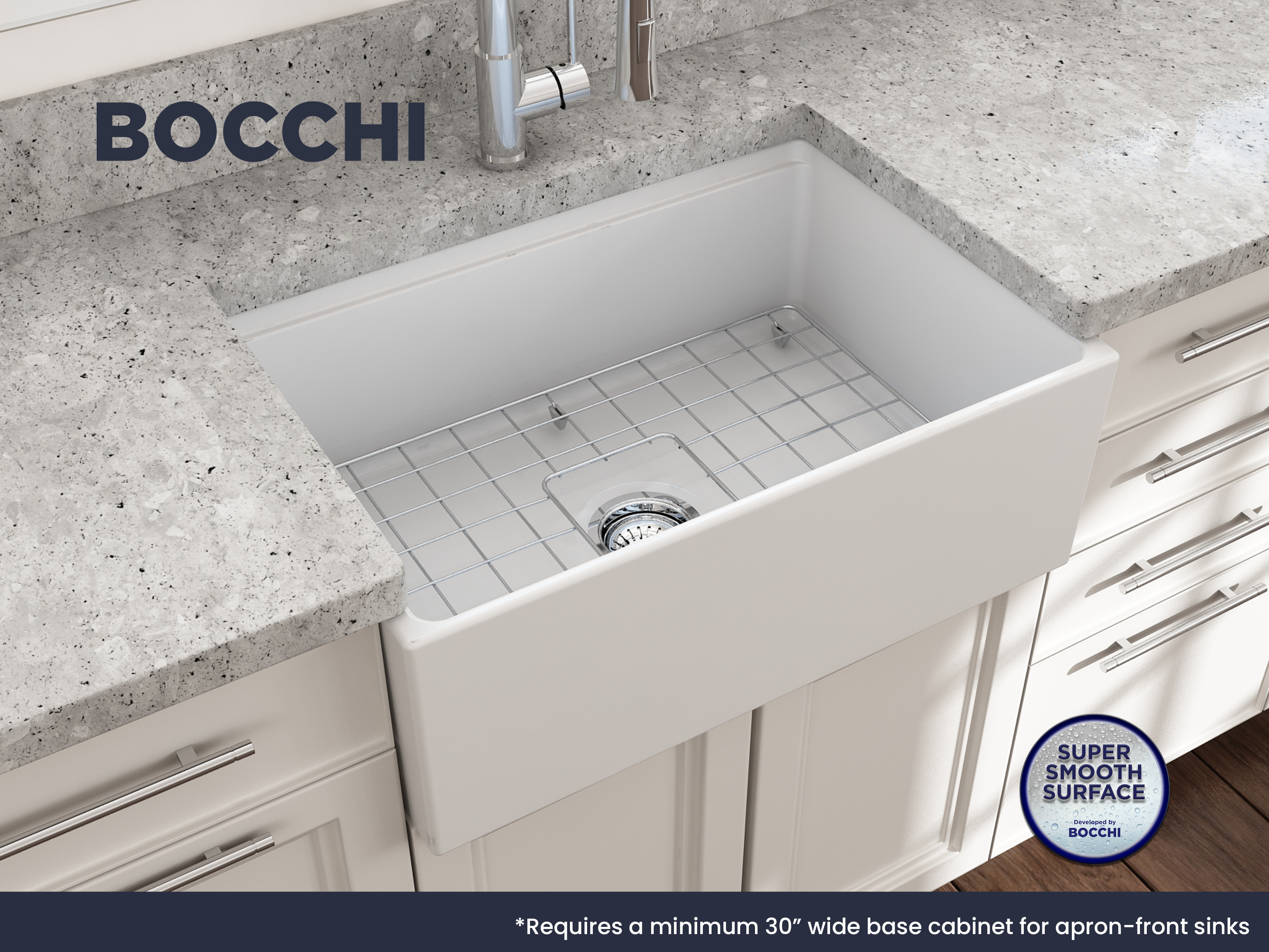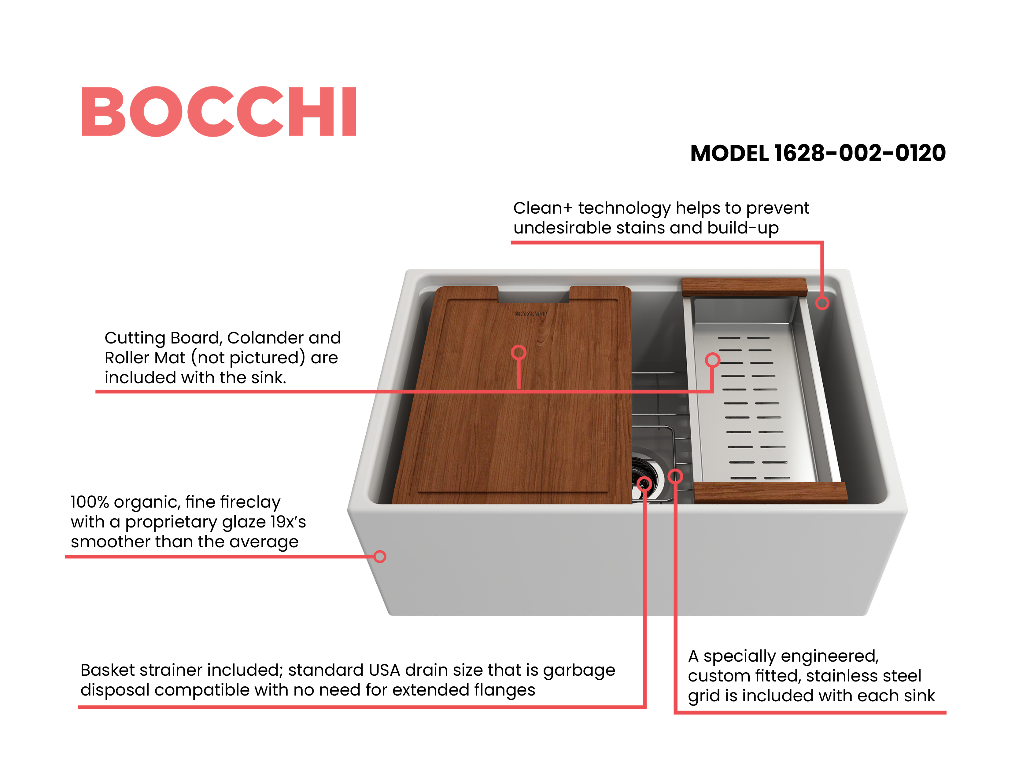 BOCCHI Farmhouse Sinks bring back the ultimate material to your kitchen. Fireclay, a 100% natural organic and recyclable material used by craftsman for centuries to create timeless appliances has now returned to your kitchen. With the firing in our kilns up to 2000°F temperatures, Fireclay becomes the most durable material used in today's kitchens. Thus, dealing with extreme heat coming from pots and pans is definitely not a problem. Due to their special glaze coating fused with the fireclay body, our sinks have a non-porous, uniform, scratch and stain resistant surface. With its protective bottom grid and distinctive looks, BOCCHI Farmhouse Sinks are truly crafted to match your design and functional desires.
