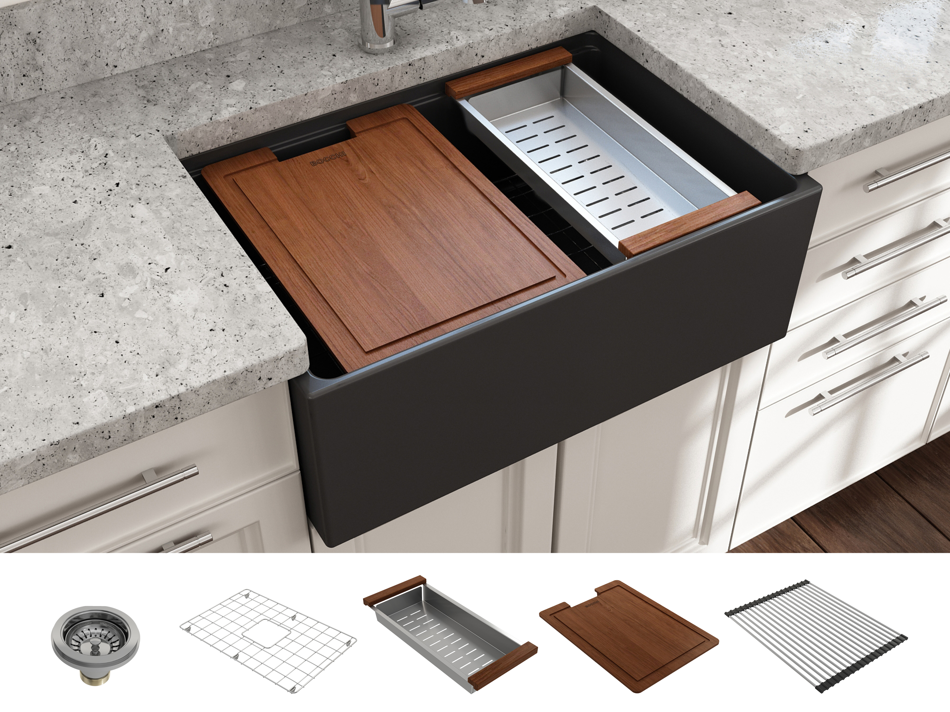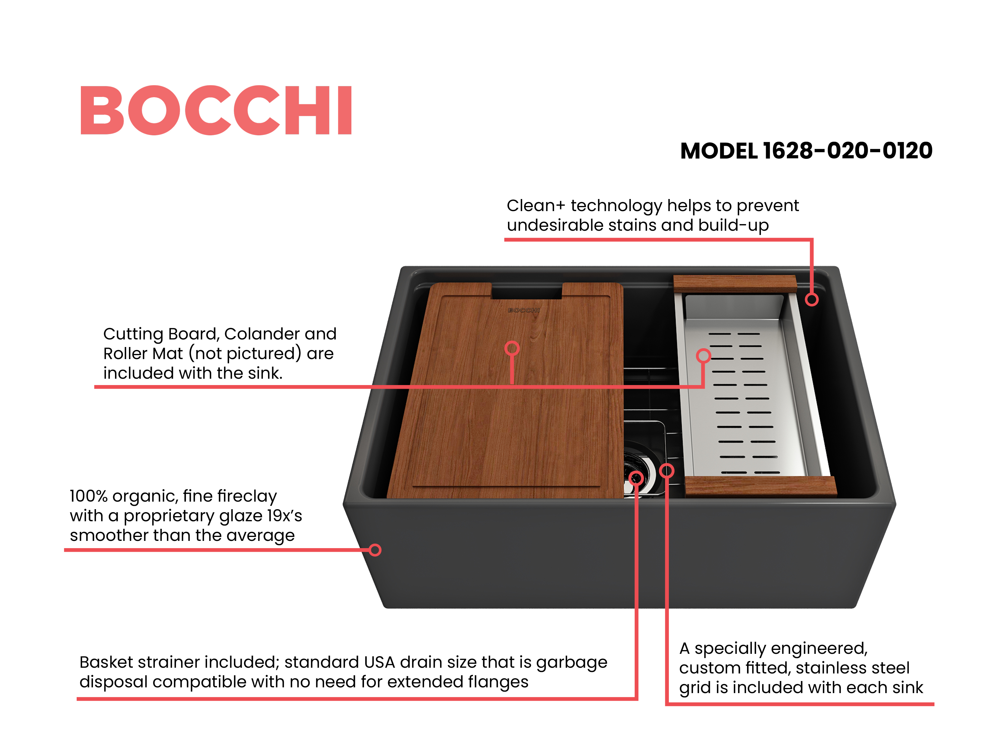 BOCCHI Farmhouse Sinks bring back the ultimate material to your kitchen. Fireclay, a 100% natural organic and recyclable material used by craftsman for centuries to create timeless appliances has now returned to your kitchen. With the firing in our kilns up to 2000°F temperatures, Fireclay becomes the most durable material used in today's kitchens. Thus, dealing with extreme heat coming from pots and pans is definitely not a problem. Due to their special glaze coating fused with the fireclay body, our sinks have a non-porous, uniform, scratch and stain resistant surface. With its protective bottom grid and distinctive looks, BOCCHI Farmhouse Sinks are truly crafted to match your design and functional desires.