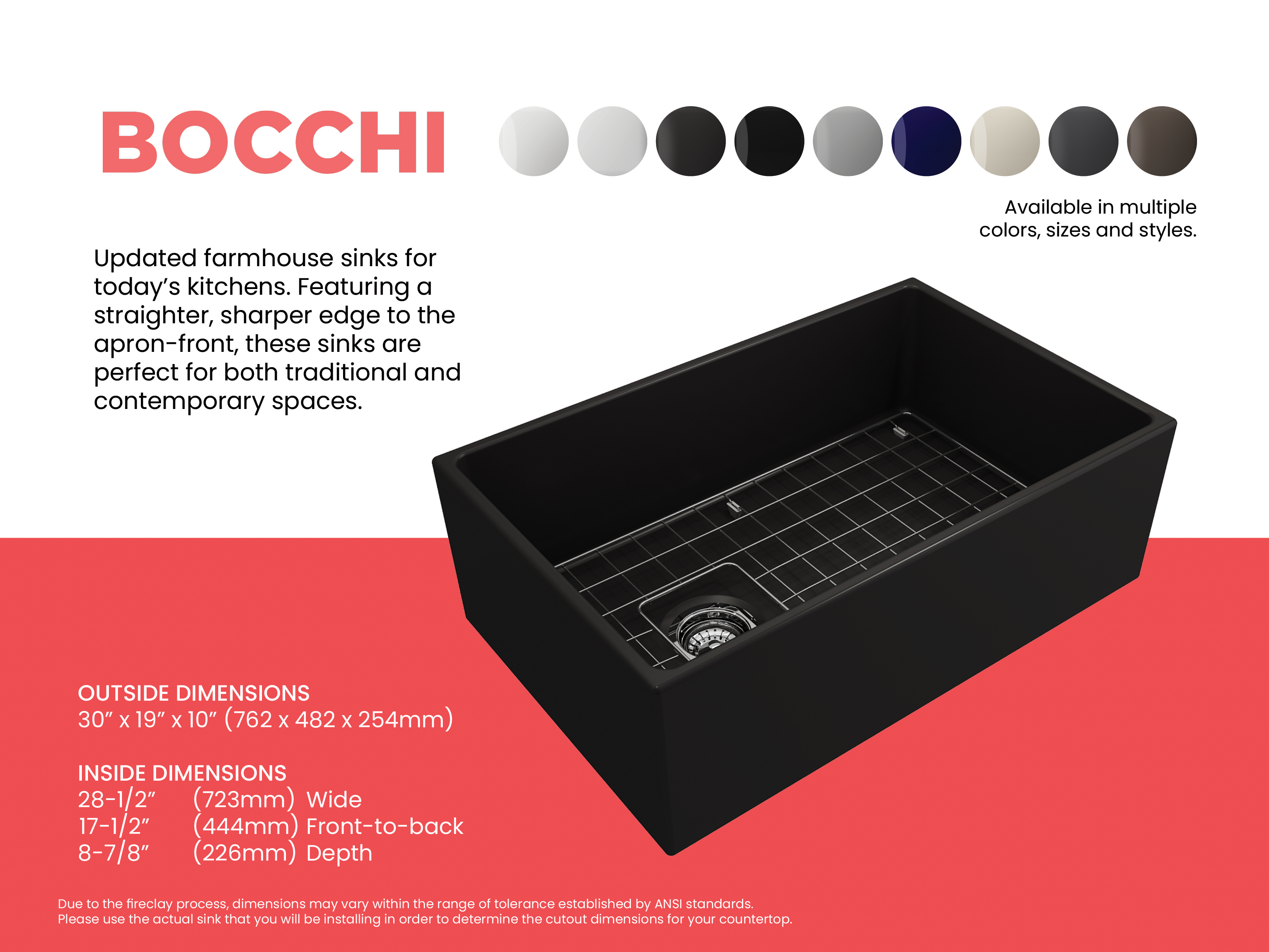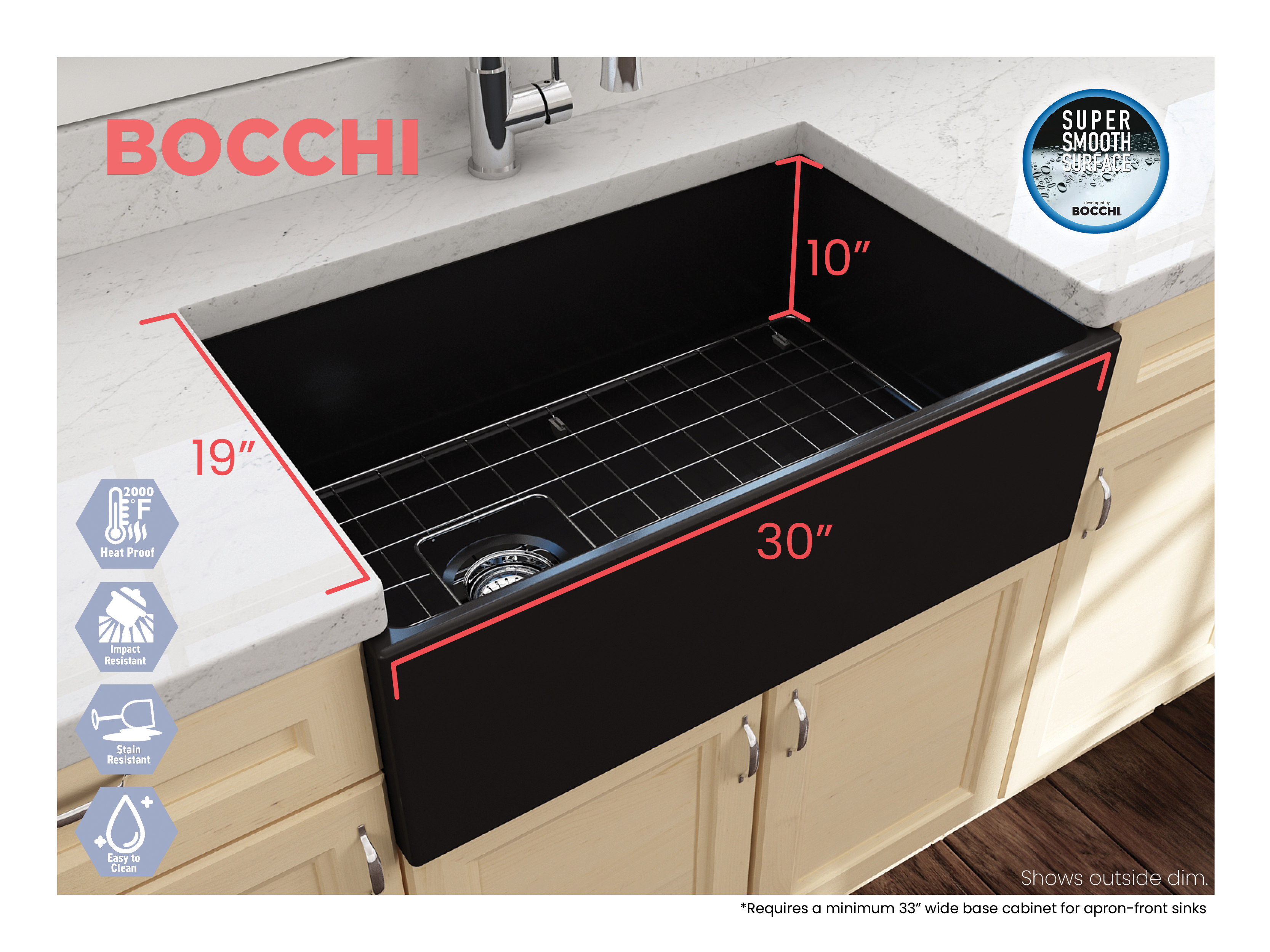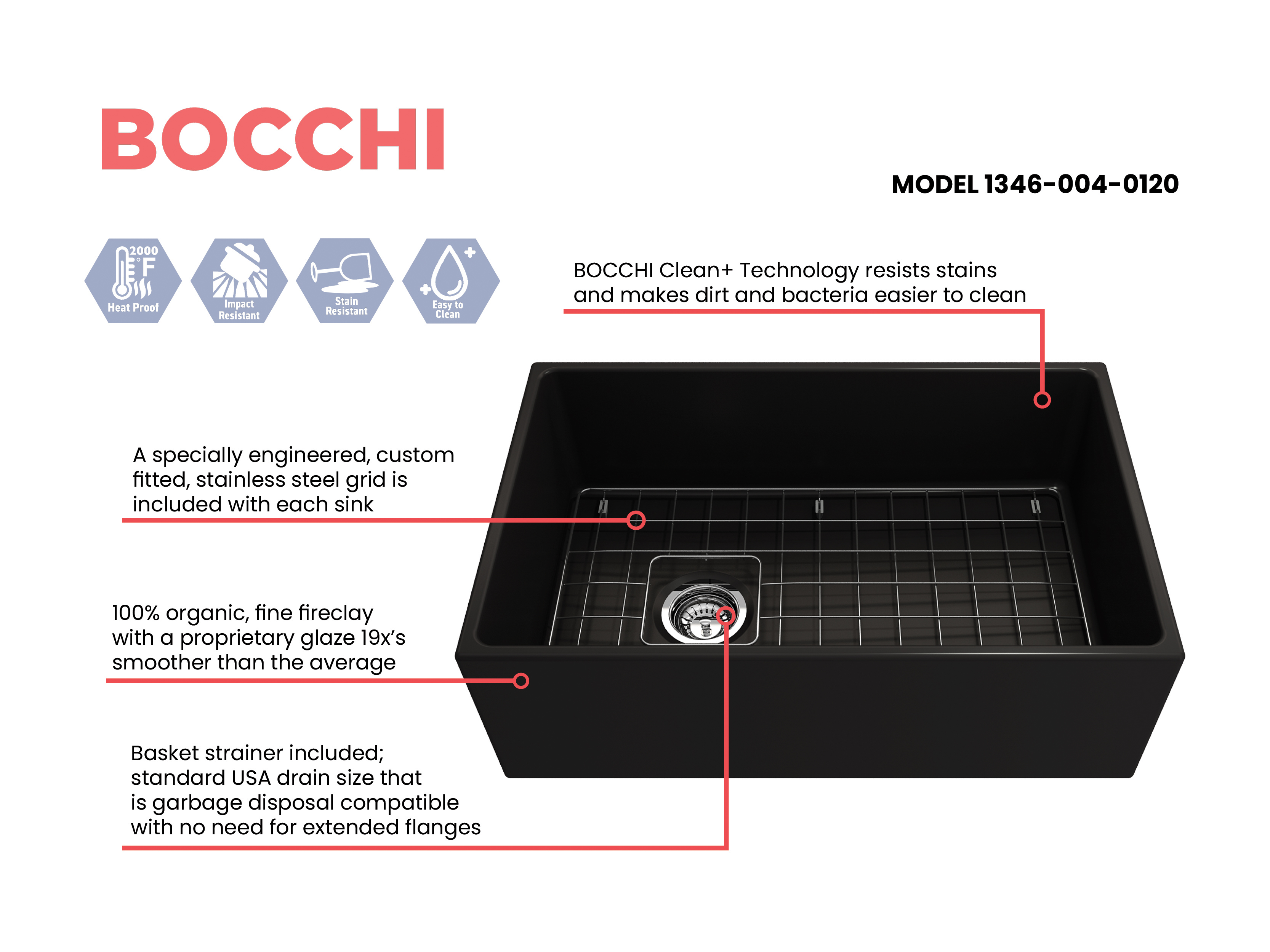 BOCCHI Farmhouse Sinks bring back the ultimate material to your kitchen. Fireclay, a 100% natural organic and recyclable material used by craftsman for centuries to create timeless appliances has now returned to your kitchen. With the firing in our kilns up to 2000°F temperatures, Fireclay becomes the most durable material used in today's kitchens. Thus, dealing with extreme heat coming from pots and pans is definitely not a problem. Due to their special glaze coating fused with the fireclay body, our sinks have a non-porous, uniform, scratch and stain resistant surface. With its protective bottom grid and distinctive looks, BOCCHI Farmhouse Sinks are truly crafted to match your design and functional desires.