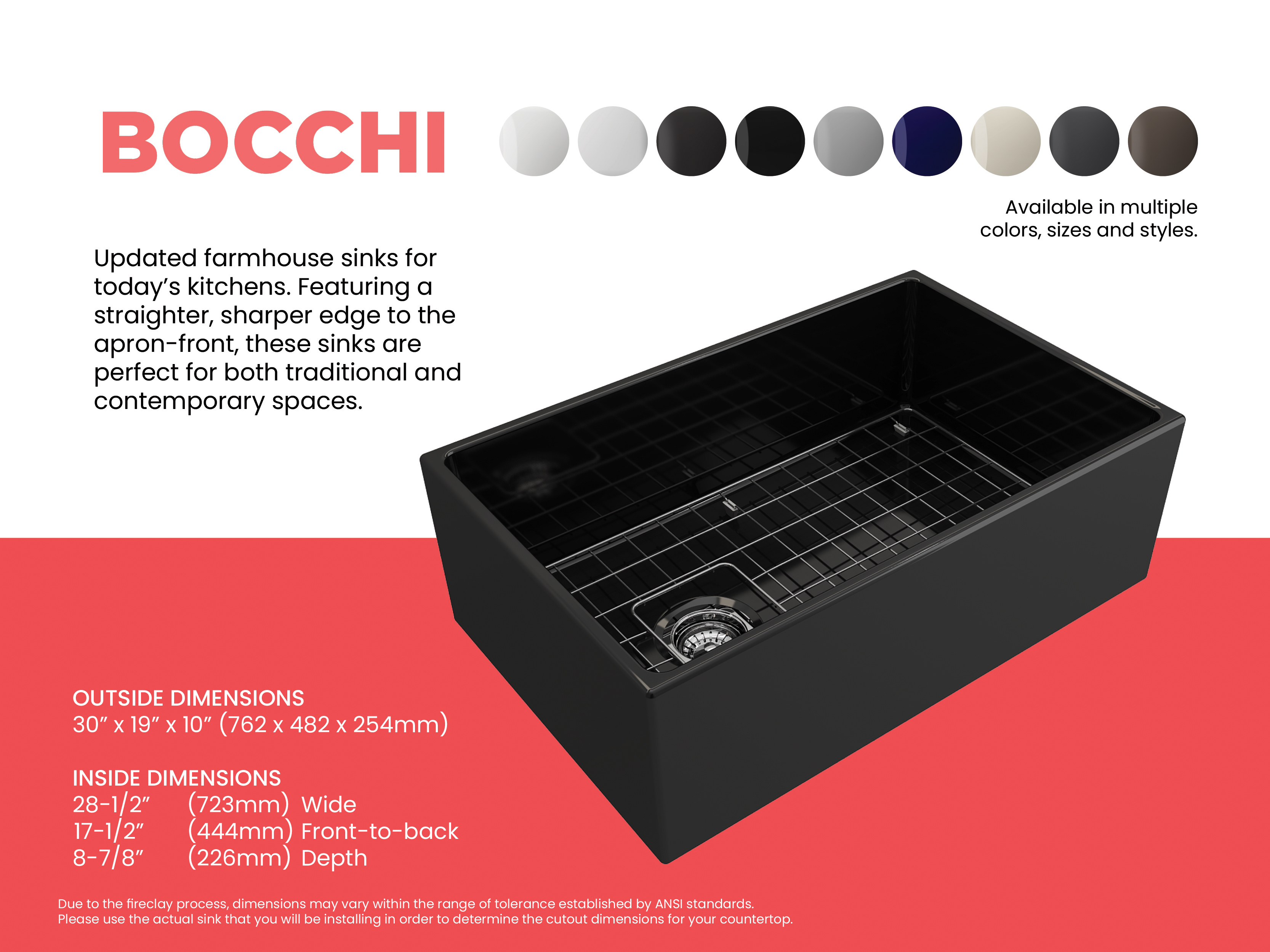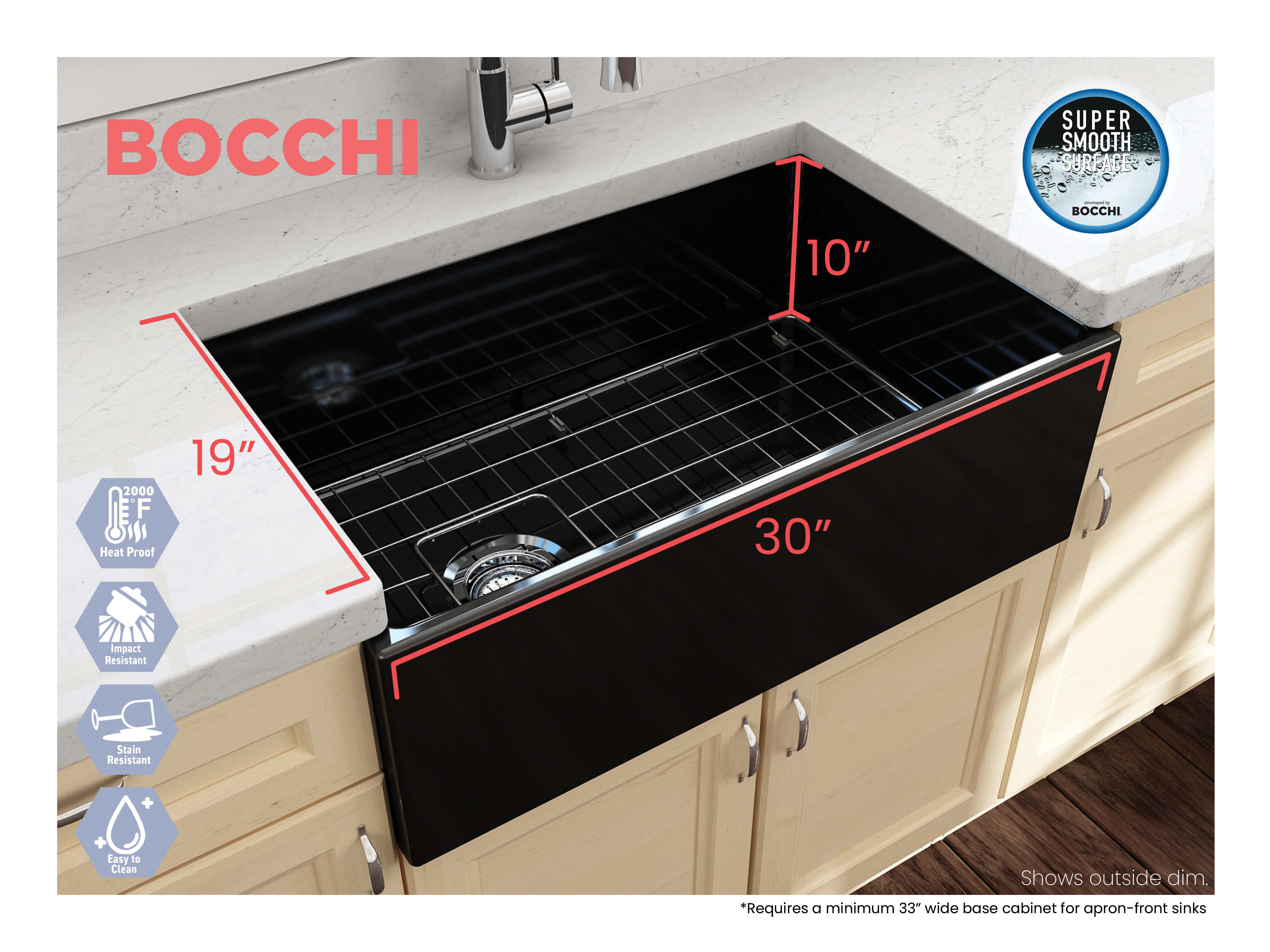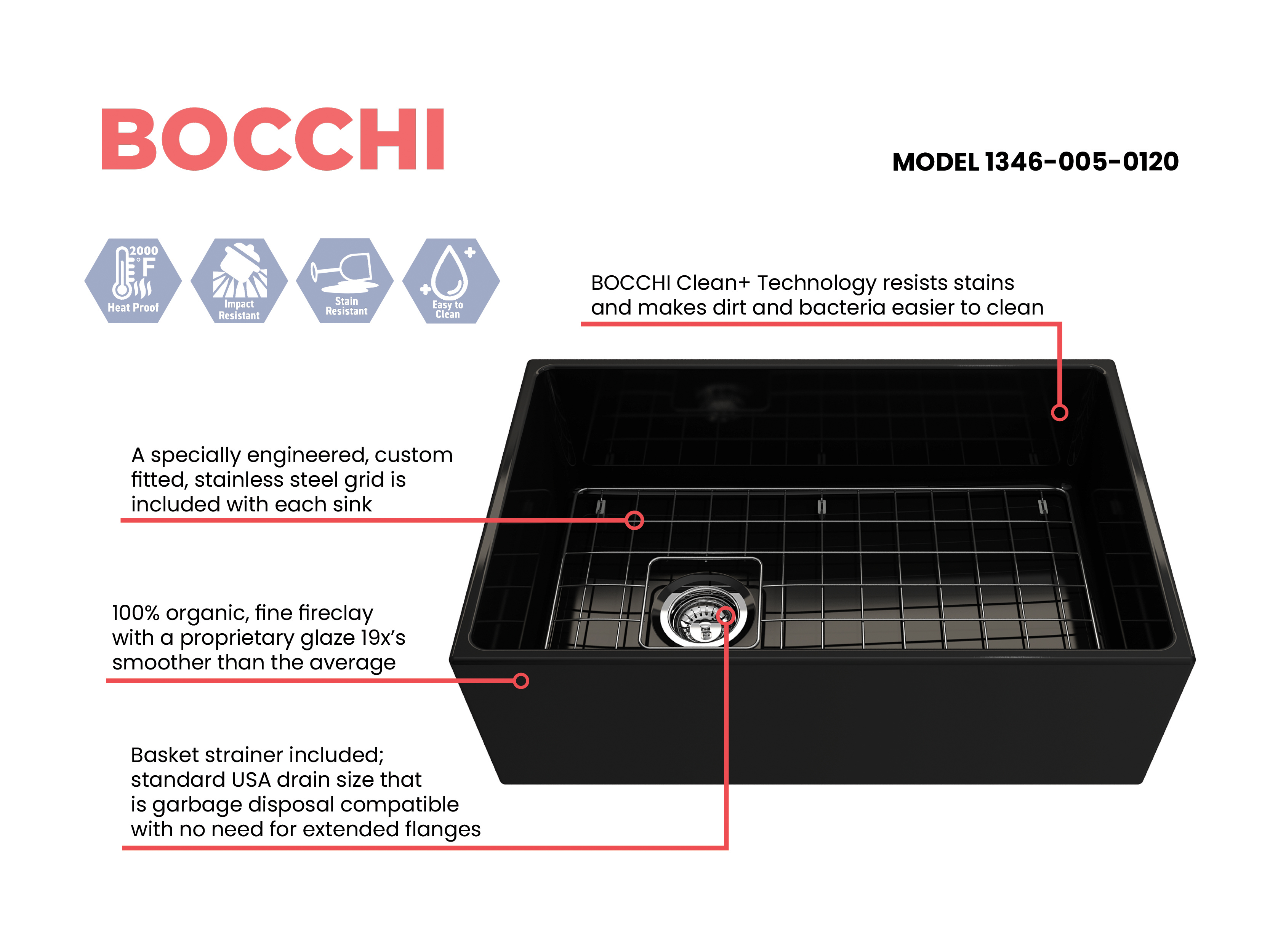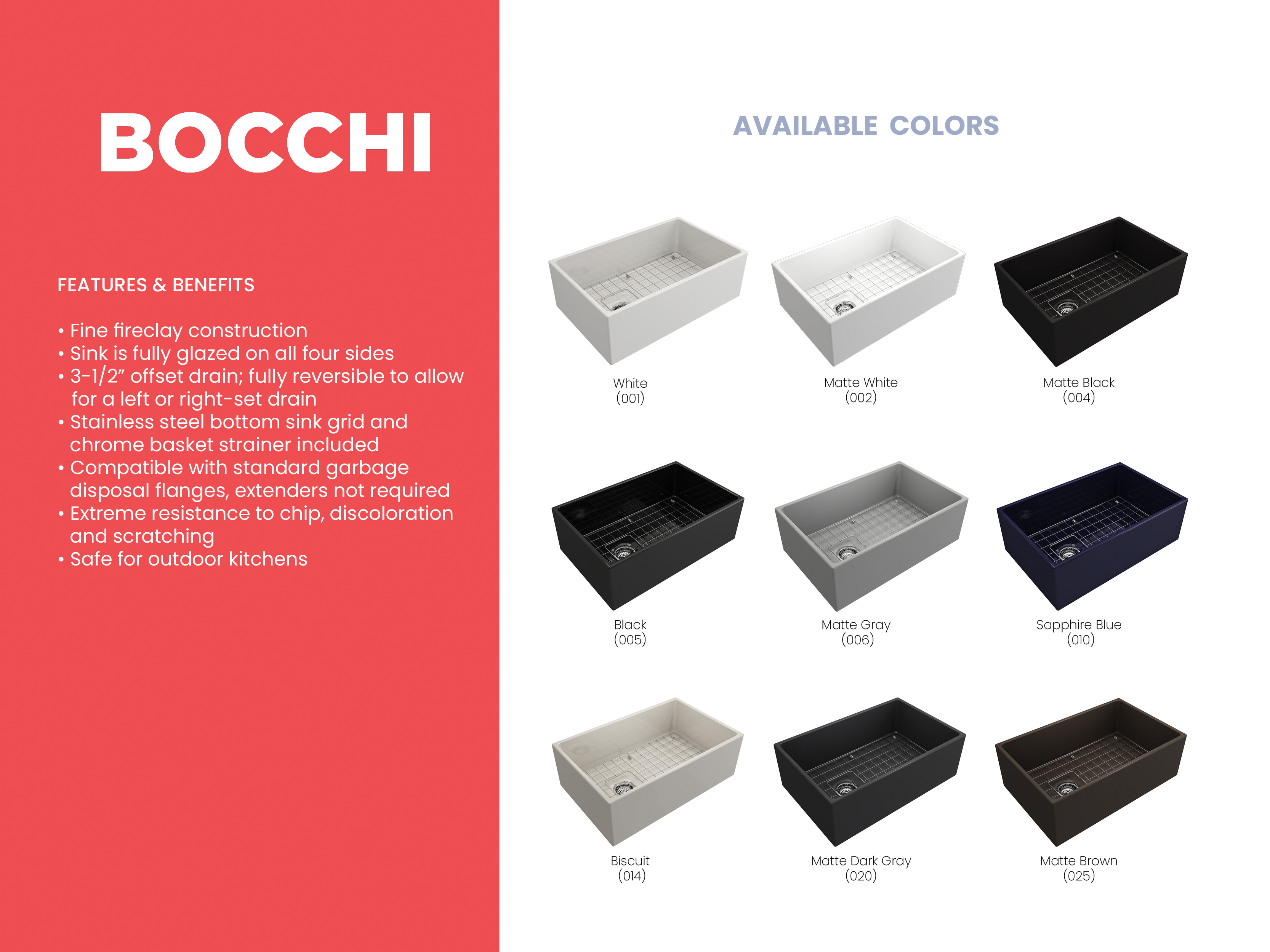 BOCCHI Farmhouse Sinks bring back the ultimate material to your kitchen. Fireclay, a 100% natural organic and recyclable material used by craftsman for centuries to create timeless appliances has now returned to your kitchen. With the firing in our kilns up to 2000°F temperatures, Fireclay becomes the most durable material used in today's kitchens. Thus, dealing with extreme heat coming from pots and pans is definitely not a problem. Due to their special glaze coating fused with the fireclay body, our sinks have a non-porous, uniform, scratch and stain resistant surface. With its protective bottom grid and distinctive looks, BOCCHI Farmhouse Sinks are truly crafted to match your design and functional desires.