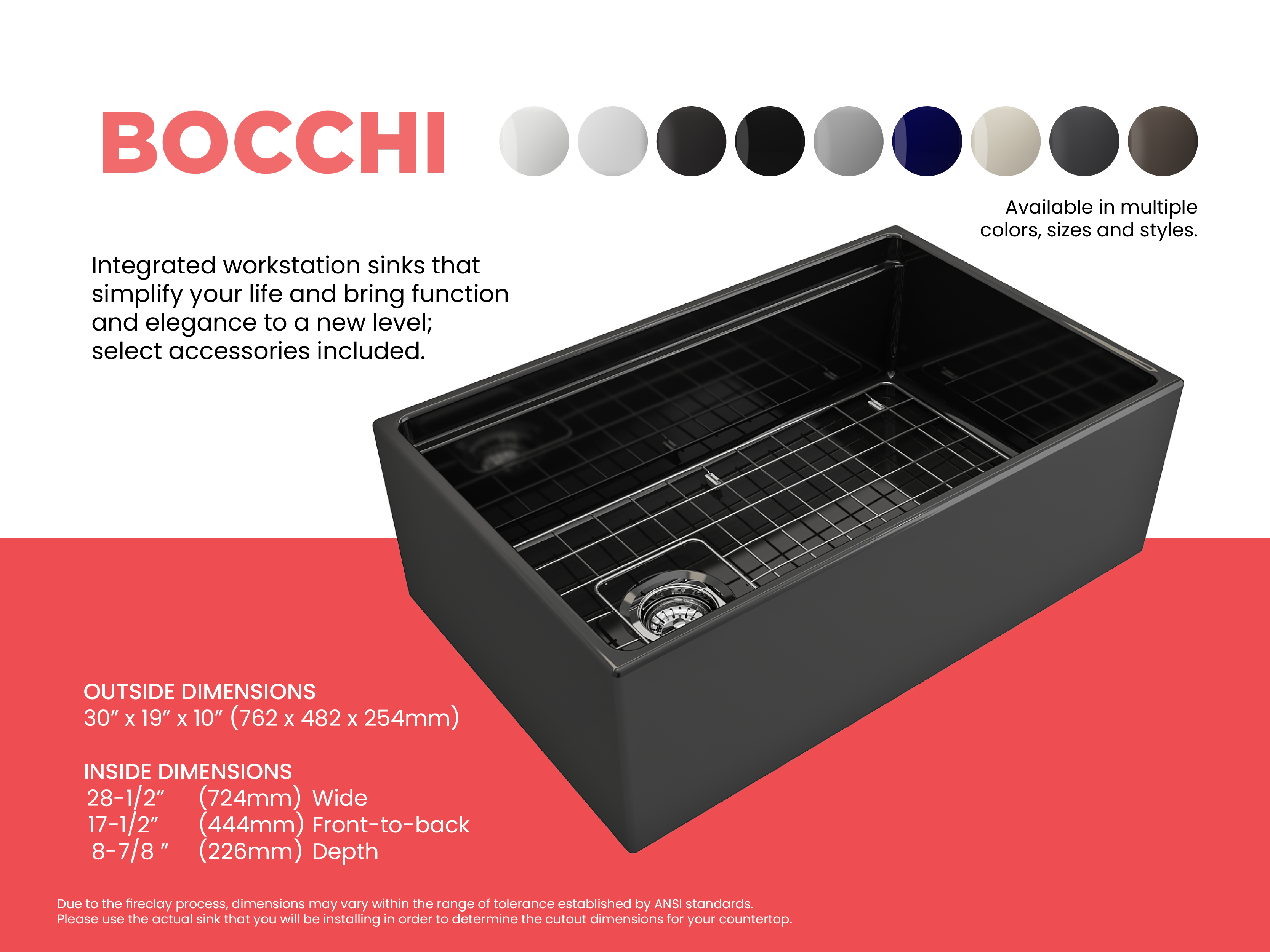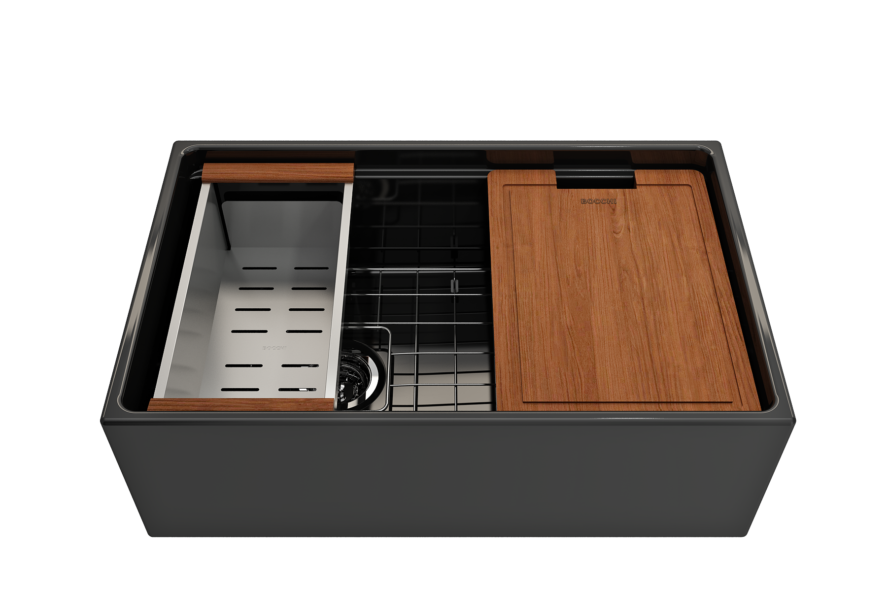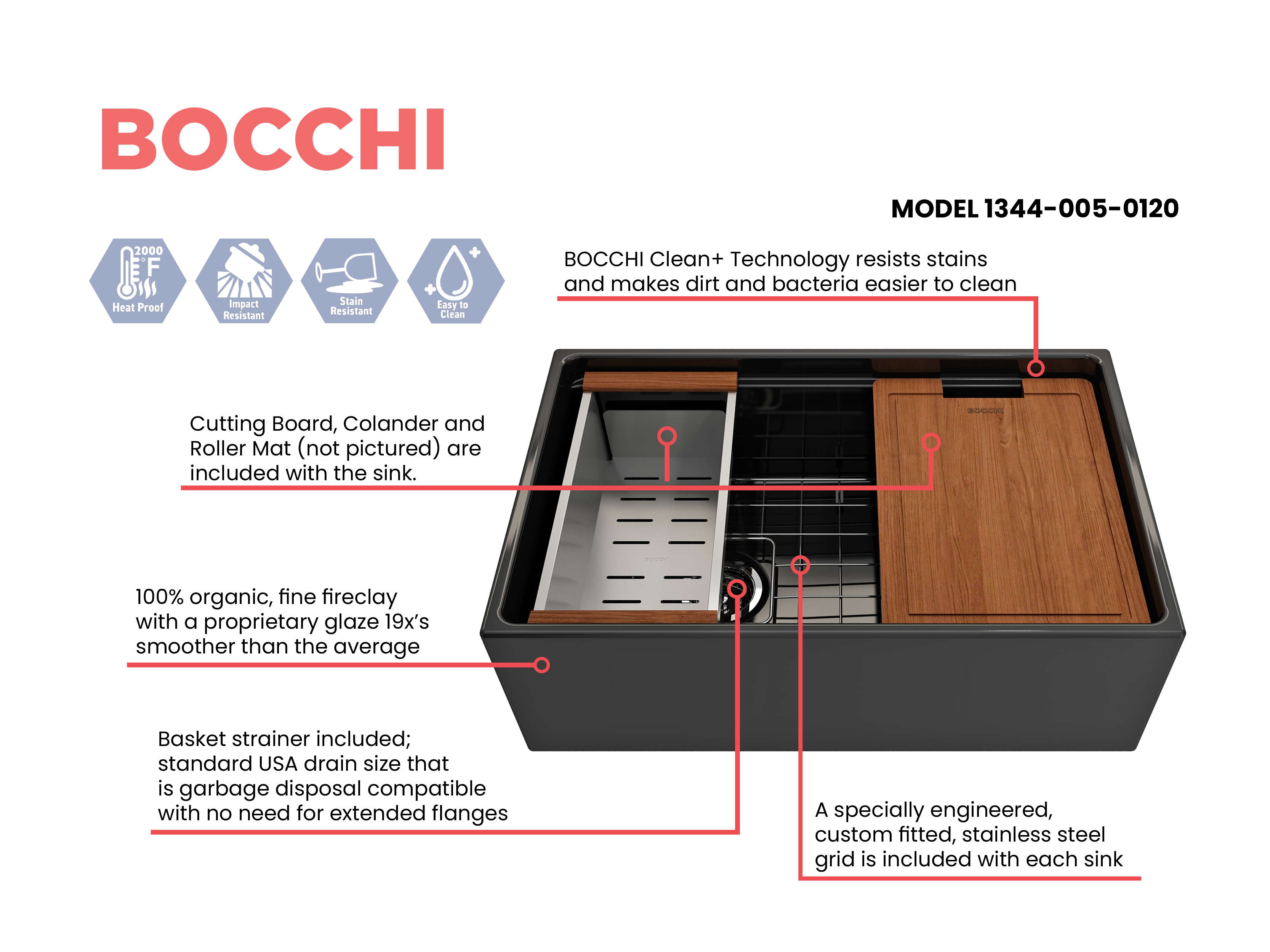 BOCCHI Farmhouse Sinks bring back the ultimate material to your kitchen. Fireclay, a 100% natural organic and recyclable material used by craftsman for centuries to create timeless appliances has now returned to your kitchen. With the firing in our kilns up to 2000°F temperatures, Fireclay becomes the most durable material used in today's kitchens. Thus, dealing with extreme heat coming from pots and pans is definitely not a problem. Due to their special glaze coating fused with the fireclay body, our sinks have a non-porous, uniform, scratch and stain resistant surface. With its protective bottom grid and distinctive looks, BOCCHI Farmhouse Sinks are truly crafted to match your design and functional desires.