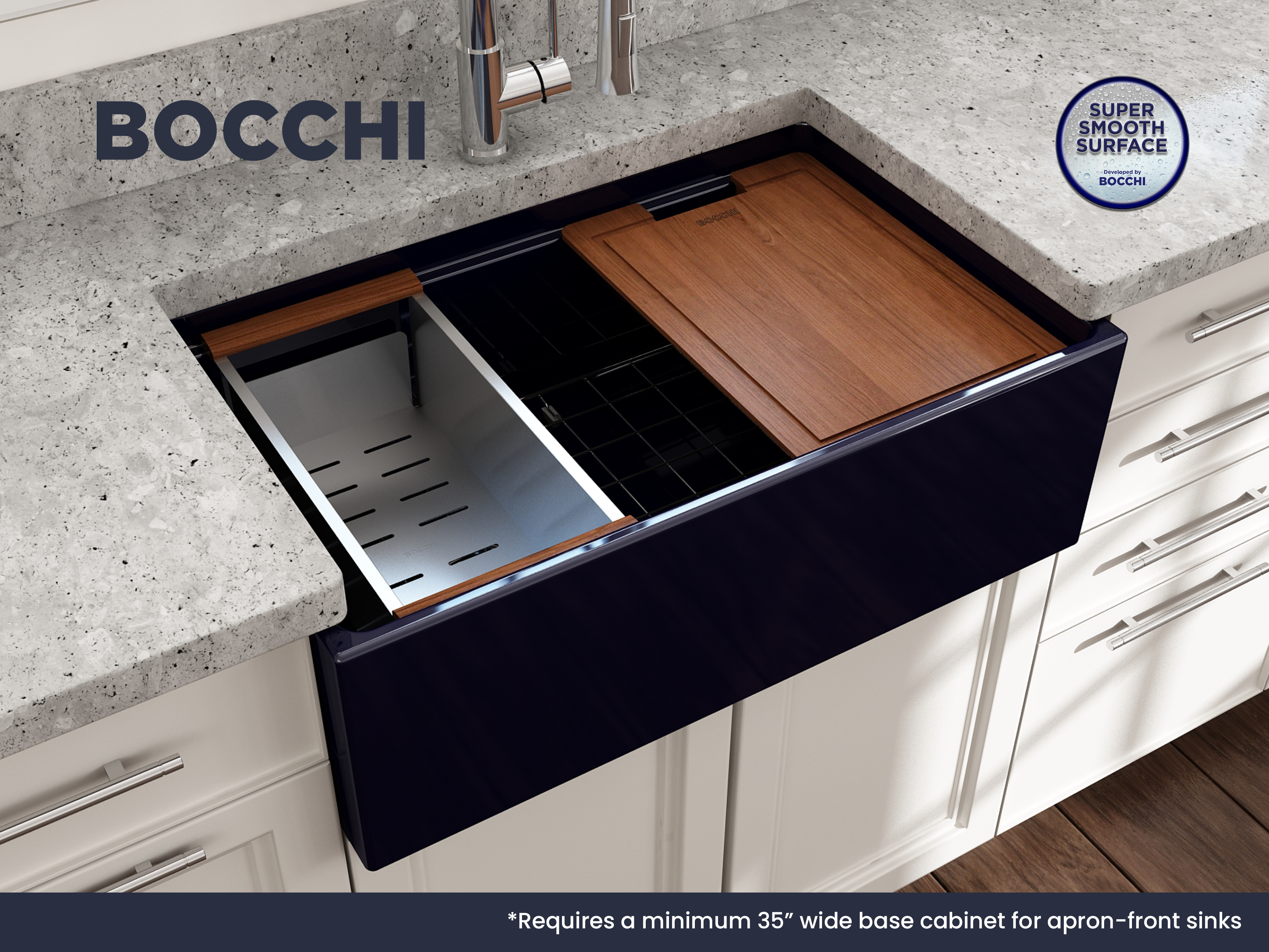BOCCHI Farmhouse Sinks bring back the ultimate material to your kitchen. Fireclay, a 100% natural organic and recyclable material used by craftsman for centuries to create timeless appliances has now returned to your kitchen. With the firing in our kilns up to 2000°F temperatures, Fireclay becomes the most durable material used in today's kitchens. Thus, dealing with extreme heat coming from pots and pans is definitely not a problem. Due to their special glaze coating fused with the fireclay body, our sinks have a non-porous, uniform, scratch and stain resistant surface. With its protective bottom grid and distinctive looks, BOCCHI Farmhouse Sinks are truly crafted to match your design and functional desires.