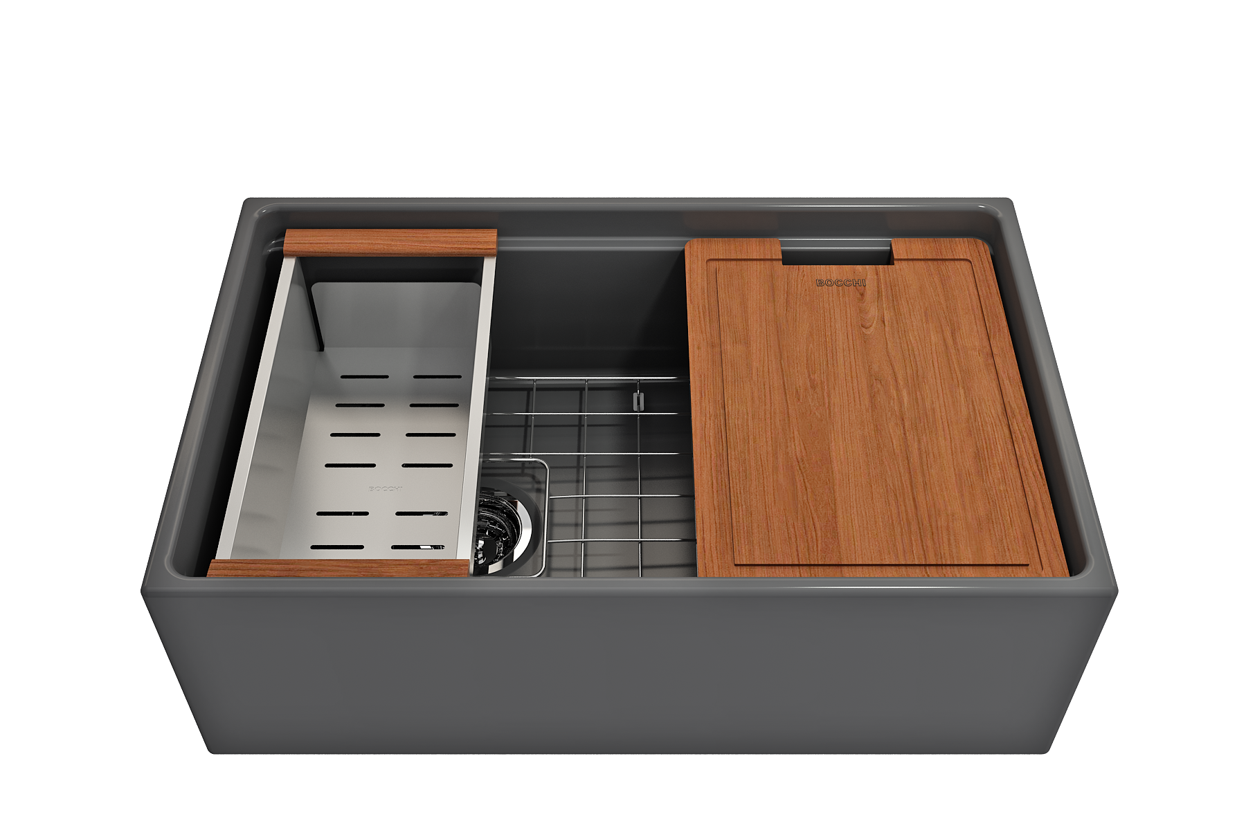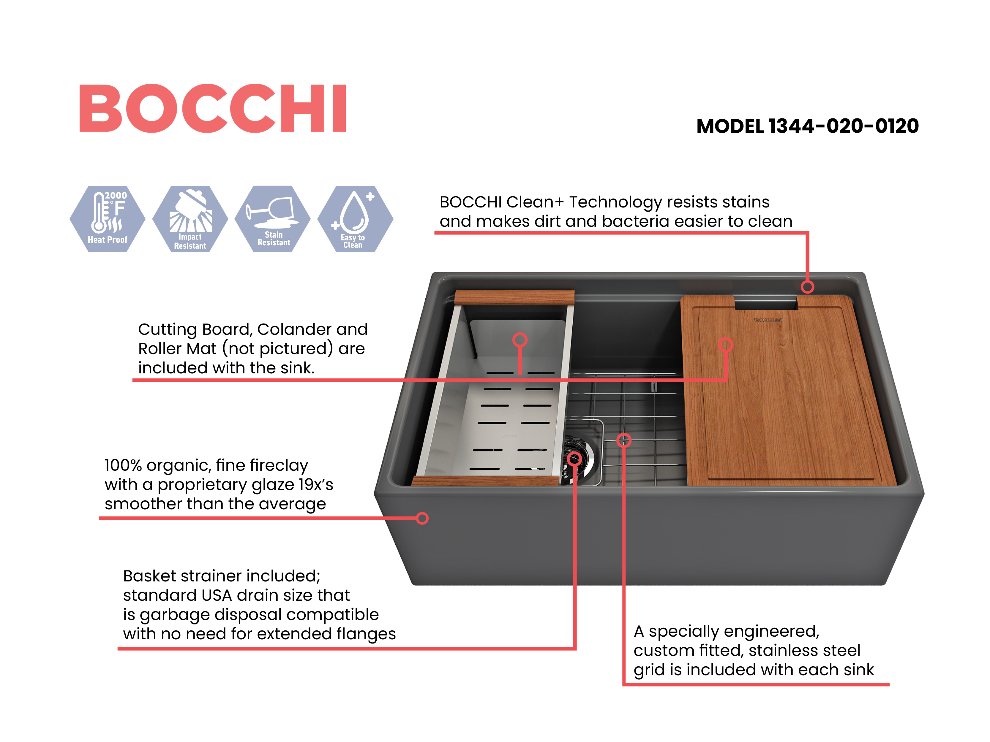 BOCCHI Farmhouse Sinks bring back the ultimate material to your kitchen. Fireclay, a 100% natural organic and recyclable material used by craftsman for centuries to create timeless appliances has now returned to your kitchen. With the firing in our kilns up to 2000°F temperatures, Fireclay becomes the most durable material used in today's kitchens. Thus, dealing with extreme heat coming from pots and pans is definitely not a problem. Due to their special glaze coating fused with the fireclay body, our sinks have a non-porous, uniform, scratch and stain resistant surface. With its protective bottom grid and distinctive looks, BOCCHI Farmhouse Sinks are truly crafted to match your design and functional desires.