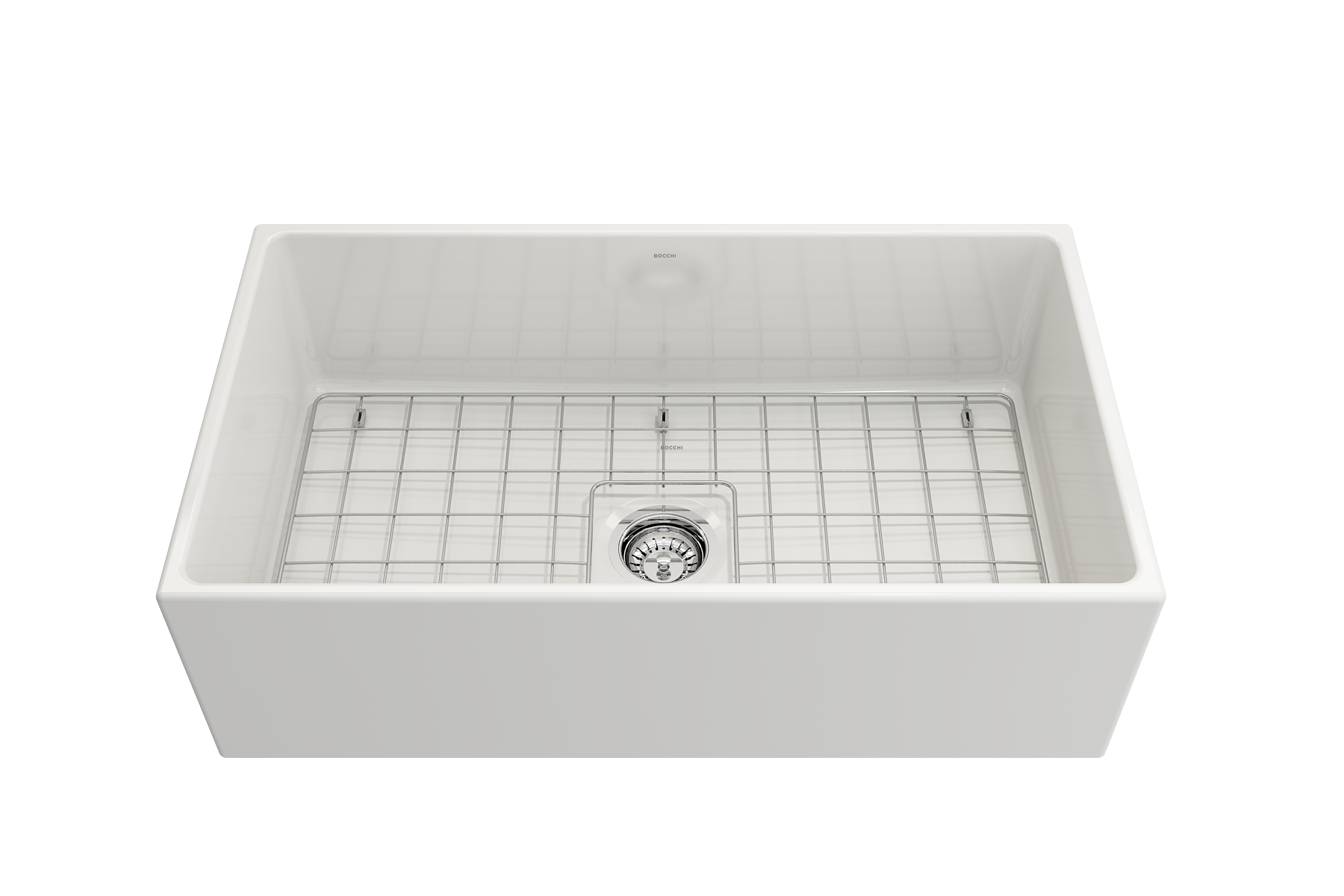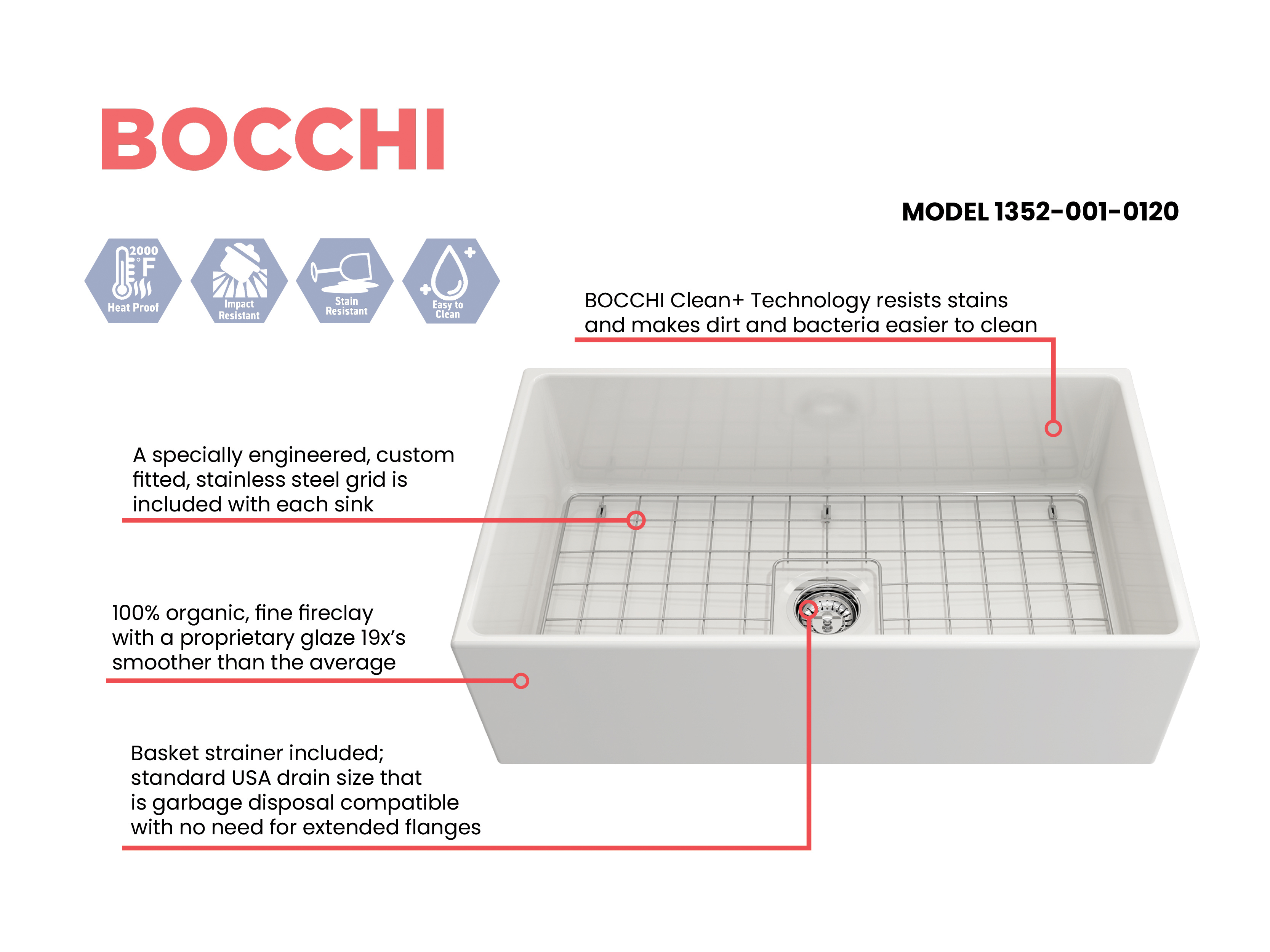 BOCCHI Farmhouse Sinks bring back the ultimate material to your kitchen. Fireclay, a 100% natural organic and recyclable material used by craftsman for centuries to create timeless appliances has now returned to your kitchen. With the firing in our kilns up to 2000°F temperatures, Fireclay becomes the most durable material used in today's kitchens. Thus, dealing with extreme heat coming from pots and pans is definitely not a problem. Due to their special glaze coating fused with the fireclay body, our sinks have a non-porous, uniform, scratch and stain resistant surface. With its protective bottom grid and distinctive looks, BOCCHI Farmhouse Sinks are truly crafted to match your design and functional desires.