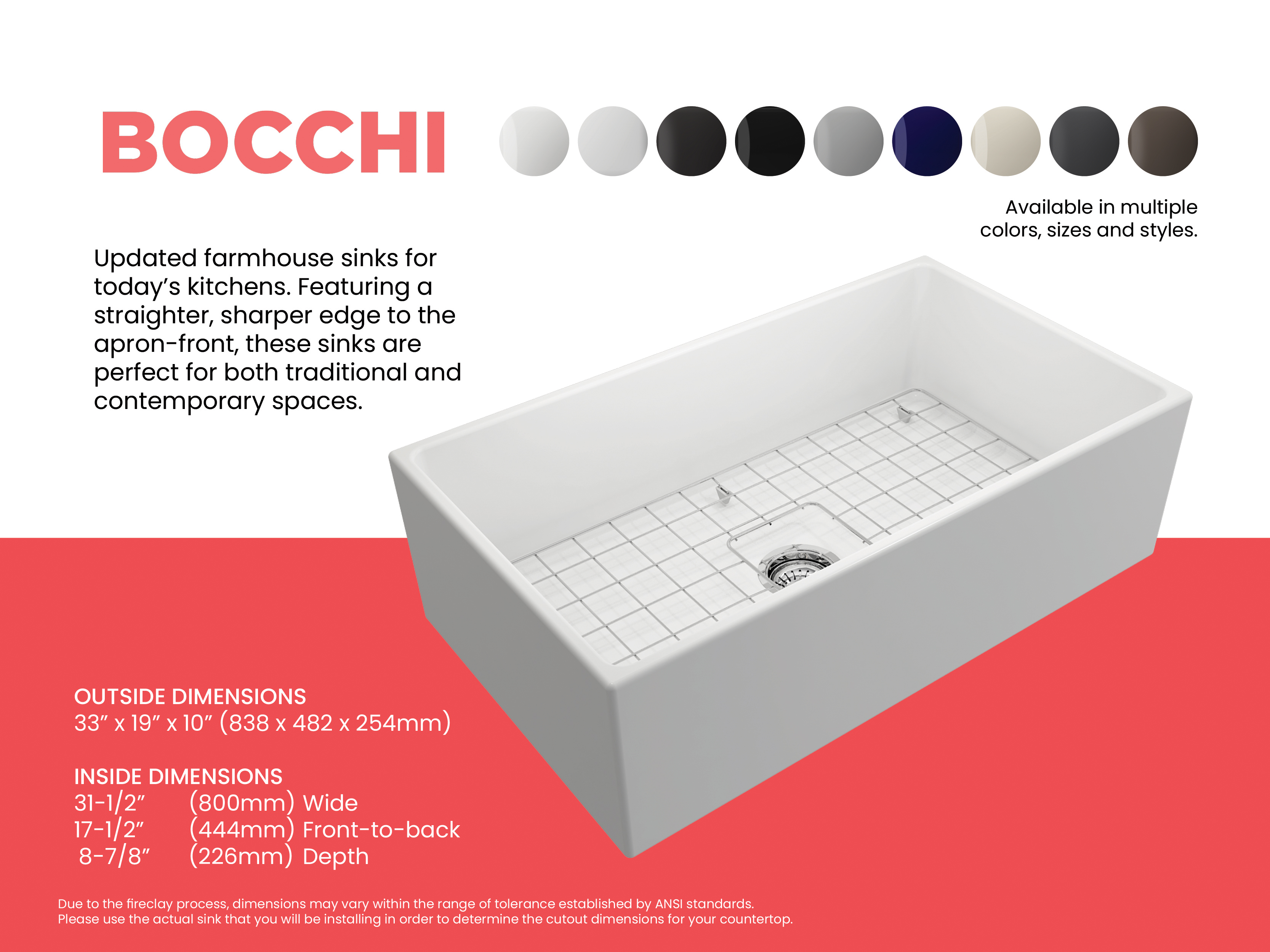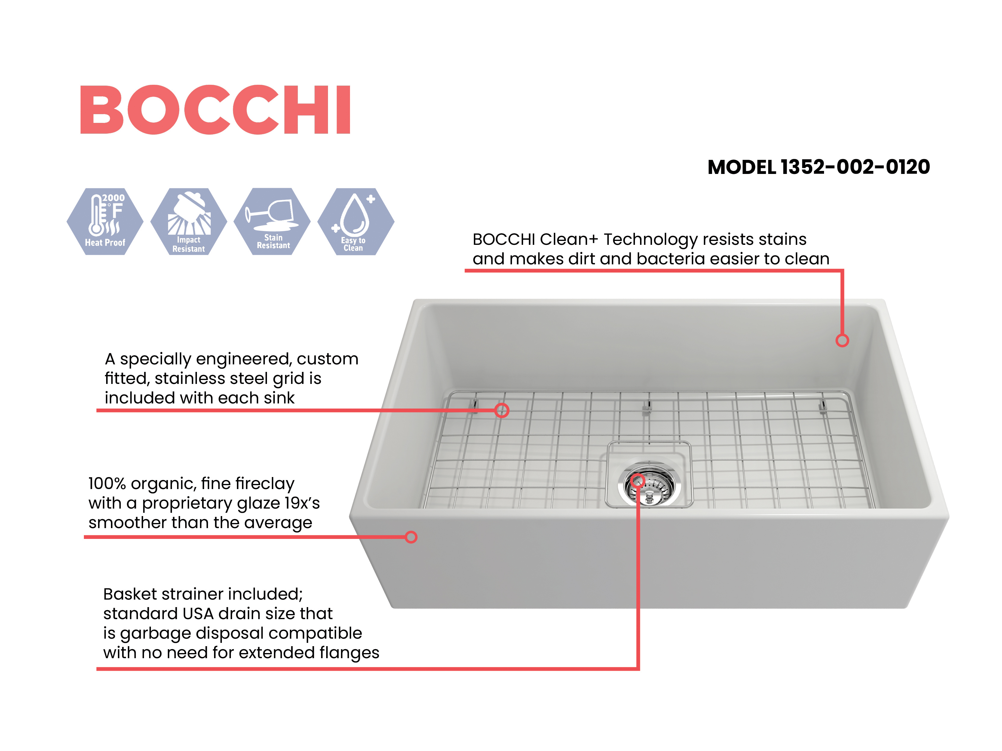 BOCCHI Farmhouse Sinks bring back the ultimate material to your kitchen. Fireclay, a 100% natural organic and recyclable material used by craftsman for centuries to create timeless appliances has now returned to your kitchen. With the firing in our kilns up to 2000°F temperatures, Fireclay becomes the most durable material used in today's kitchens. Thus, dealing with extreme heat coming from pots and pans is definitely not a problem. Due to their special glaze coating fused with the fireclay body, our sinks have a non-porous, uniform, scratch and stain resistant surface. With its protective bottom grid and distinctive looks, BOCCHI Farmhouse Sinks are truly crafted to match your design and functional desires.