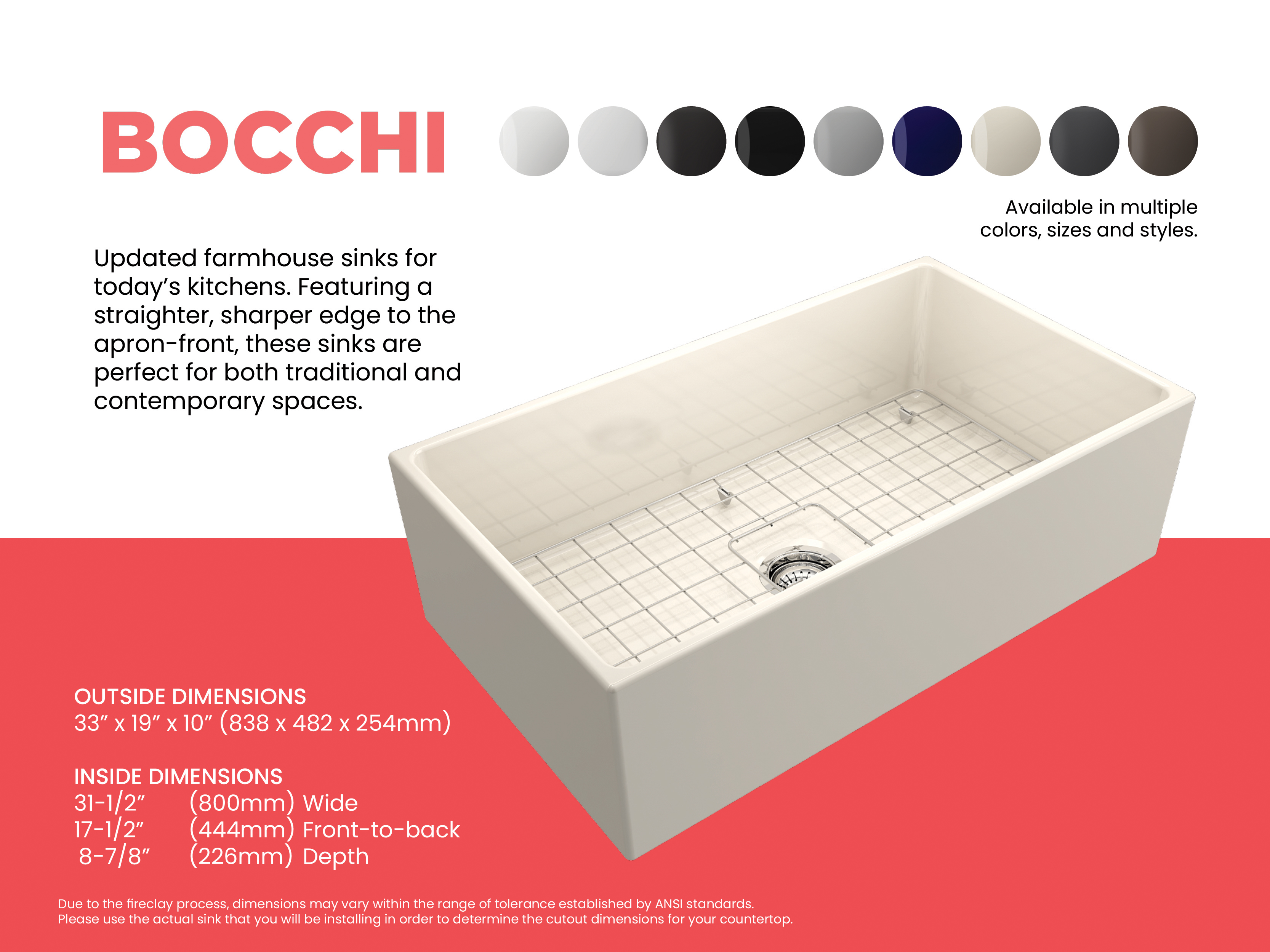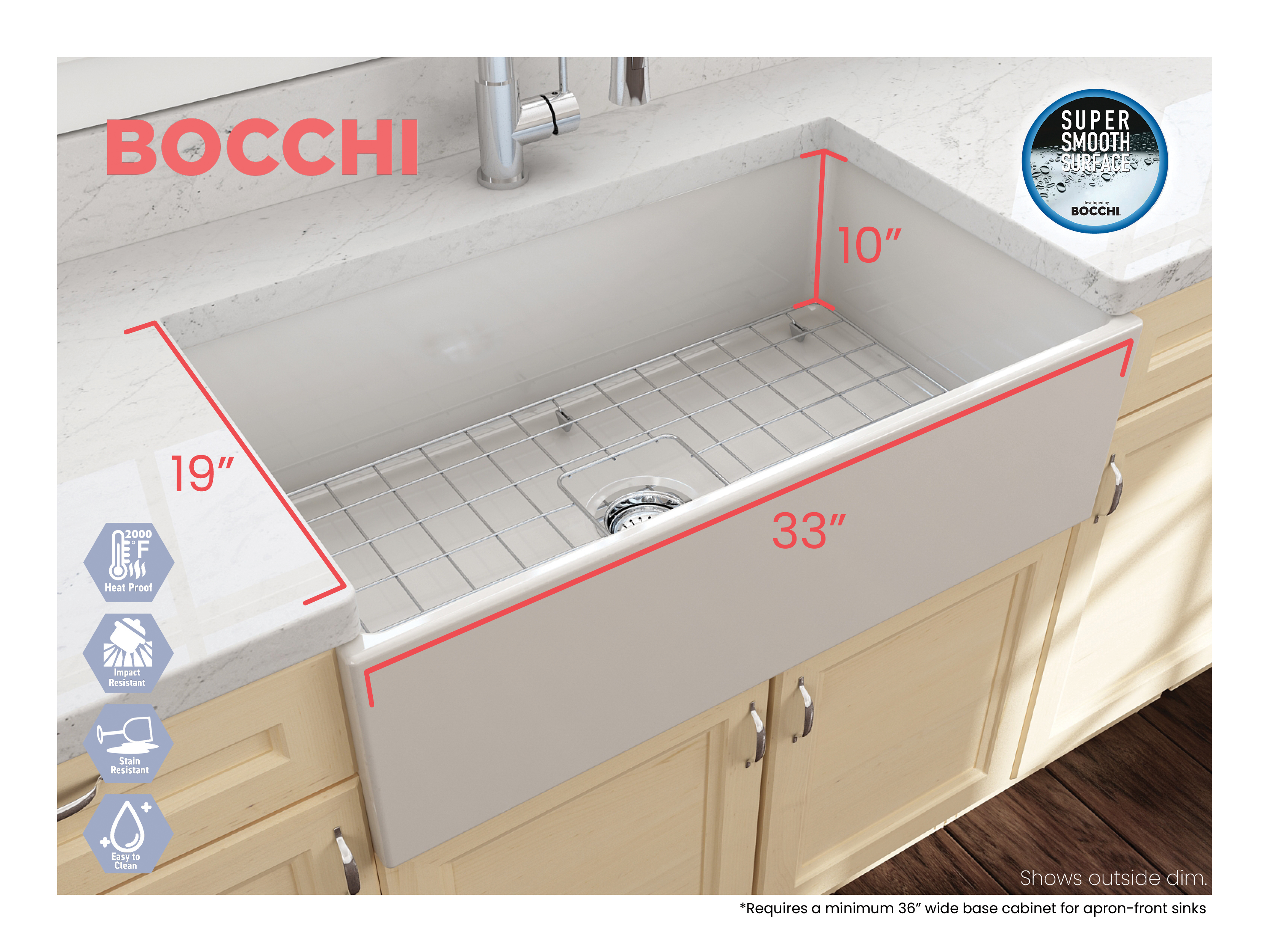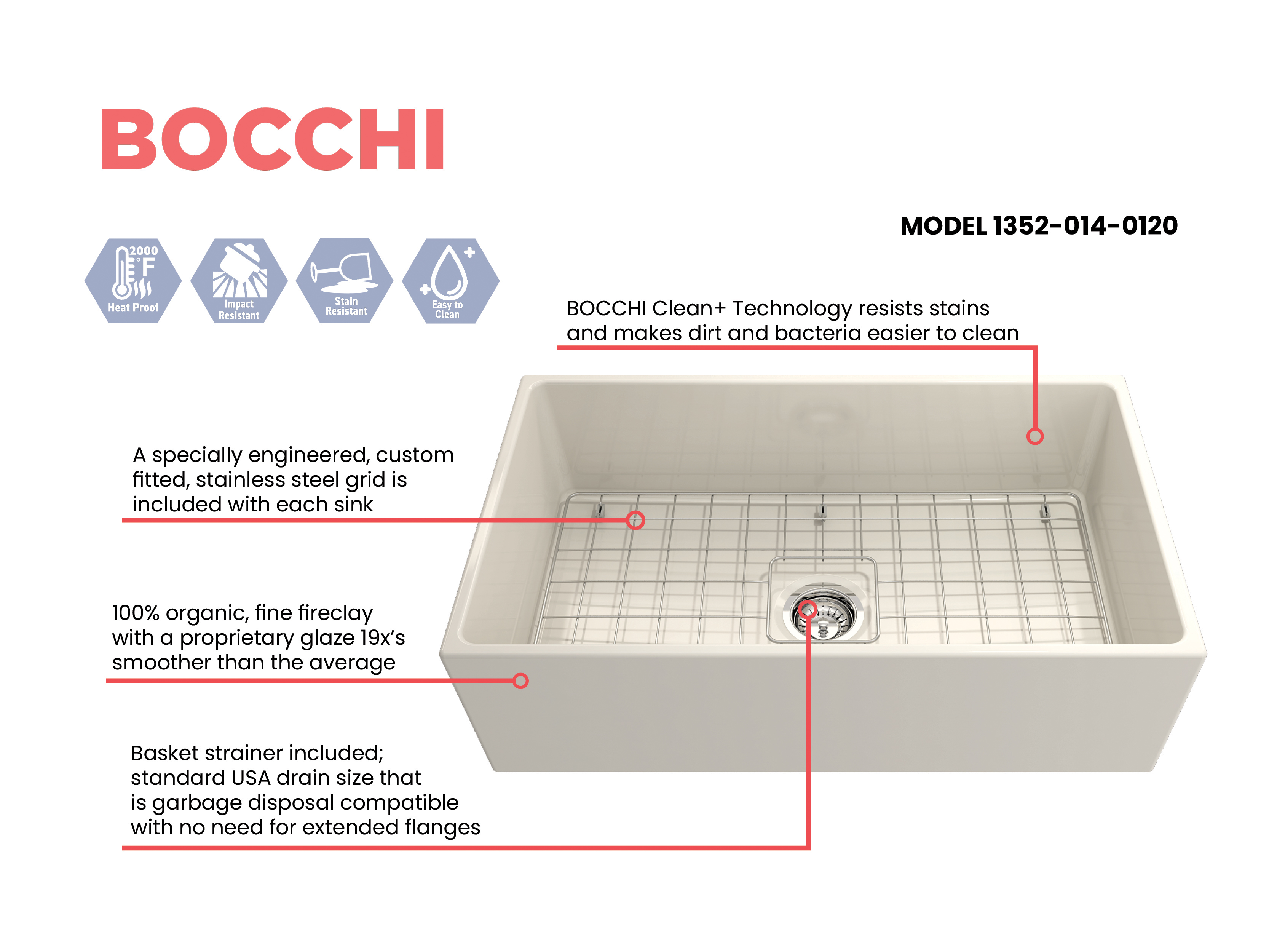 BOCCHI Farmhouse Sinks bring back the ultimate material to your kitchen. Fireclay, a 100% natural organic and recyclable material used by craftsman for centuries to create timeless appliances has now returned to your kitchen. With the firing in our kilns up to 2000°F temperatures, Fireclay becomes the most durable material used in today's kitchens. Thus, dealing with extreme heat coming from pots and pans is definitely not a problem. Due to their special glaze coating fused with the fireclay body, our sinks have a non-porous, uniform, scratch and stain resistant surface. With its protective bottom grid and distinctive looks, BOCCHI Farmhouse Sinks are truly crafted to match your design and functional desires.