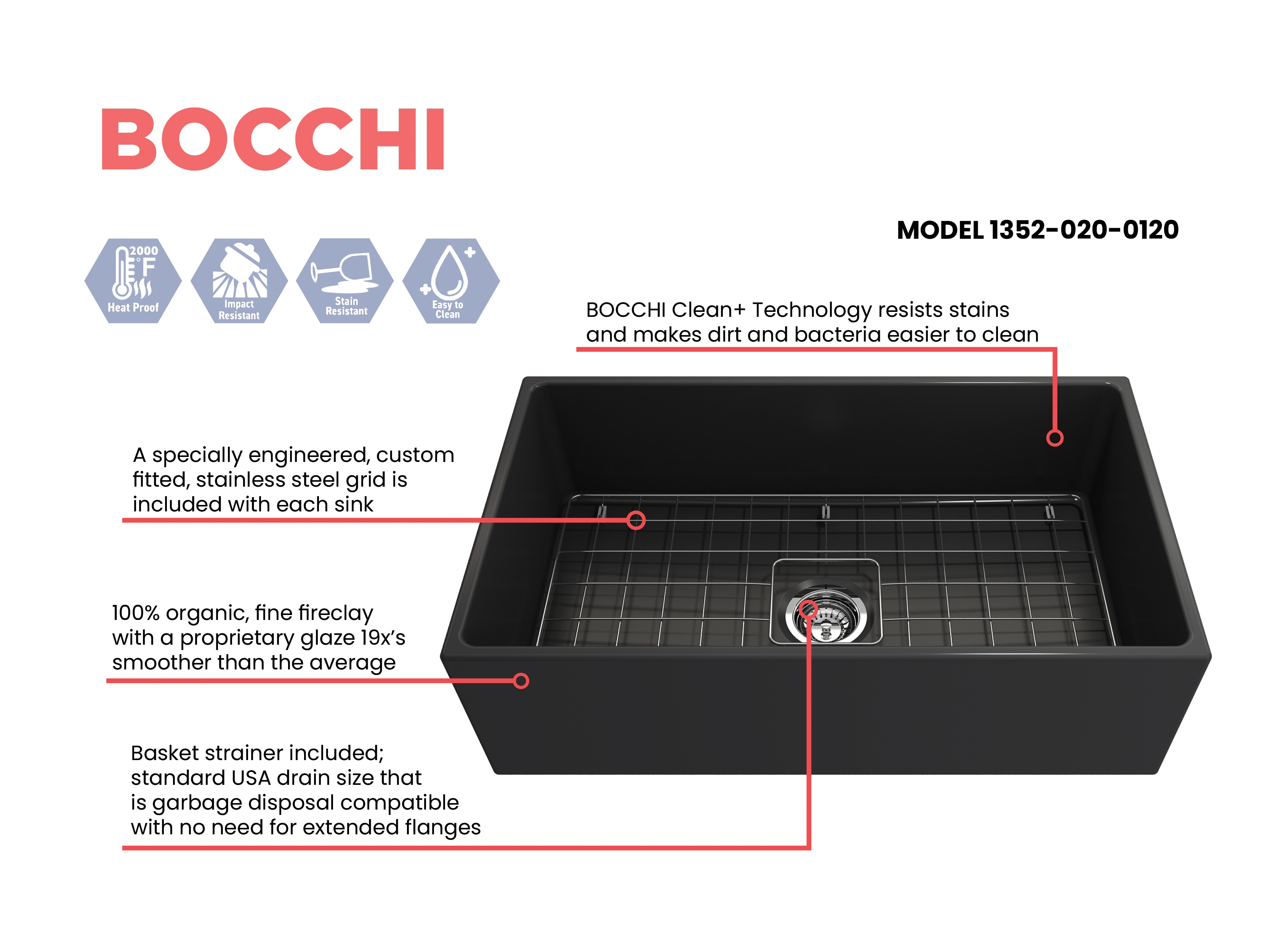 BOCCHI Farmhouse Sinks bring back the ultimate material to your kitchen. Fireclay, a 100% natural organic and recyclable material used by craftsman for centuries to create timeless appliances has now returned to your kitchen. With the firing in our kilns up to 2000°F temperatures, Fireclay becomes the most durable material used in today's kitchens. Thus, dealing with extreme heat coming from pots and pans is definitely not a problem. Due to their special glaze coating fused with the fireclay body, our sinks have a non-porous, uniform, scratch and stain resistant surface. With its protective bottom grid and distinctive looks, BOCCHI Farmhouse Sinks are truly crafted to match your design and functional desires.
