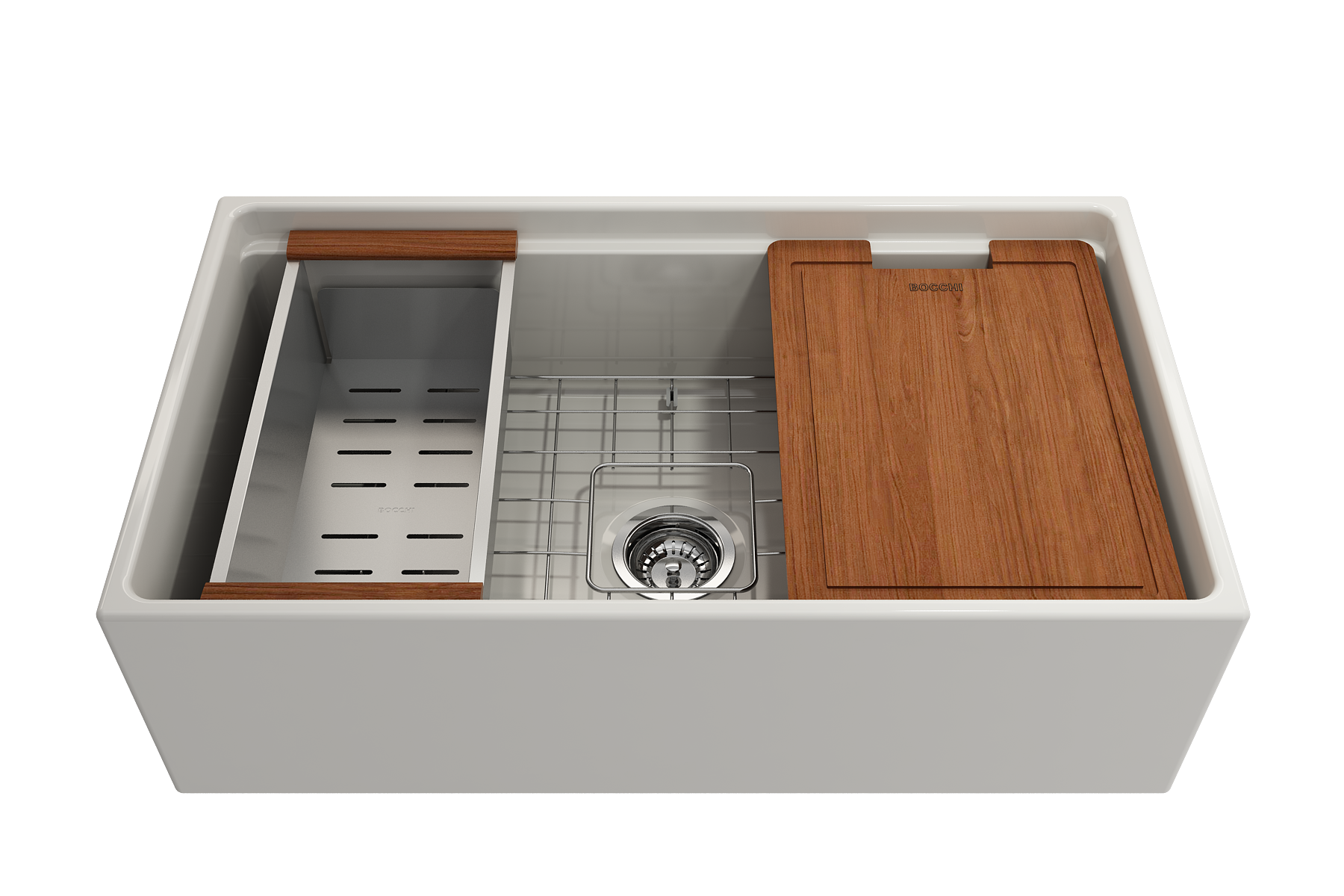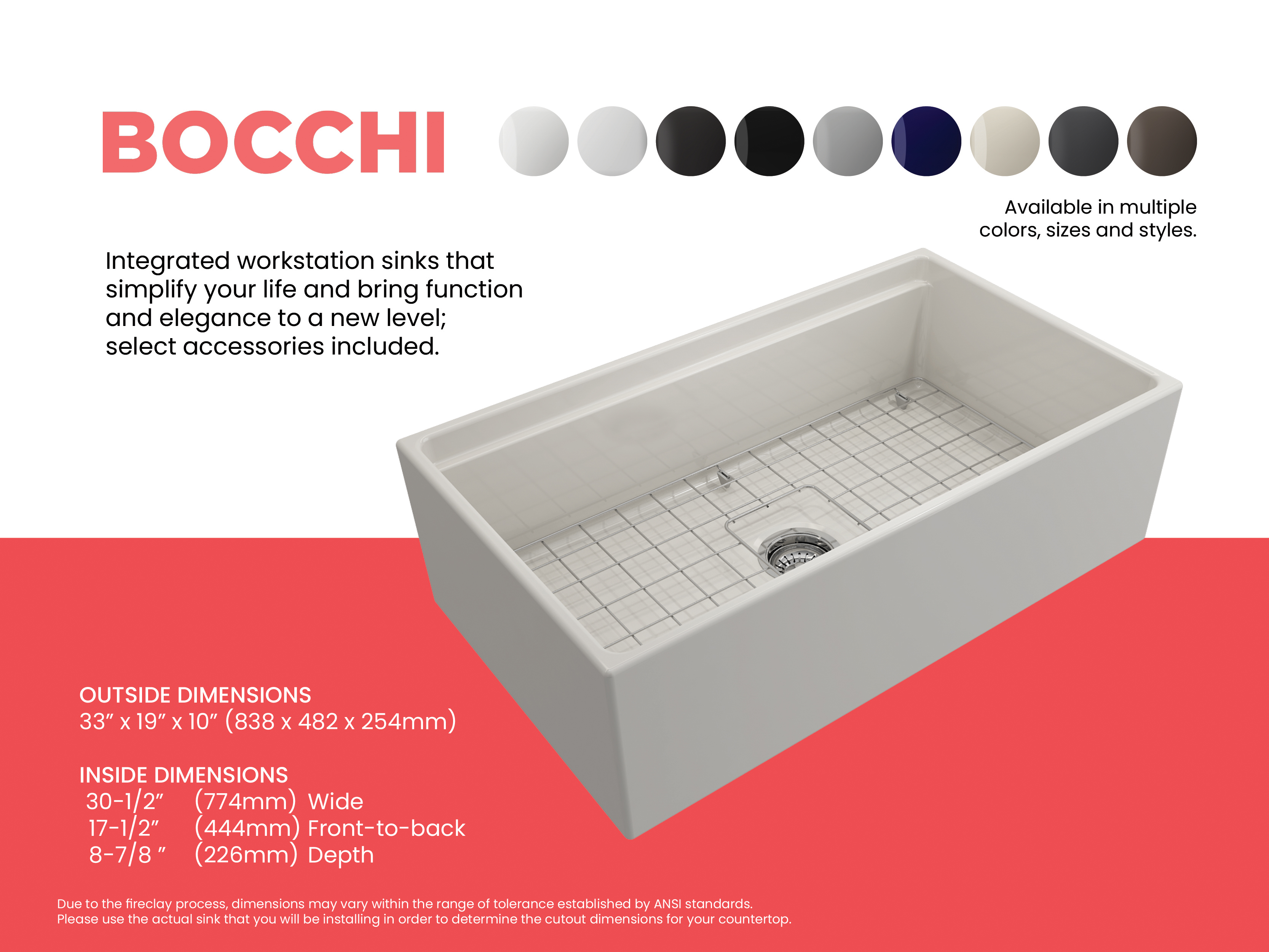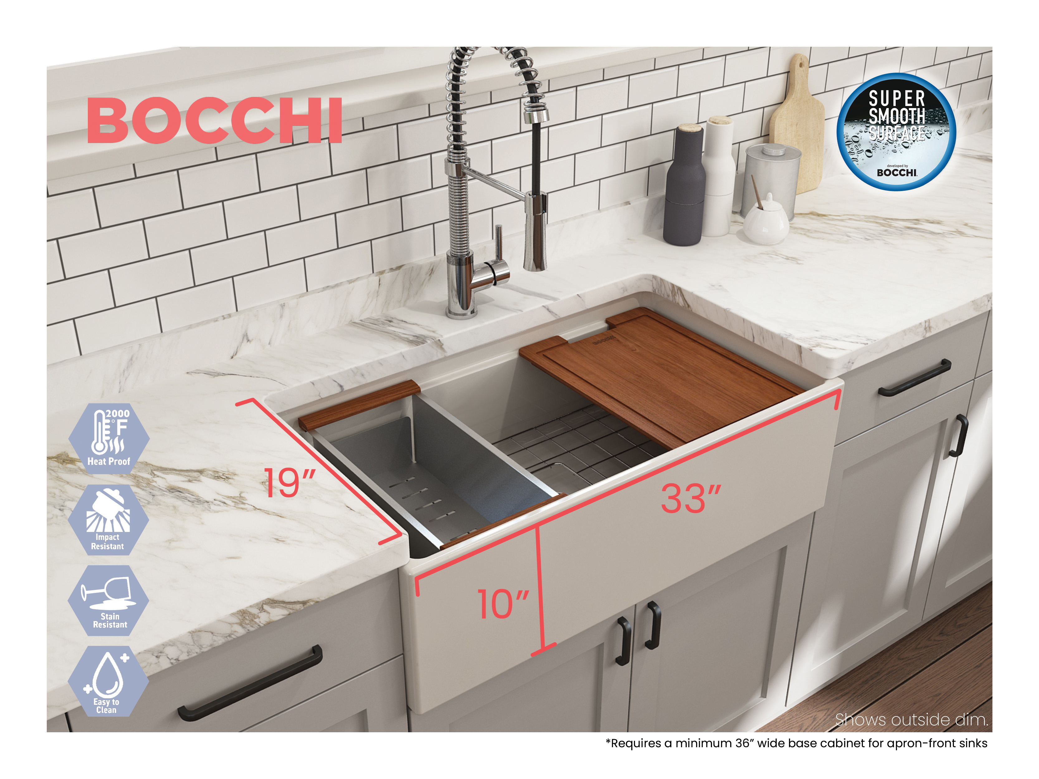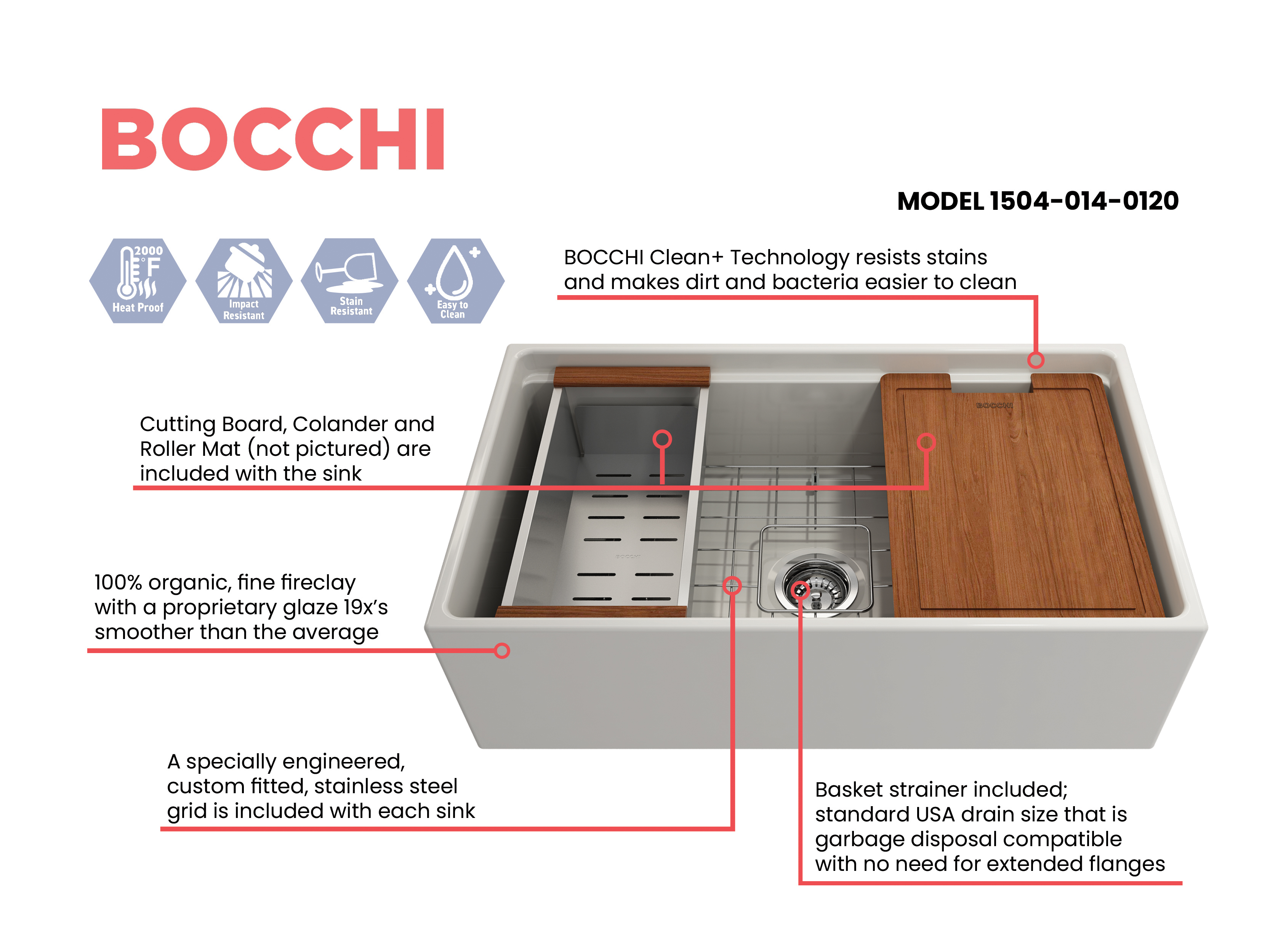 BOCCHI Farmhouse Sinks bring back the ultimate material to your kitchen. Fireclay, a 100% natural organic and recyclable material used by craftsman for centuries to create timeless appliances has now returned to your kitchen. With the firing in our kilns up to 2000°F temperatures, Fireclay becomes the most durable material used in today's kitchens. Thus, dealing with extreme heat coming from pots and pans is definitely not a problem. Due to their special glaze coating fused with the fireclay body, our sinks have a non-porous, uniform, scratch and stain resistant surface. With its protective bottom grid and distinctive looks, BOCCHI Farmhouse Sinks are truly crafted to match your design and functional desires.