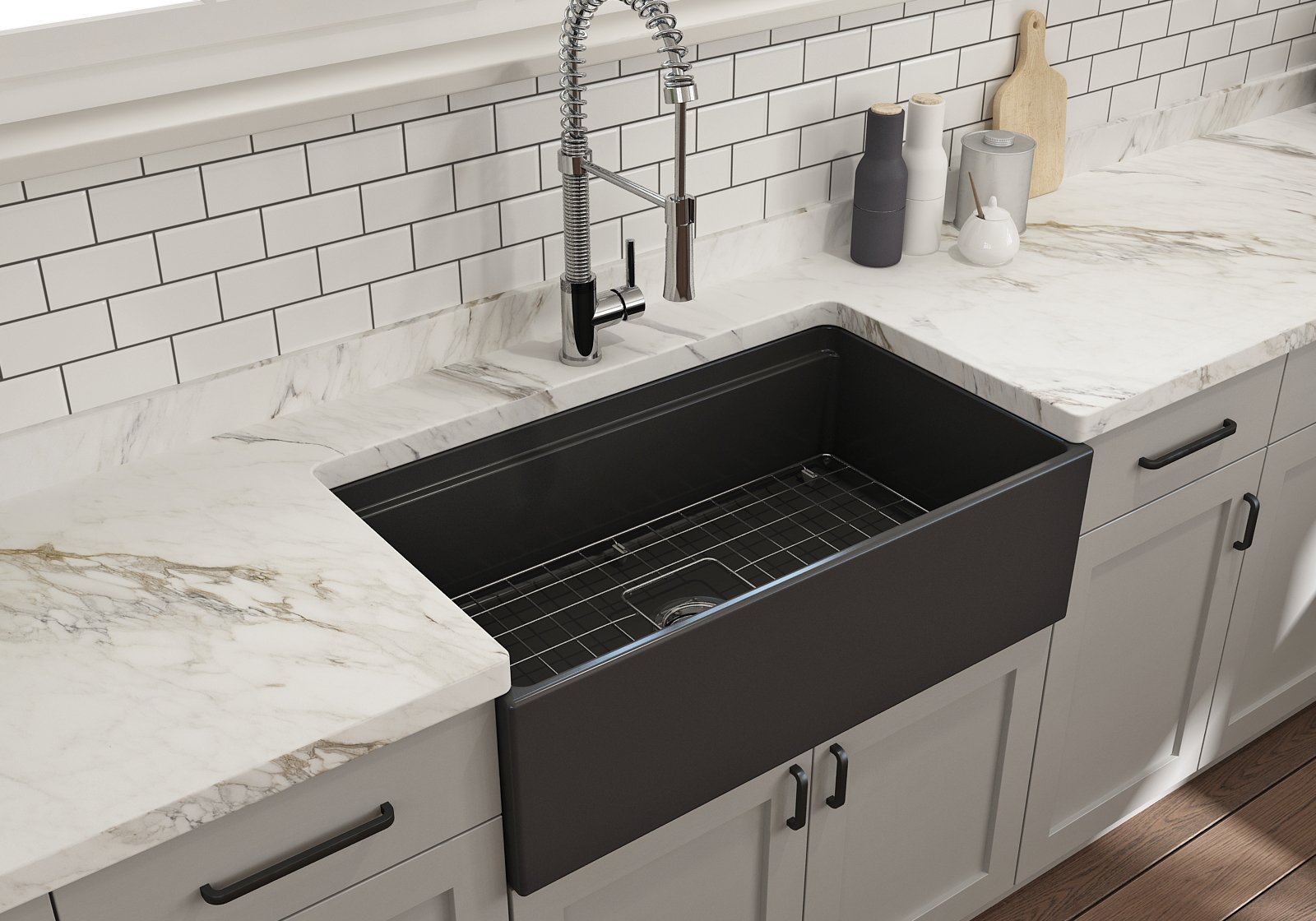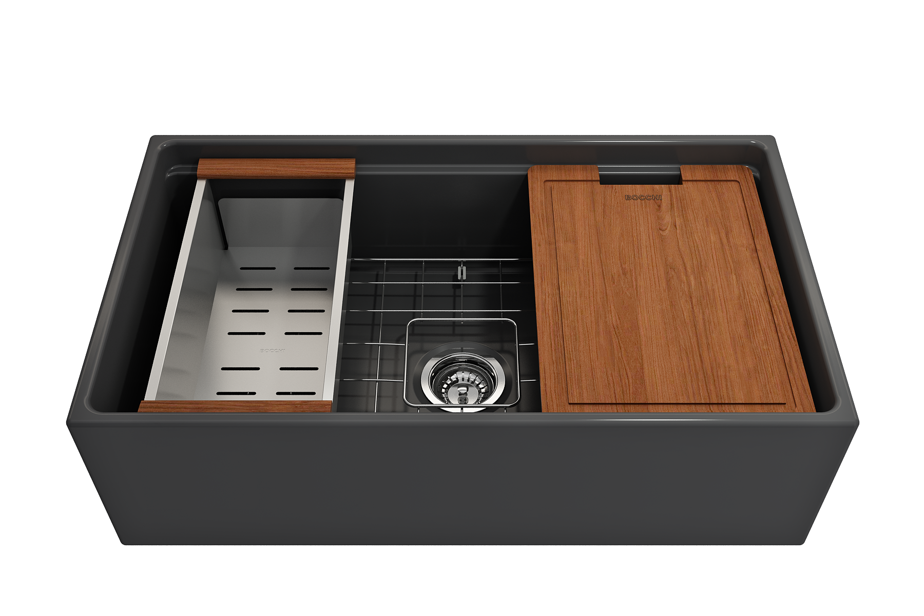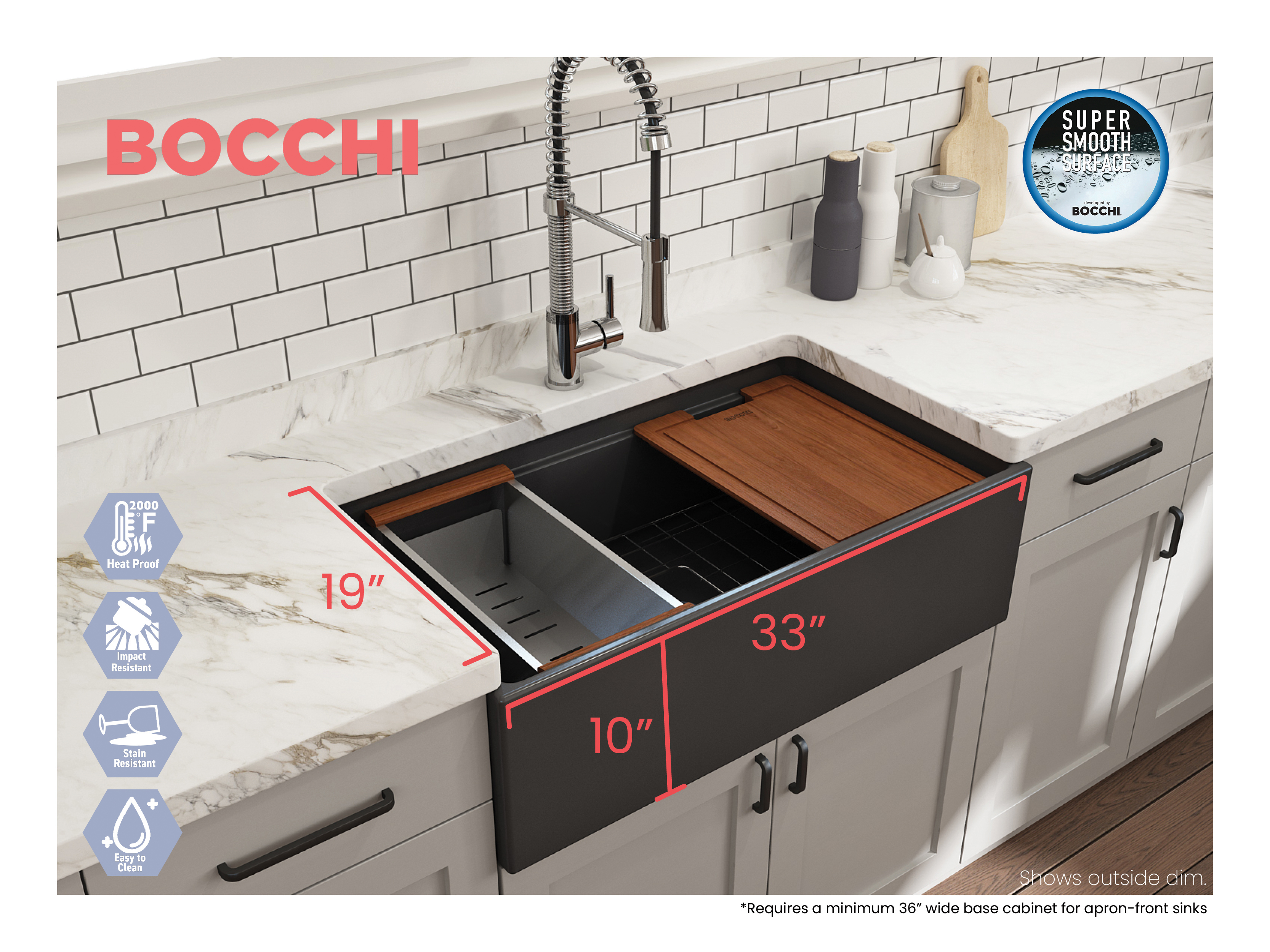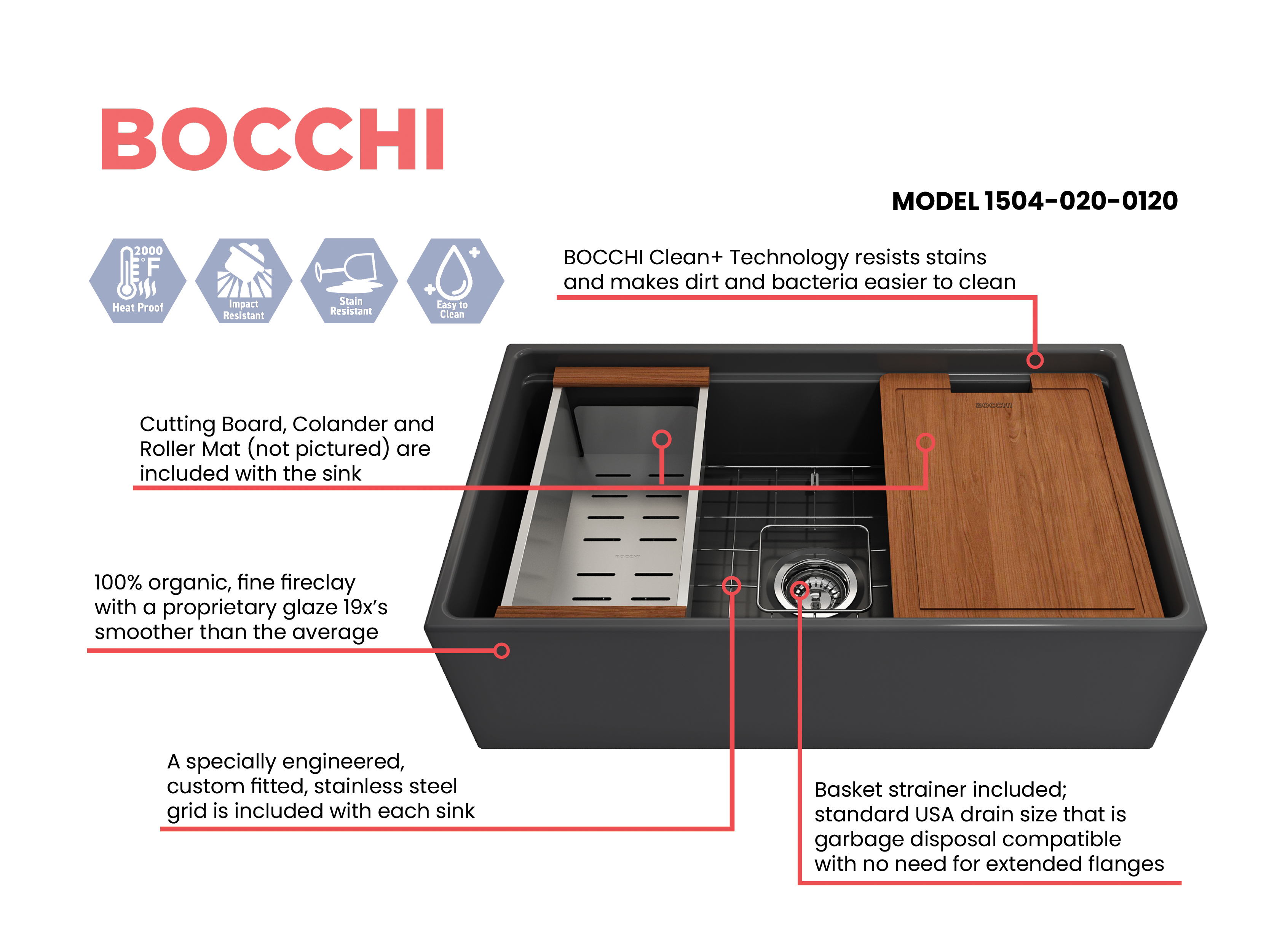 BOCCHI Farmhouse Sinks bring back the ultimate material to your kitchen. Fireclay, a 100% natural organic and recyclable material used by craftsman for centuries to create timeless appliances has now returned to your kitchen. With the firing in our kilns up to 2000°F temperatures, Fireclay becomes the most durable material used in today's kitchens. Thus, dealing with extreme heat coming from pots and pans is definitely not a problem. Due to their special glaze coating fused with the fireclay body, our sinks have a non-porous, uniform, scratch and stain resistant surface. With its protective bottom grid and distinctive looks, BOCCHI Farmhouse Sinks are truly crafted to match your design and functional desires.