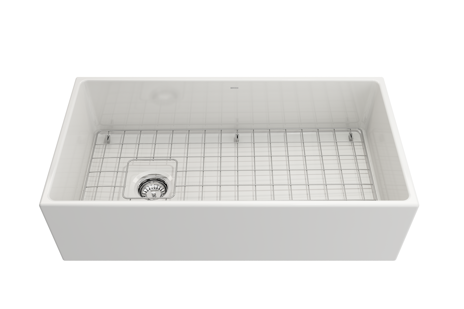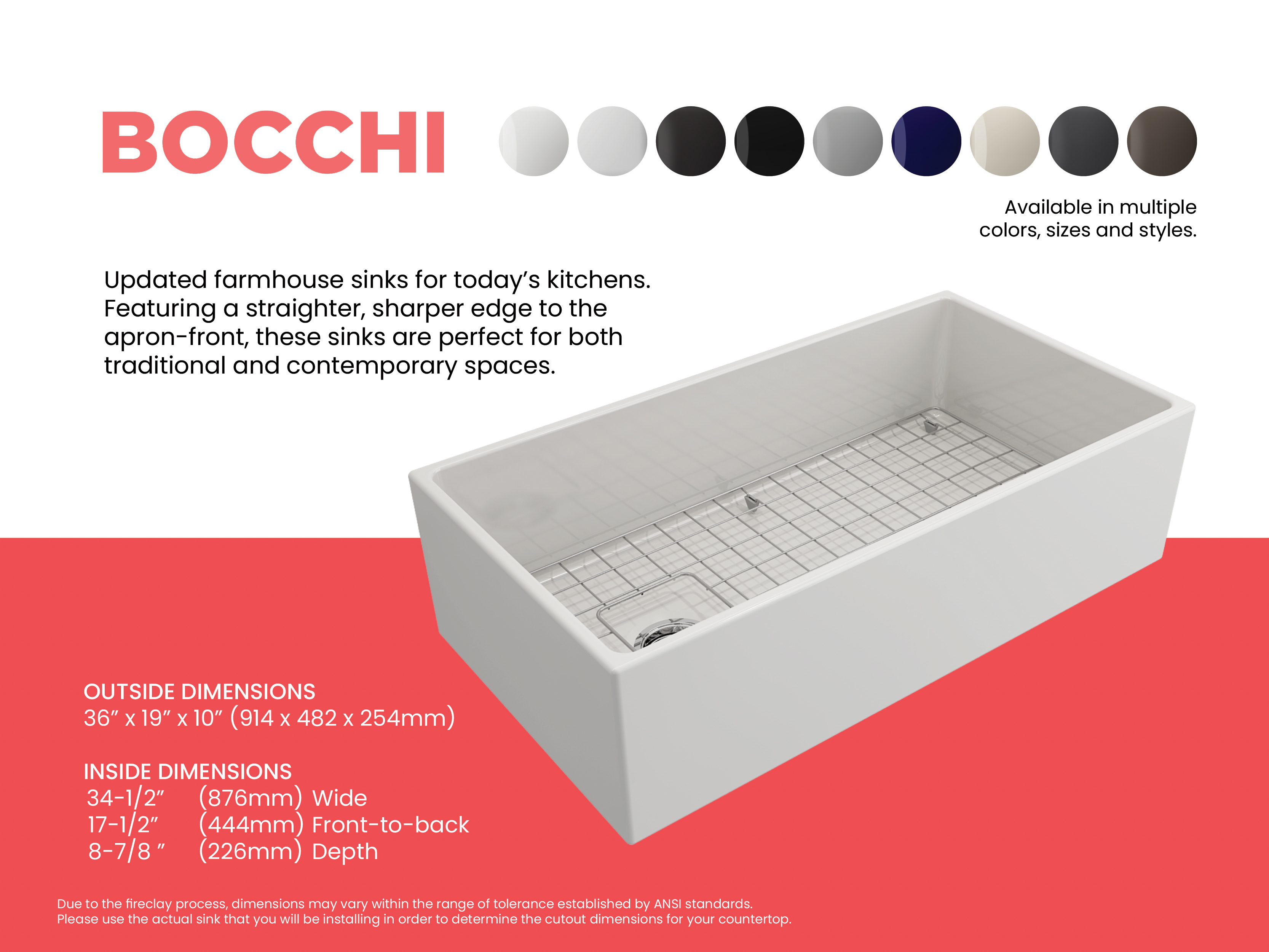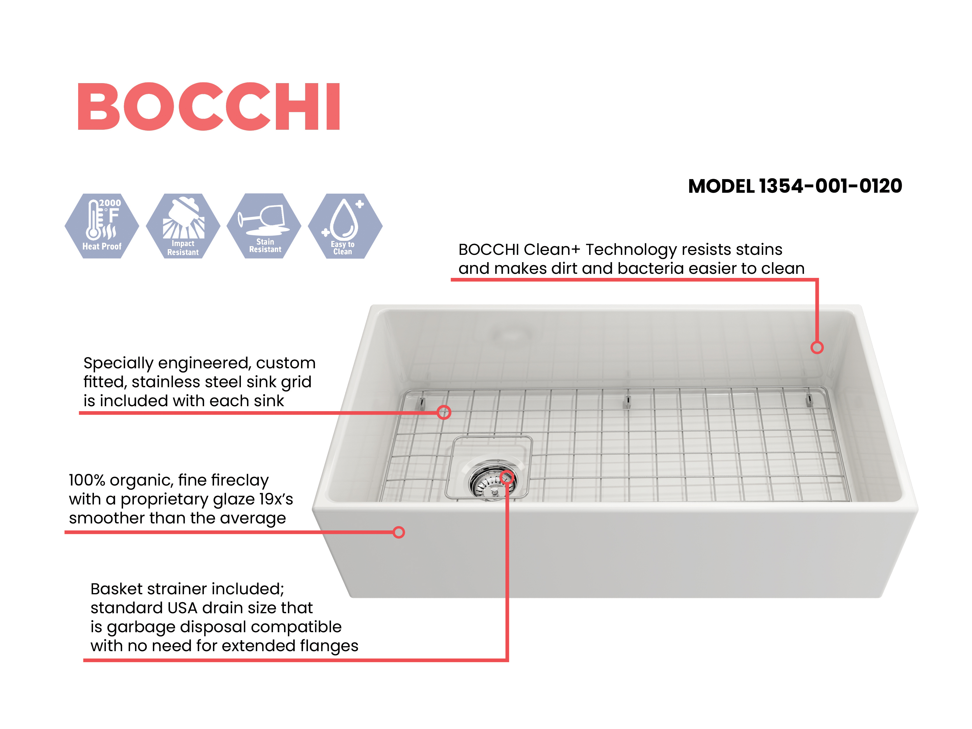 BOCCHI Farmhouse Sinks bring back the ultimate material to your kitchen. Fireclay, a 100% natural organic and recyclable material used by craftsman for centuries to create timeless appliances has now returned to your kitchen. With the firing in our kilns up to 2000°F temperatures, Fireclay becomes the most durable material used in today's kitchens. Thus, dealing with extreme heat coming from pots and pans is definitely not a problem. Due to their special glaze coating fused with the fireclay body, our sinks have a non-porous, uniform, scratch and stain resistant surface. With its protective bottom grid and distinctive looks, BOCCHI Farmhouse Sinks are truly crafted to match your design and functional desires.