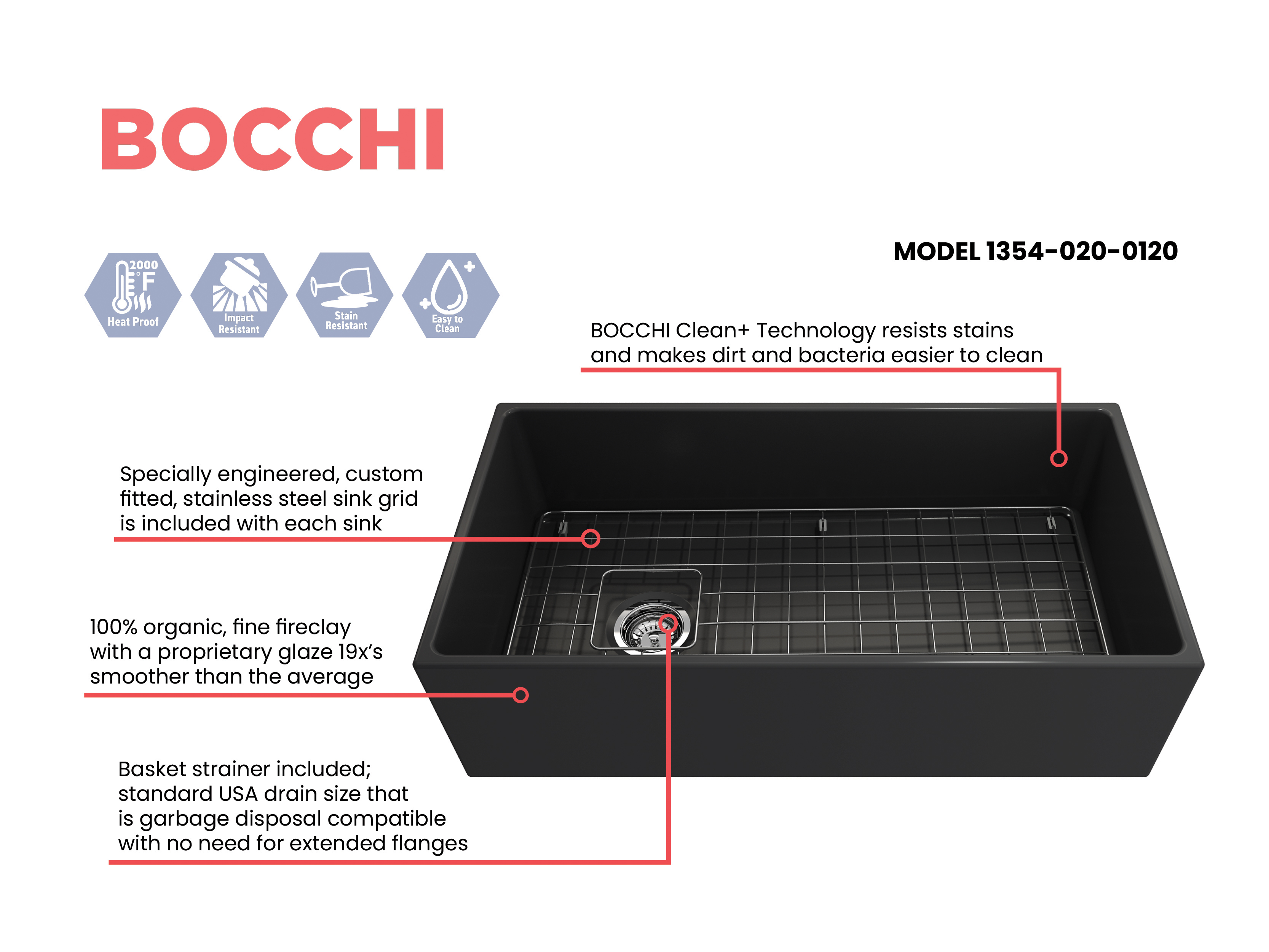 BOCCHI Farmhouse Sinks bring back the ultimate material to your kitchen. Fireclay, a 100% natural organic and recyclable material used by craftsman for centuries to create timeless appliances has now returned to your kitchen. With the firing in our kilns up to 2000°F temperatures, Fireclay becomes the most durable material used in today's kitchens. Thus, dealing with extreme heat coming from pots and pans is definitely not a problem. Due to their special glaze coating fused with the fireclay body, our sinks have a non-porous, uniform, scratch and stain resistant surface. With its protective bottom grid and distinctive looks, BOCCHI Farmhouse Sinks are truly crafted to match your design and functional desires.