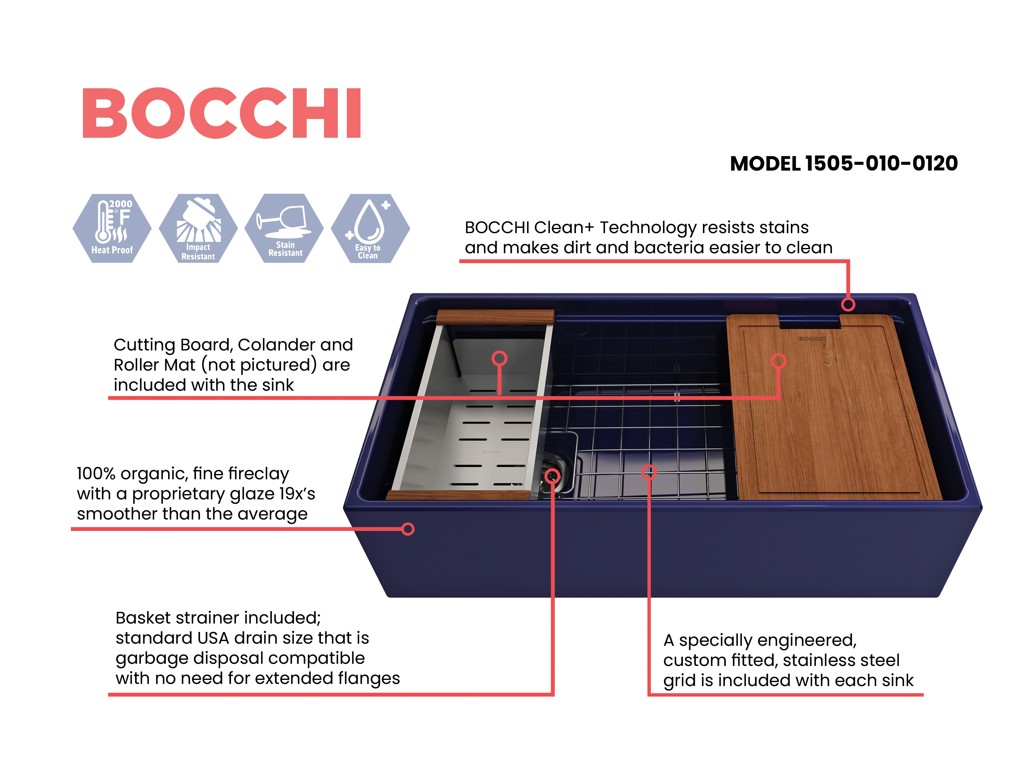 BOCCHI Farmhouse Sinks bring back the ultimate material to your kitchen. Fireclay, a 100% natural organic and recyclable material used by craftsman for centuries to create timeless appliances has now returned to your kitchen. With the firing in our kilns up to 2000°F temperatures, Fireclay becomes the most durable material used in today's kitchens. Thus, dealing with extreme heat coming from pots and pans is definitely not a problem. Due to their special glaze coating fused with the fireclay body, our sinks have a non-porous, uniform, scratch and stain resistant surface. With its protective bottom grid and distinctive looks, BOCCHI Farmhouse Sinks are truly crafted to match your design and functional desires.