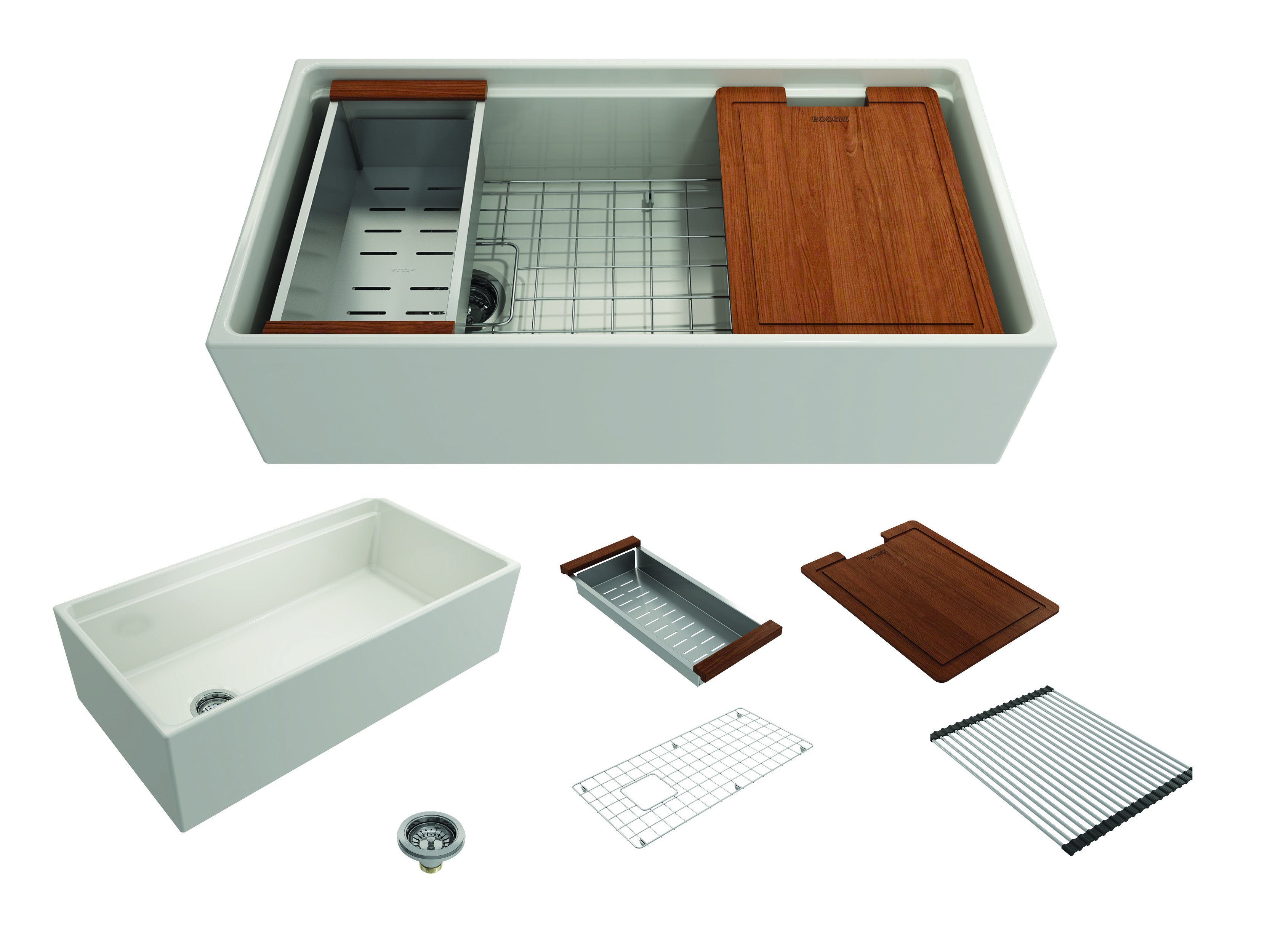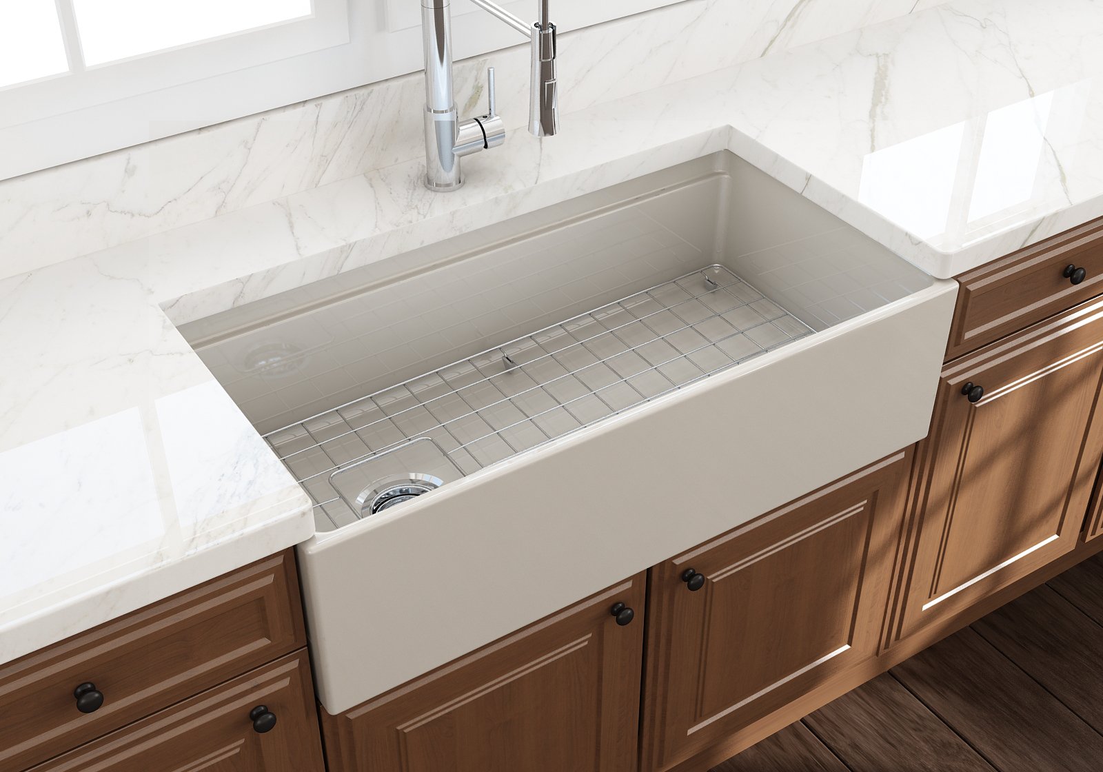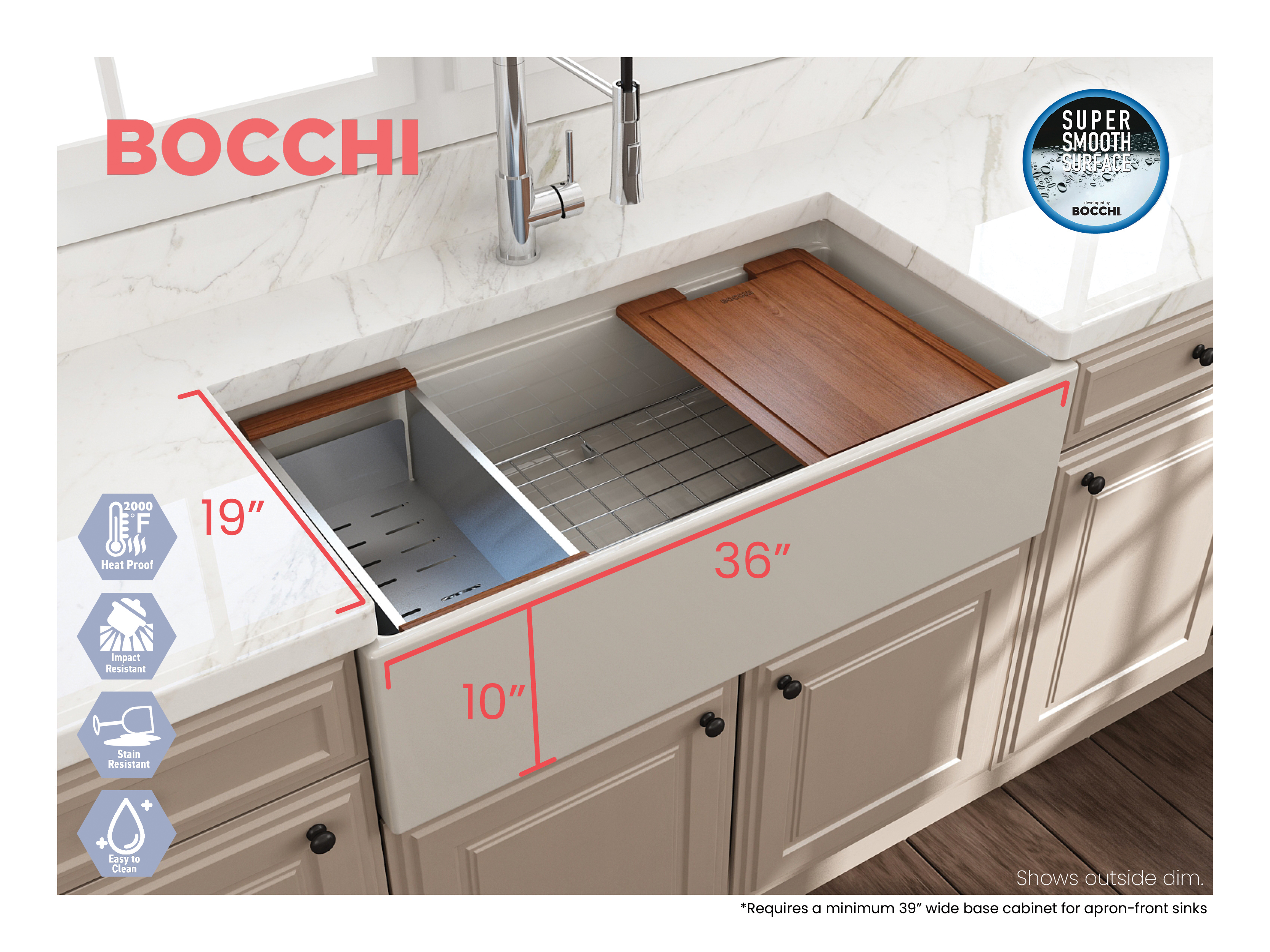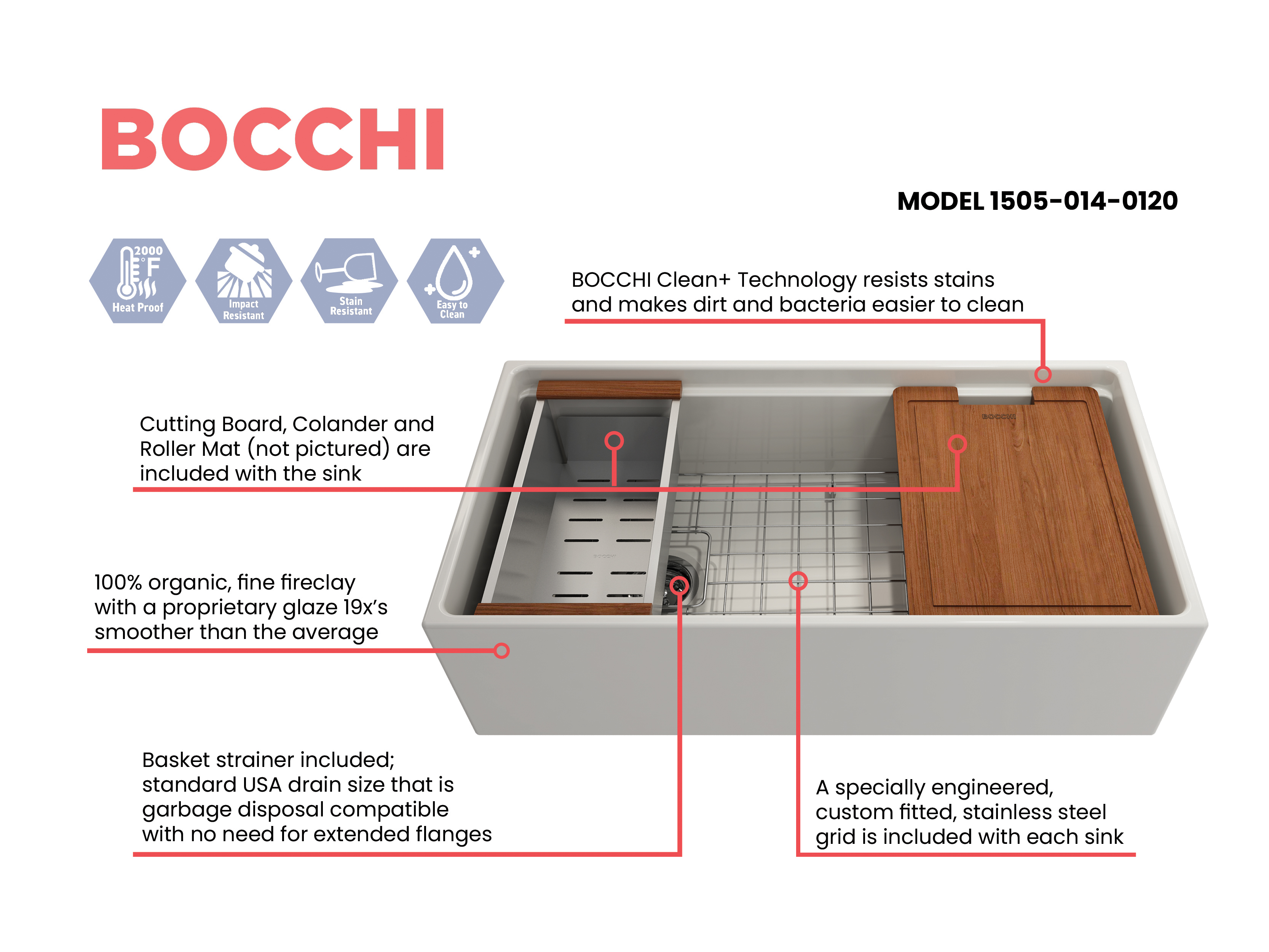 BOCCHI Farmhouse Sinks bring back the ultimate material to your kitchen. Fireclay, a 100% natural organic and recyclable material used by craftsman for centuries to create timeless appliances has now returned to your kitchen. With the firing in our kilns up to 2000°F temperatures, Fireclay becomes the most durable material used in today's kitchens. Thus, dealing with extreme heat coming from pots and pans is definitely not a problem. Due to their special glaze coating fused with the fireclay body, our sinks have a non-porous, uniform, scratch and stain resistant surface. With its protective bottom grid and distinctive looks, BOCCHI Farmhouse Sinks are truly crafted to match your design and functional desires.