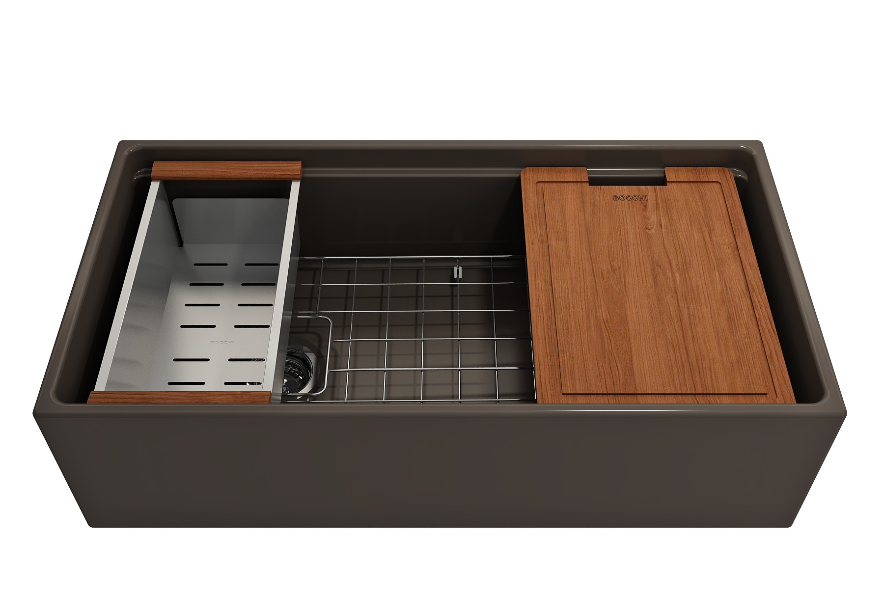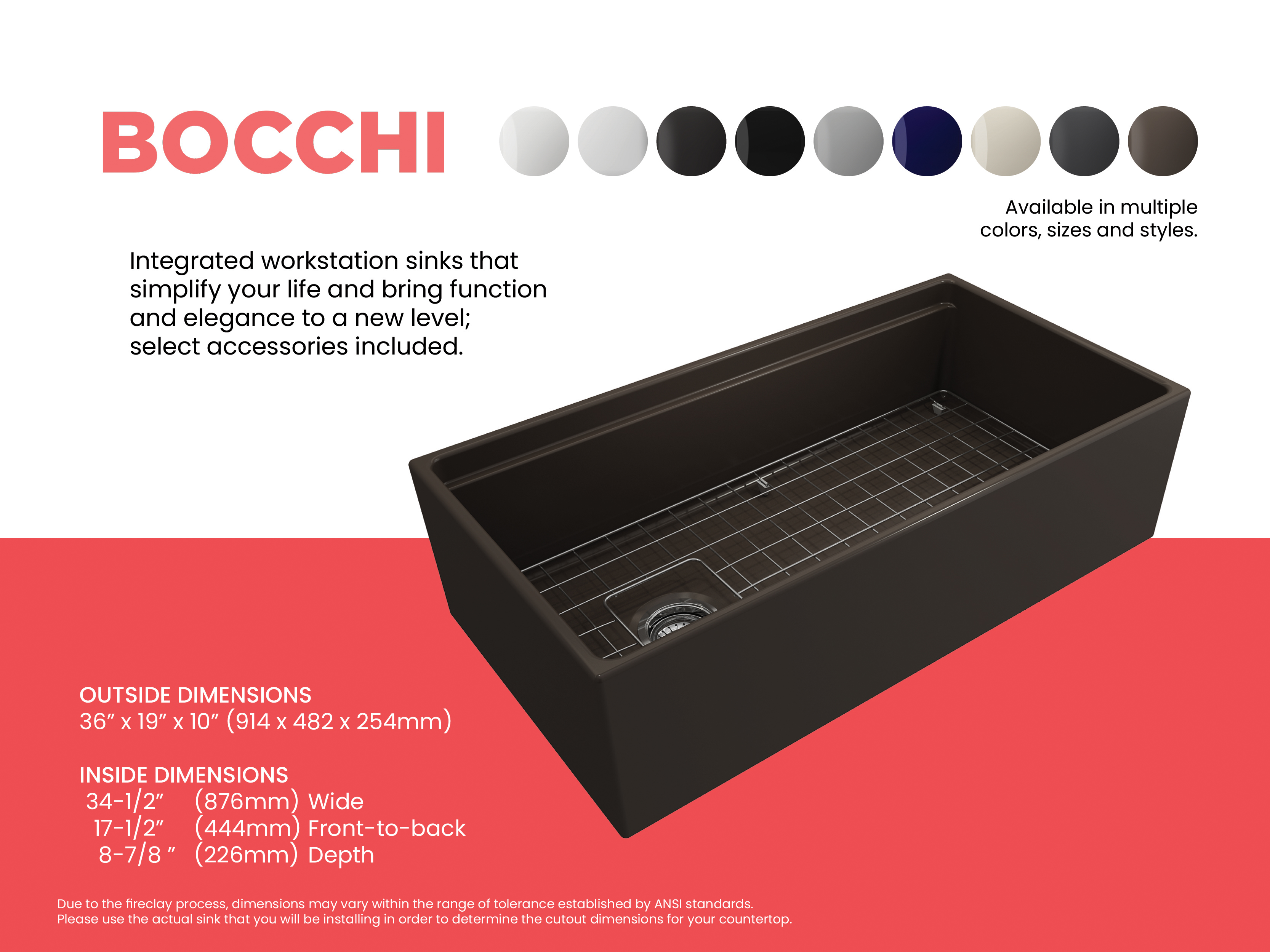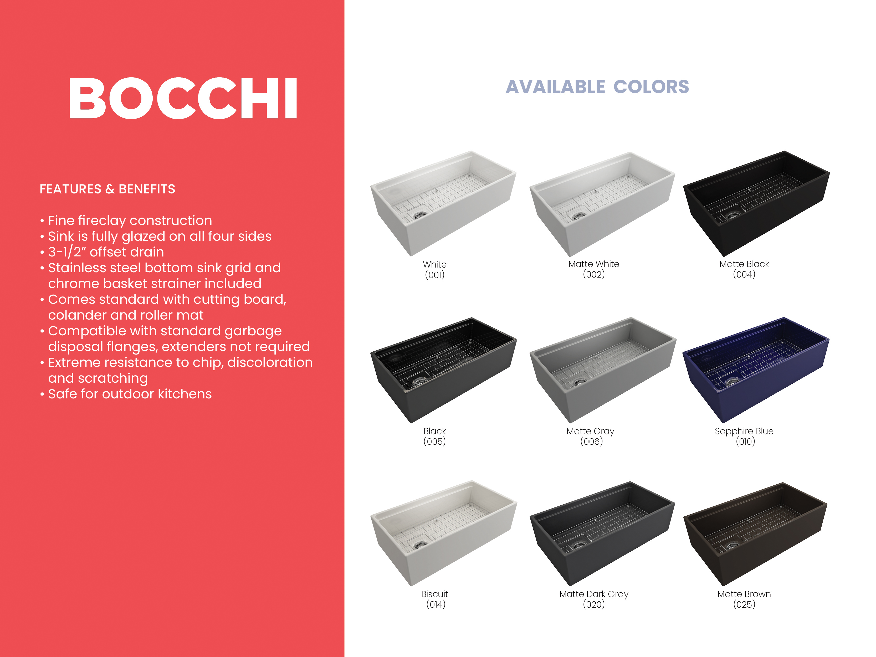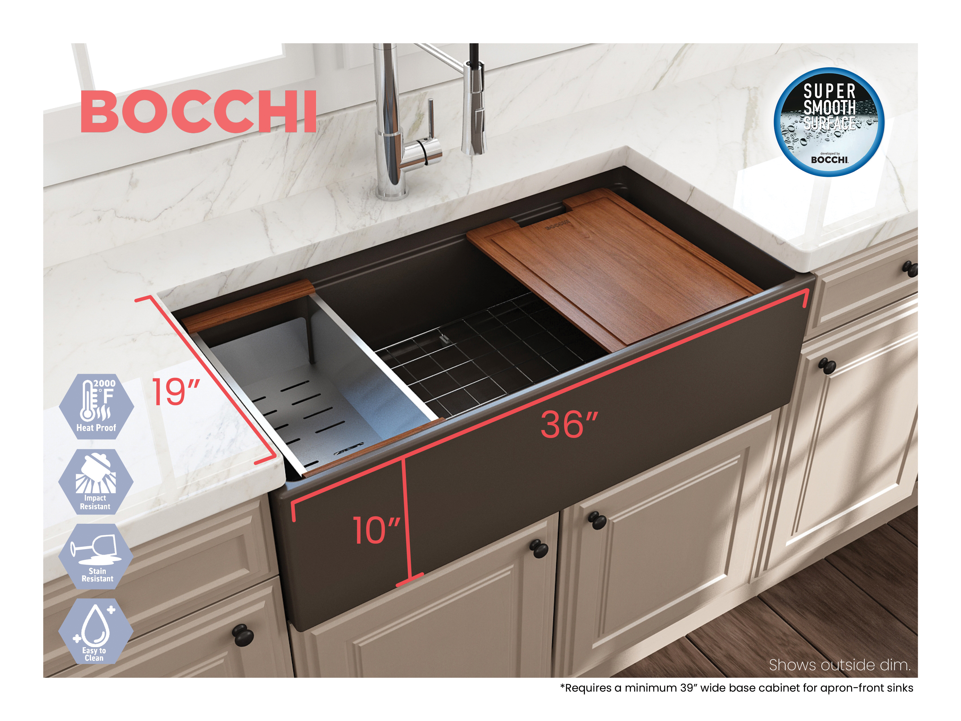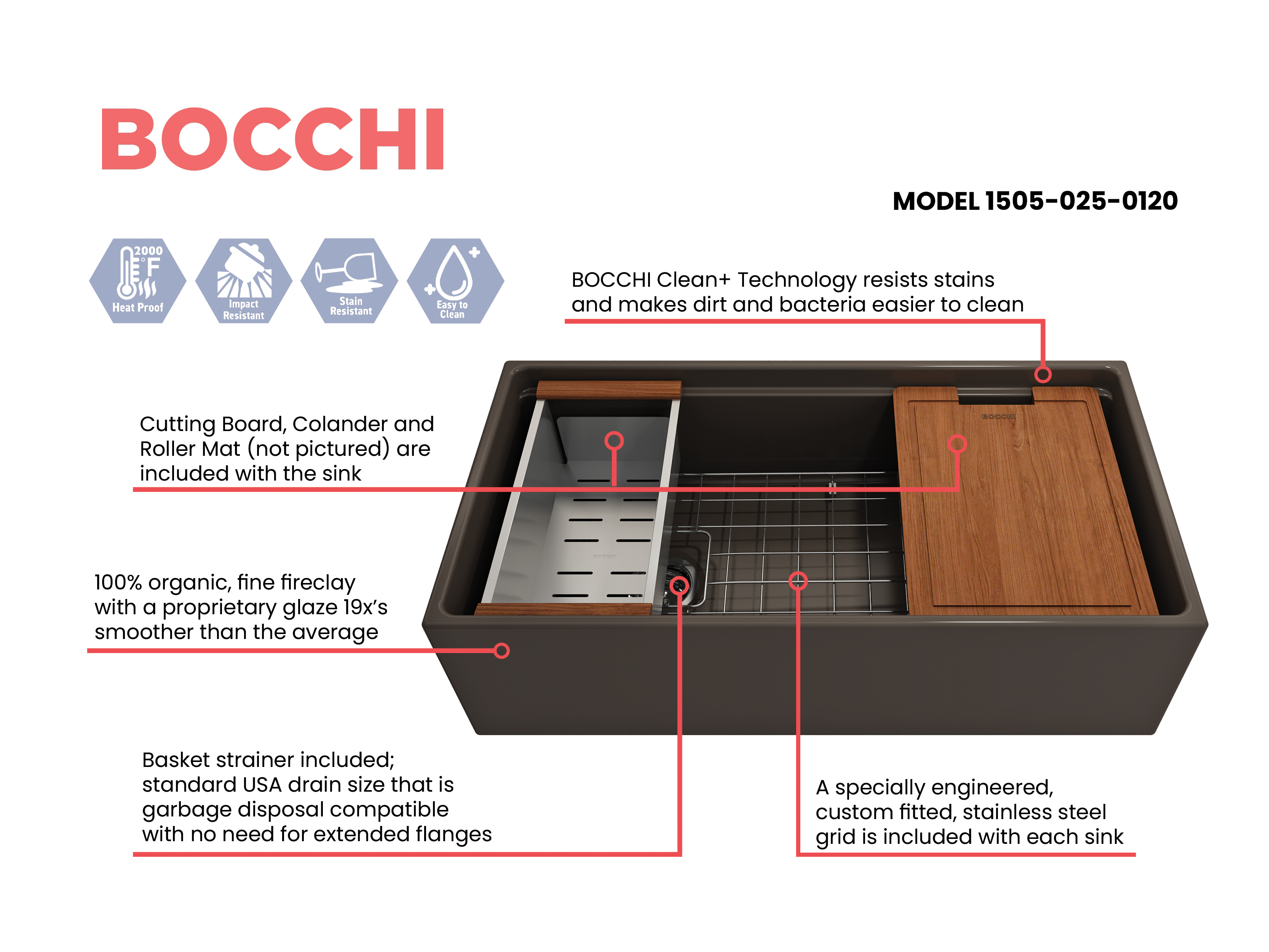 BOCCHI Farmhouse Sinks bring back the ultimate material to your kitchen. Fireclay, a 100% natural organic and recyclable material used by craftsman for centuries to create timeless appliances has now returned to your kitchen. With the firing in our kilns up to 2000°F temperatures, Fireclay becomes the most durable material used in today's kitchens. Thus, dealing with extreme heat coming from pots and pans is definitely not a problem. Due to their special glaze coating fused with the fireclay body, our sinks have a non-porous, uniform, scratch and stain resistant surface. With its protective bottom grid and distinctive looks, BOCCHI Farmhouse Sinks are truly crafted to match your design and functional desires.
