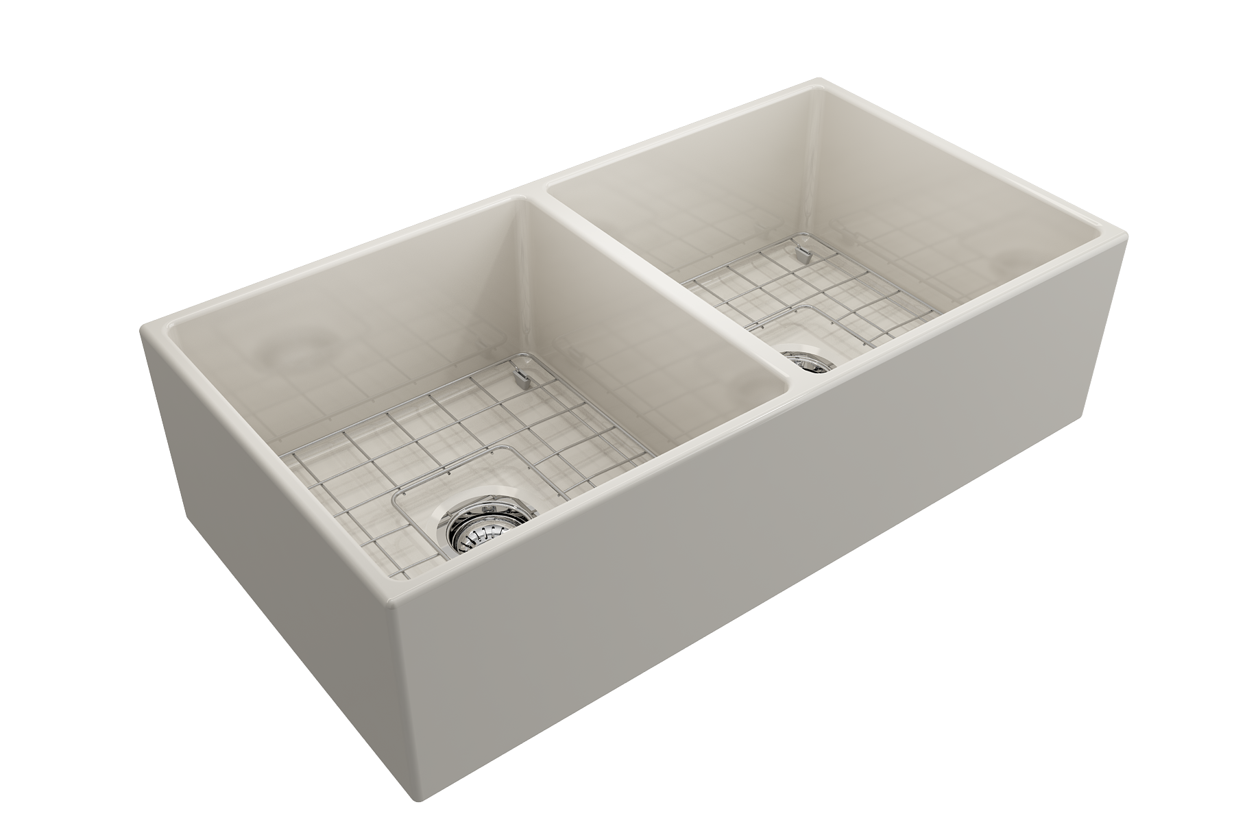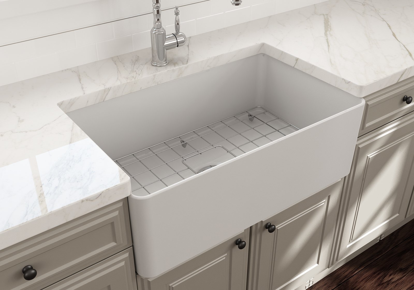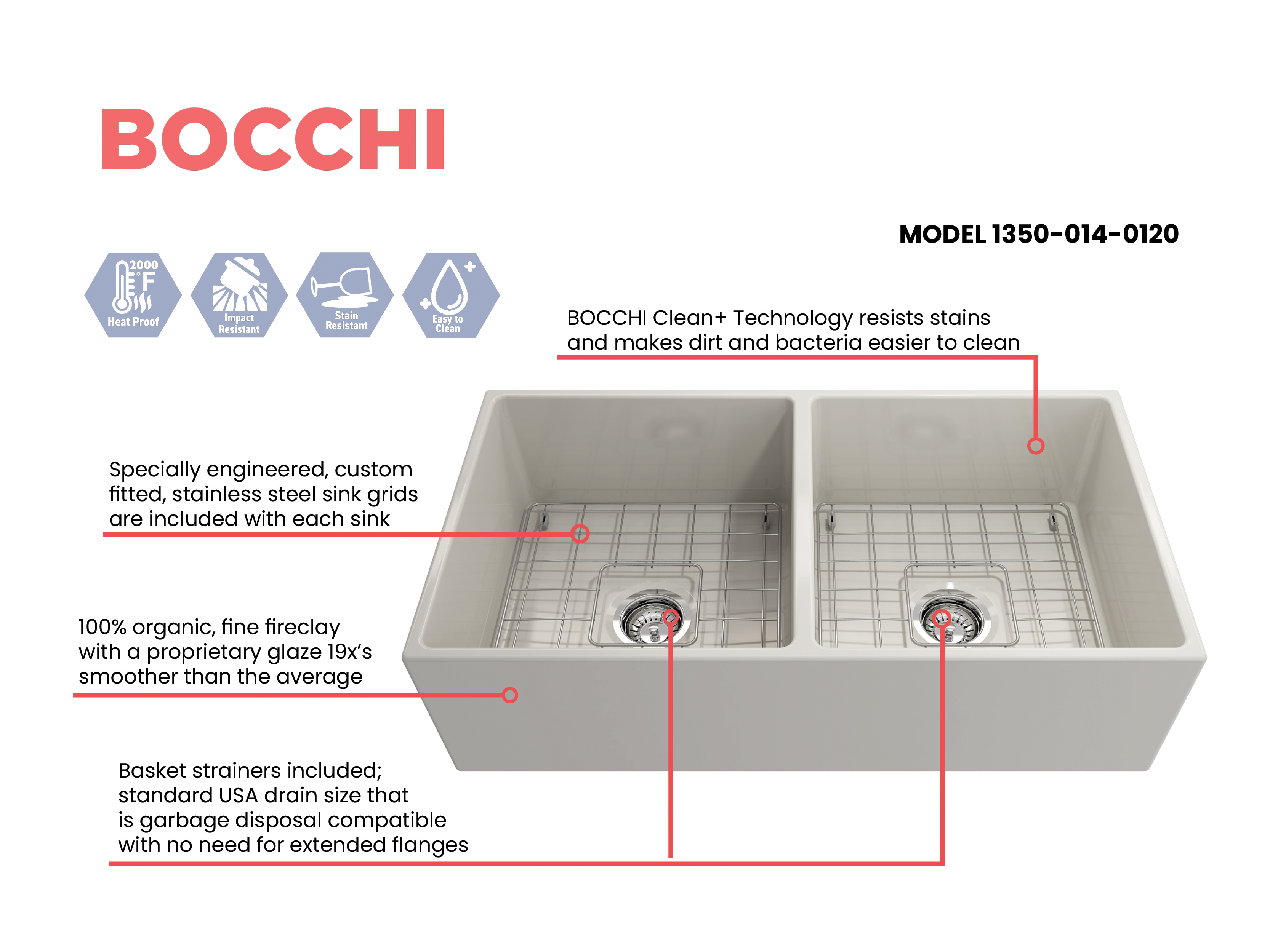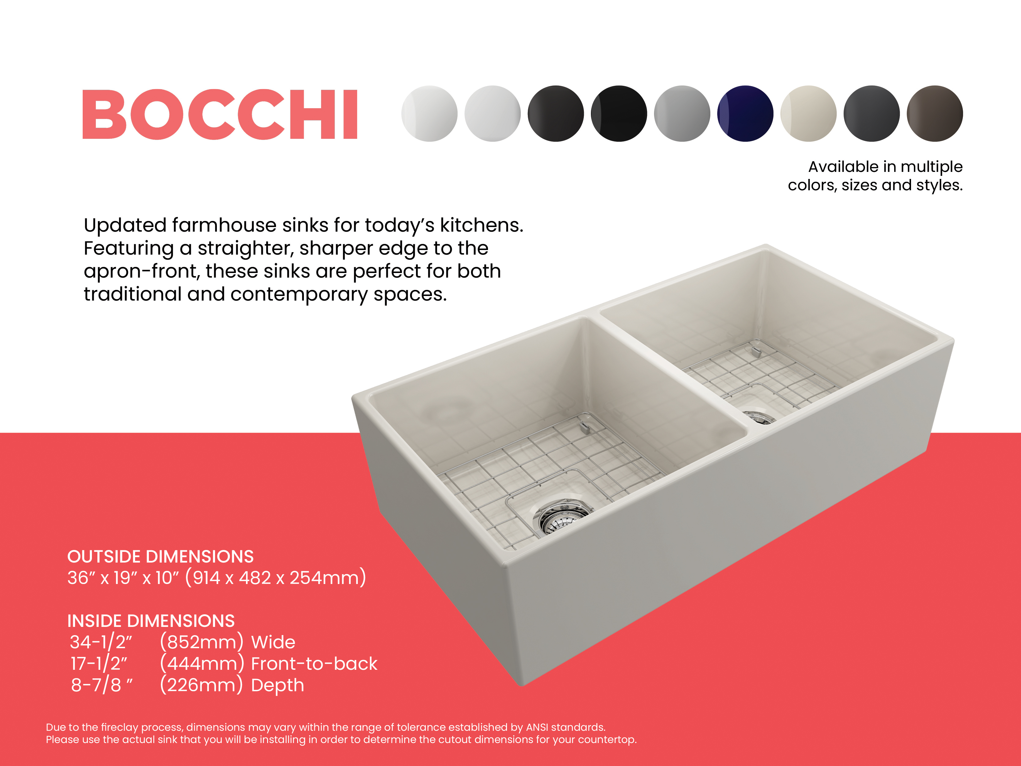 BOCCHI Farmhouse Sinks bring back the ultimate material to your kitchen. Fireclay, a 100% natural organic and recyclable material used by craftsman for centuries to create timeless appliances has now returned to your kitchen. With the firing in our kilns up to 2000°F temperatures, Fireclay becomes the most durable material used in today's kitchens. Thus, dealing with extreme heat coming from pots and pans is definitely not a problem. Due to their special glaze coating fused with the fireclay body, our sinks have a non-porous, uniform, scratch and stain resistant surface. With its protective bottom grid and distinctive looks, BOCCHI Farmhouse Sinks are truly crafted to match your design and functional desires.