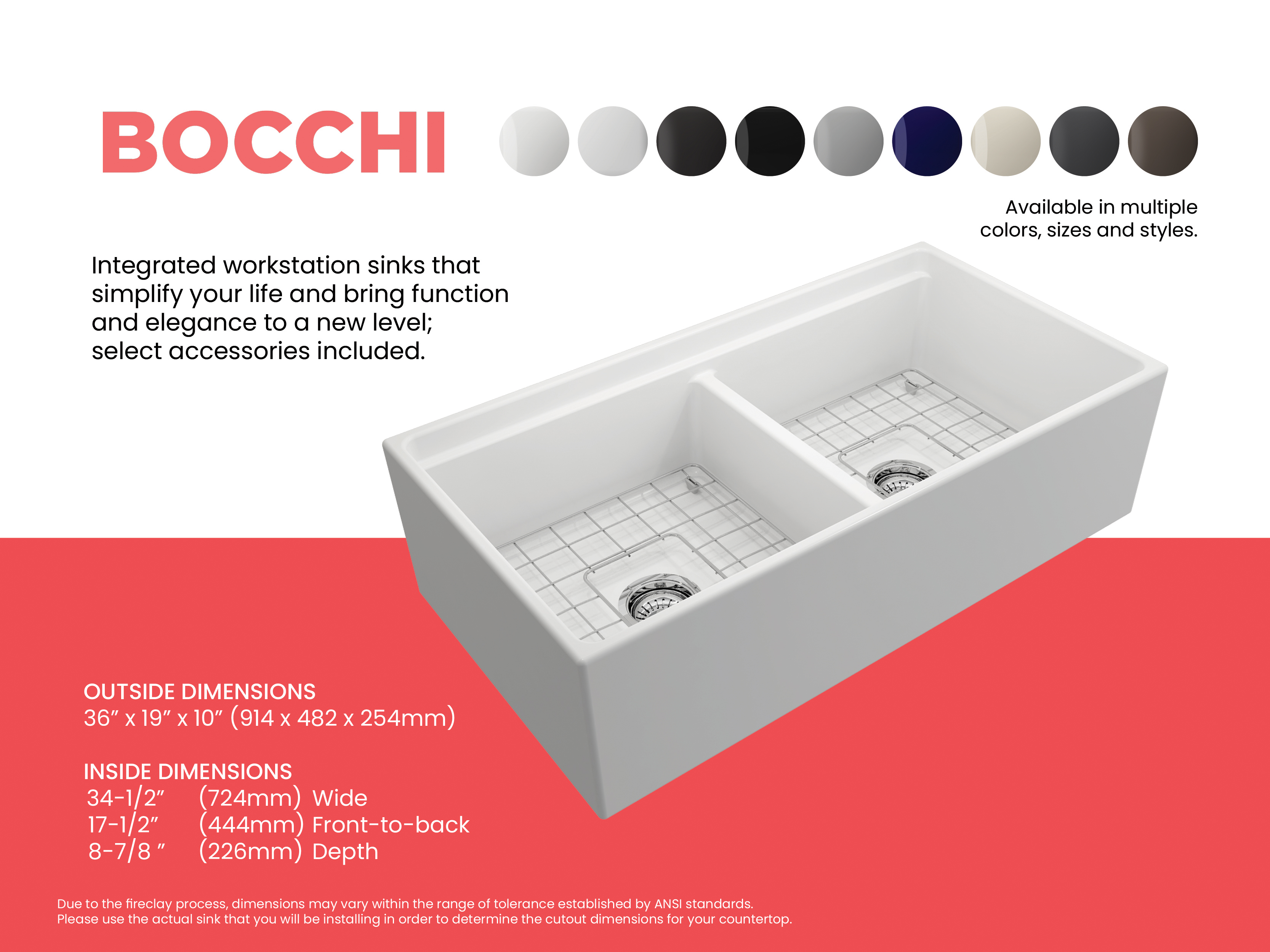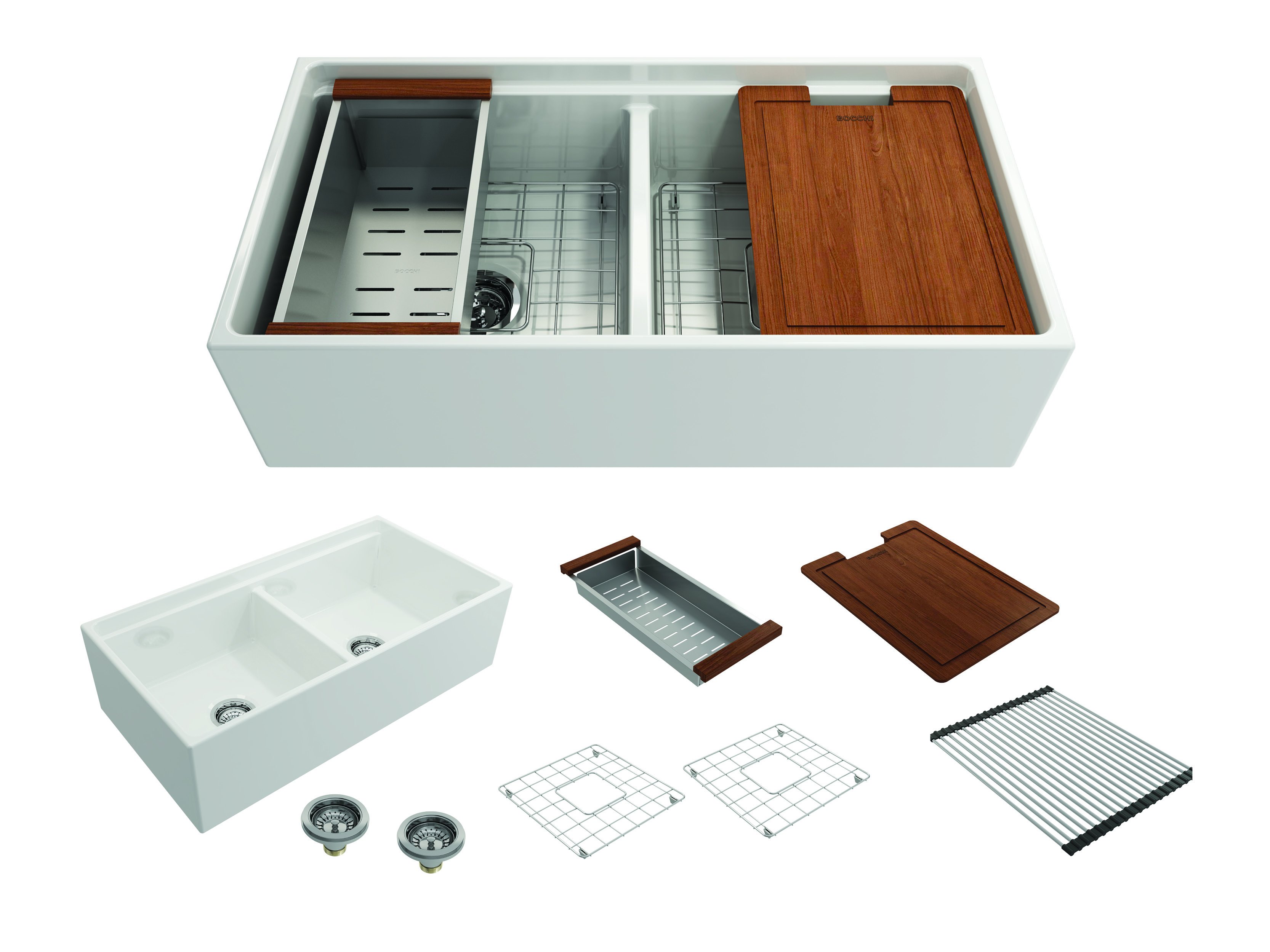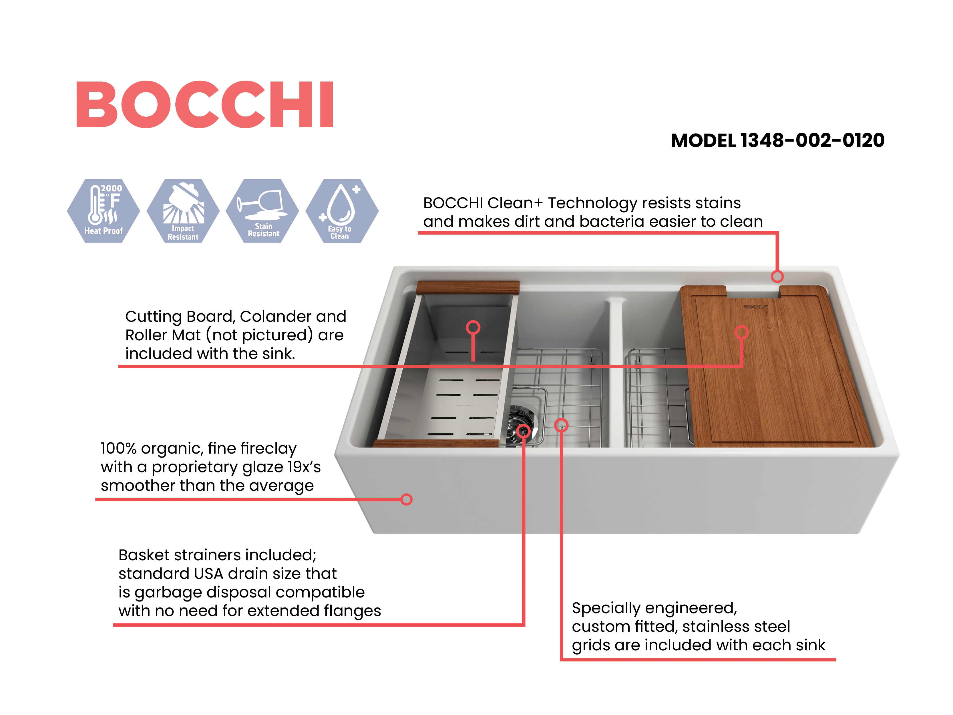 BOCCHI Farmhouse Sinks bring back the ultimate material to your kitchen. Fireclay, a 100% natural organic and recyclable material used by craftsman for centuries to create timeless appliances has now returned to your kitchen. With the firing in our kilns up to 2000°F temperatures, Fireclay becomes the most durable material used in today's kitchens. Thus, dealing with extreme heat coming from pots and pans is definitely not a problem. Due to their special glaze coating fused with the fireclay body, our sinks have a non-porous, uniform, scratch and stain resistant surface. With its protective bottom grid and distinctive looks, BOCCHI Farmhouse Sinks are truly crafted to match your design and functional desires.