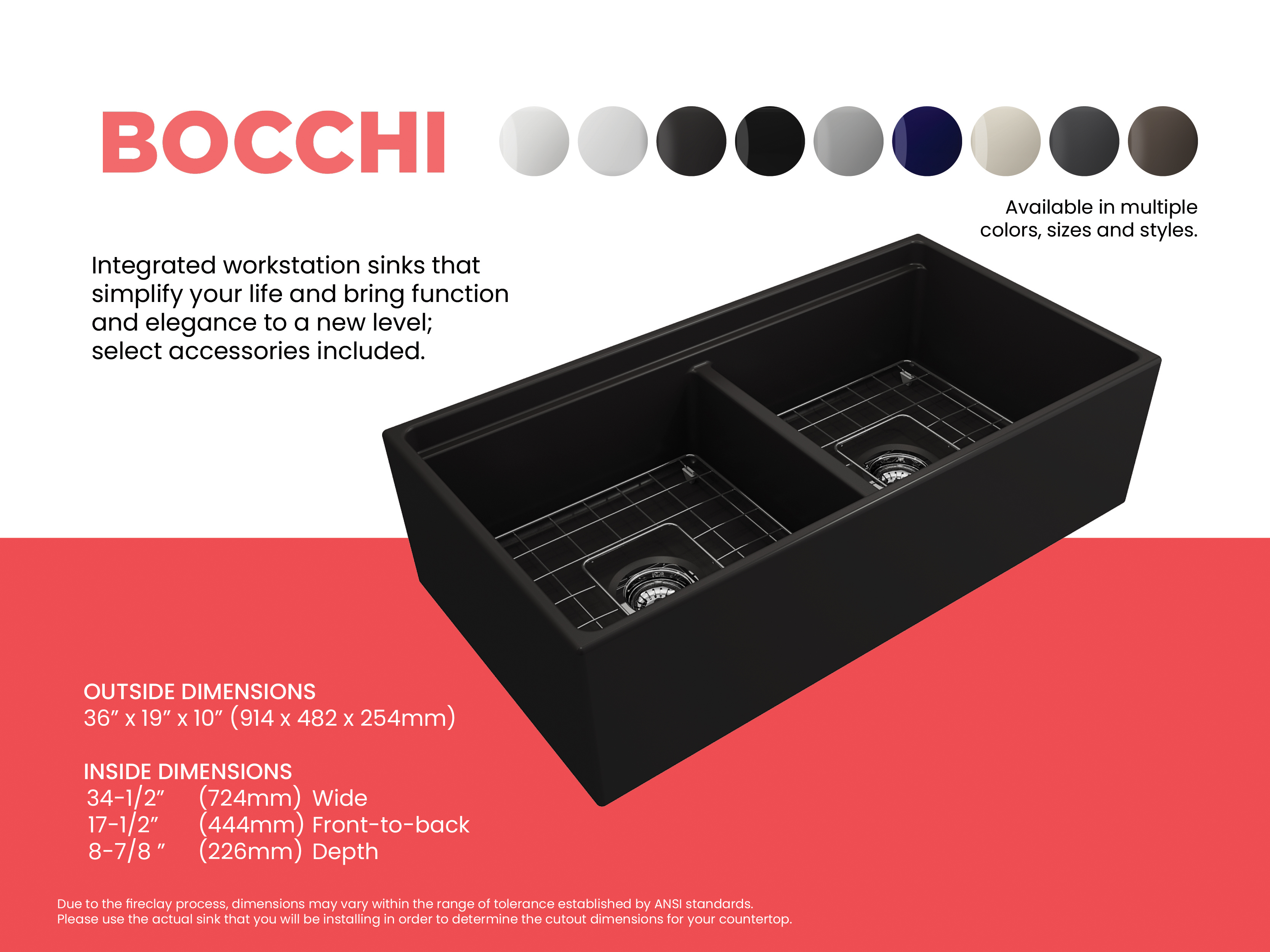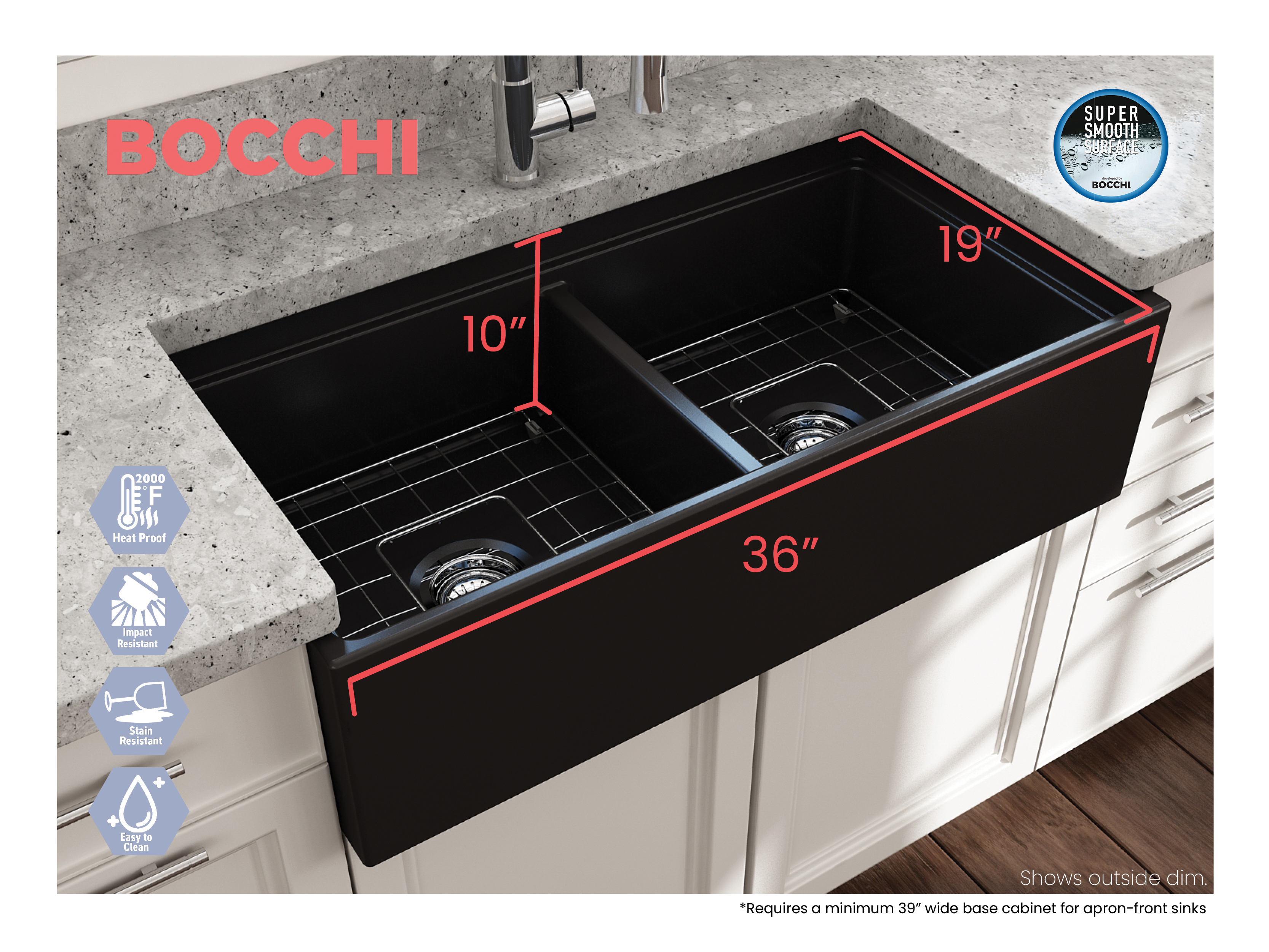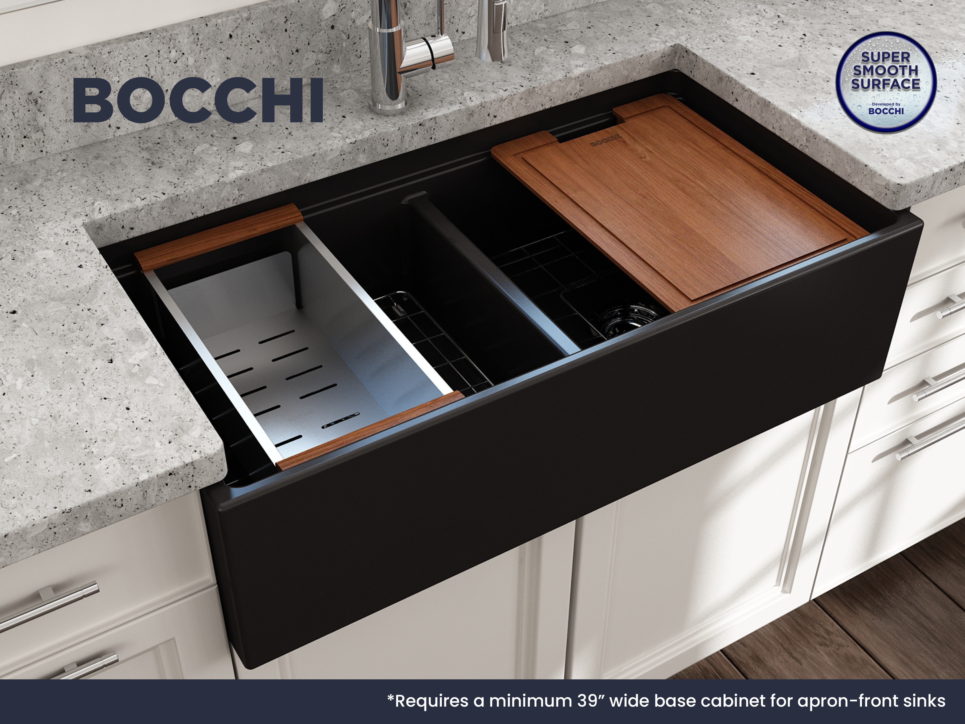 BOCCHI Farmhouse Sinks bring back the ultimate material to your kitchen. Fireclay, a 100% natural organic and recyclable material used by craftsman for centuries to create timeless appliances has now returned to your kitchen. With the firing in our kilns up to 2000°F temperatures, Fireclay becomes the most durable material used in today's kitchens. Thus, dealing with extreme heat coming from pots and pans is definitely not a problem. Due to their special glaze coating fused with the fireclay body, our sinks have a non-porous, uniform, scratch and stain resistant surface. With its protective bottom grid and distinctive looks, BOCCHI Farmhouse Sinks are truly crafted to match your design and functional desires.