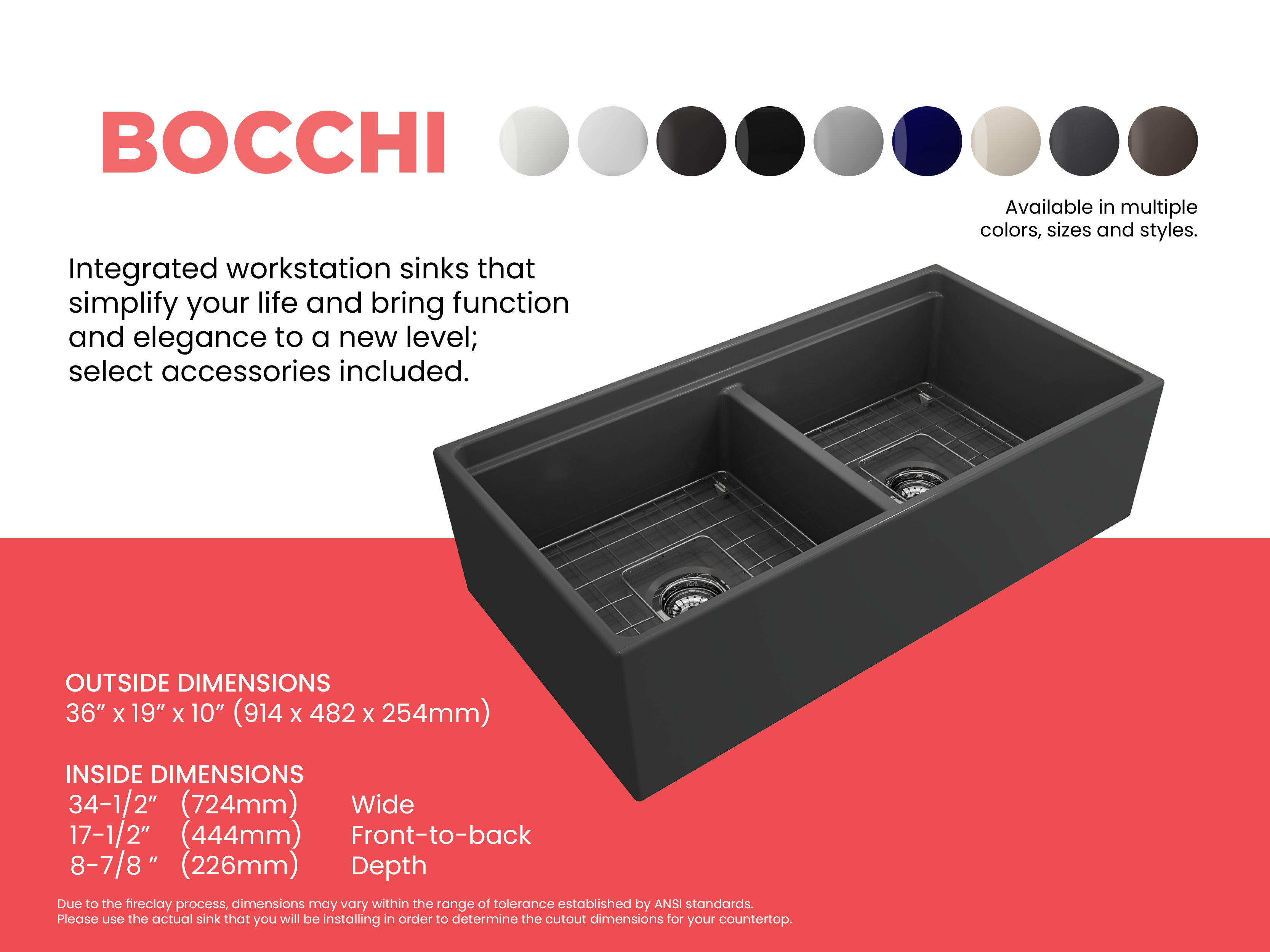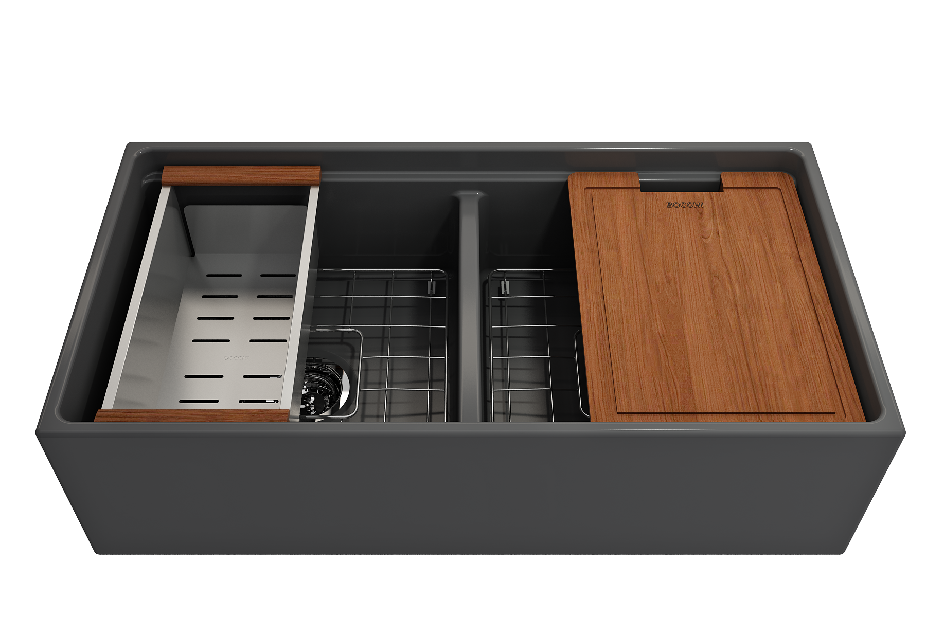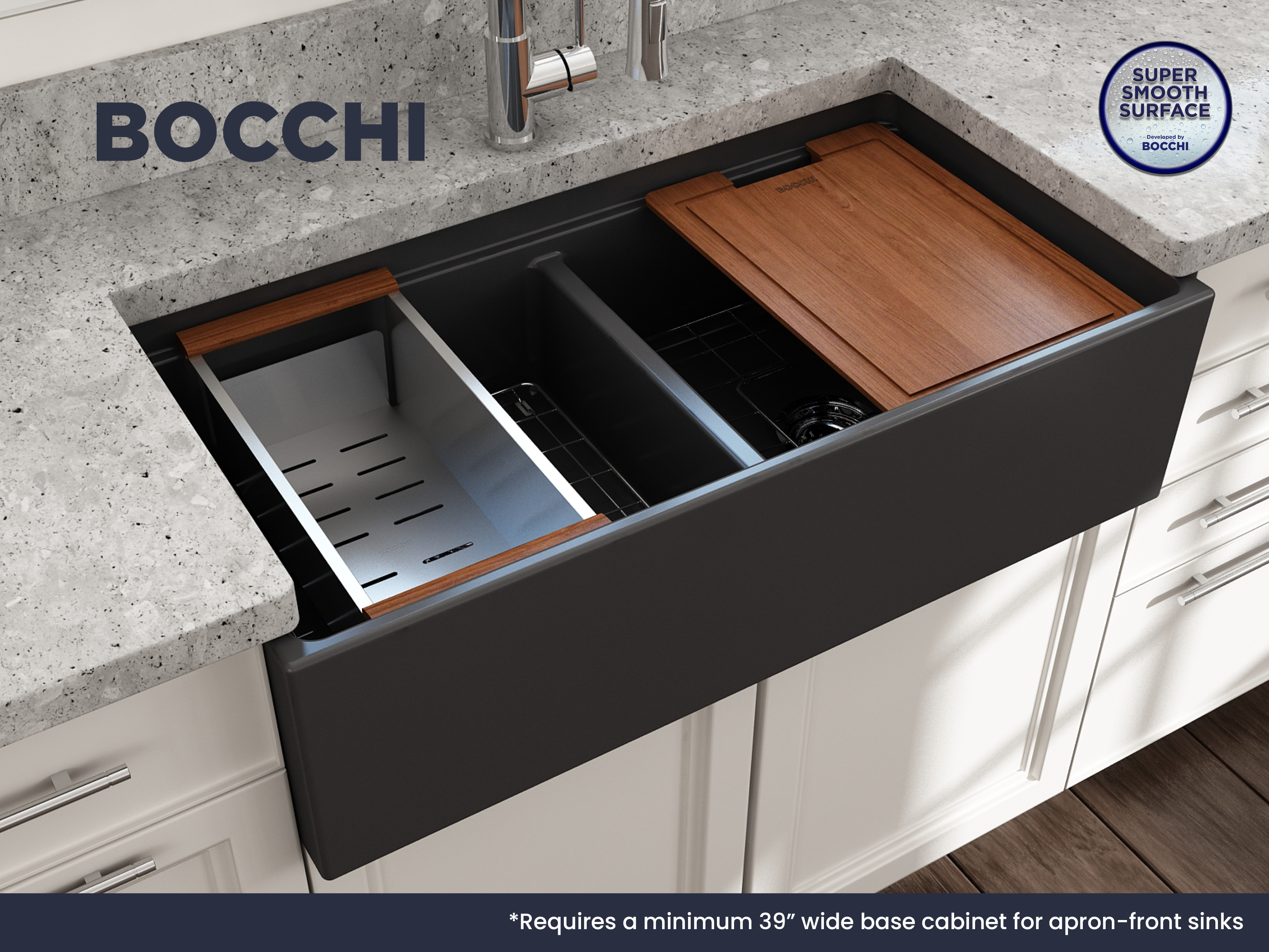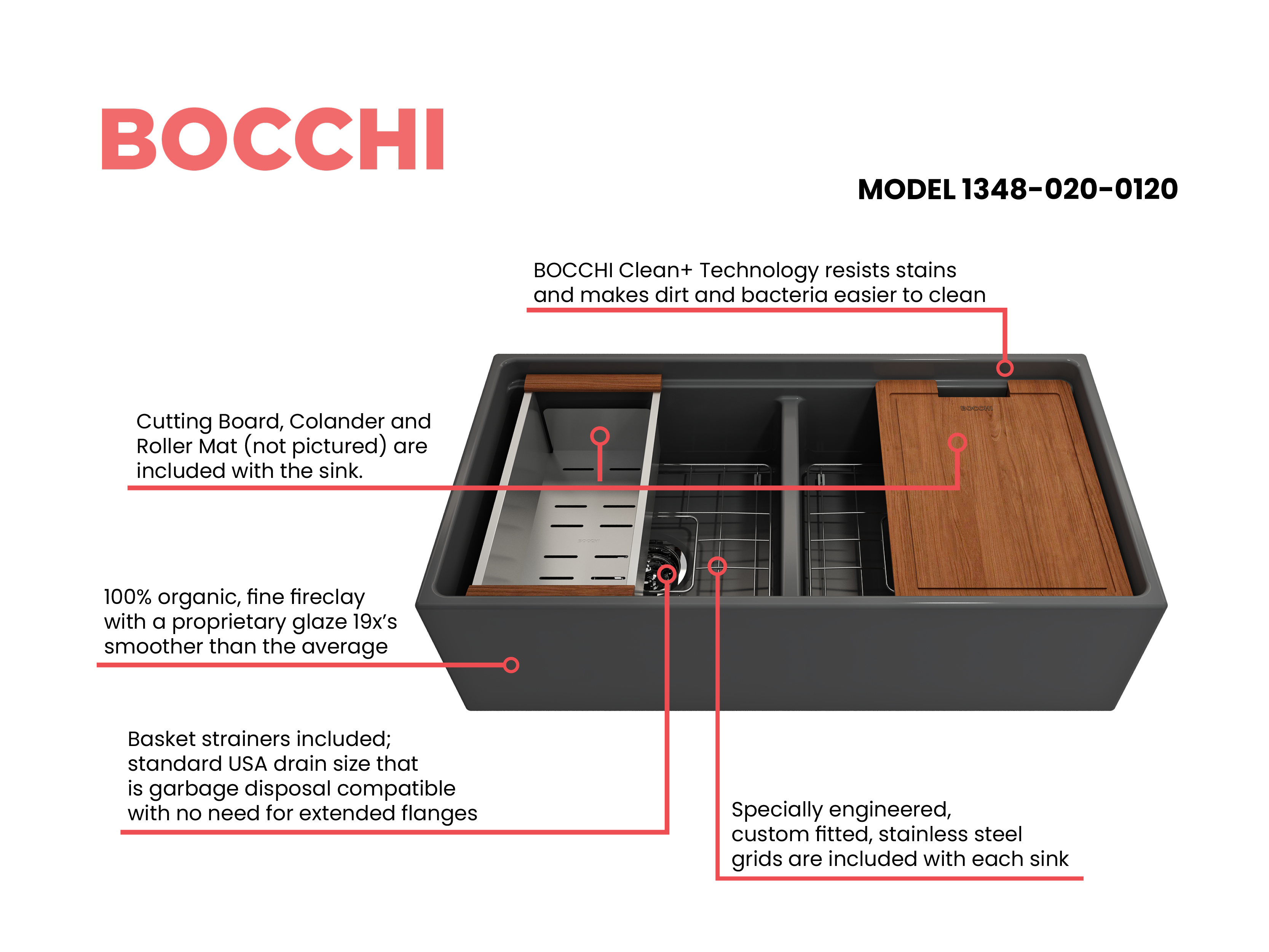 BOCCHI Farmhouse Sinks bring back the ultimate material to your kitchen. Fireclay, a 100% natural organic and recyclable material used by craftsman for centuries to create timeless appliances has now returned to your kitchen. With the firing in our kilns up to 2000°F temperatures, Fireclay becomes the most durable material used in today's kitchens. Thus, dealing with extreme heat coming from pots and pans is definitely not a problem. Due to their special glaze coating fused with the fireclay body, our sinks have a non-porous, uniform, scratch and stain resistant surface. With its protective bottom grid and distinctive looks, BOCCHI Farmhouse Sinks are truly crafted to match your design and functional desires.
