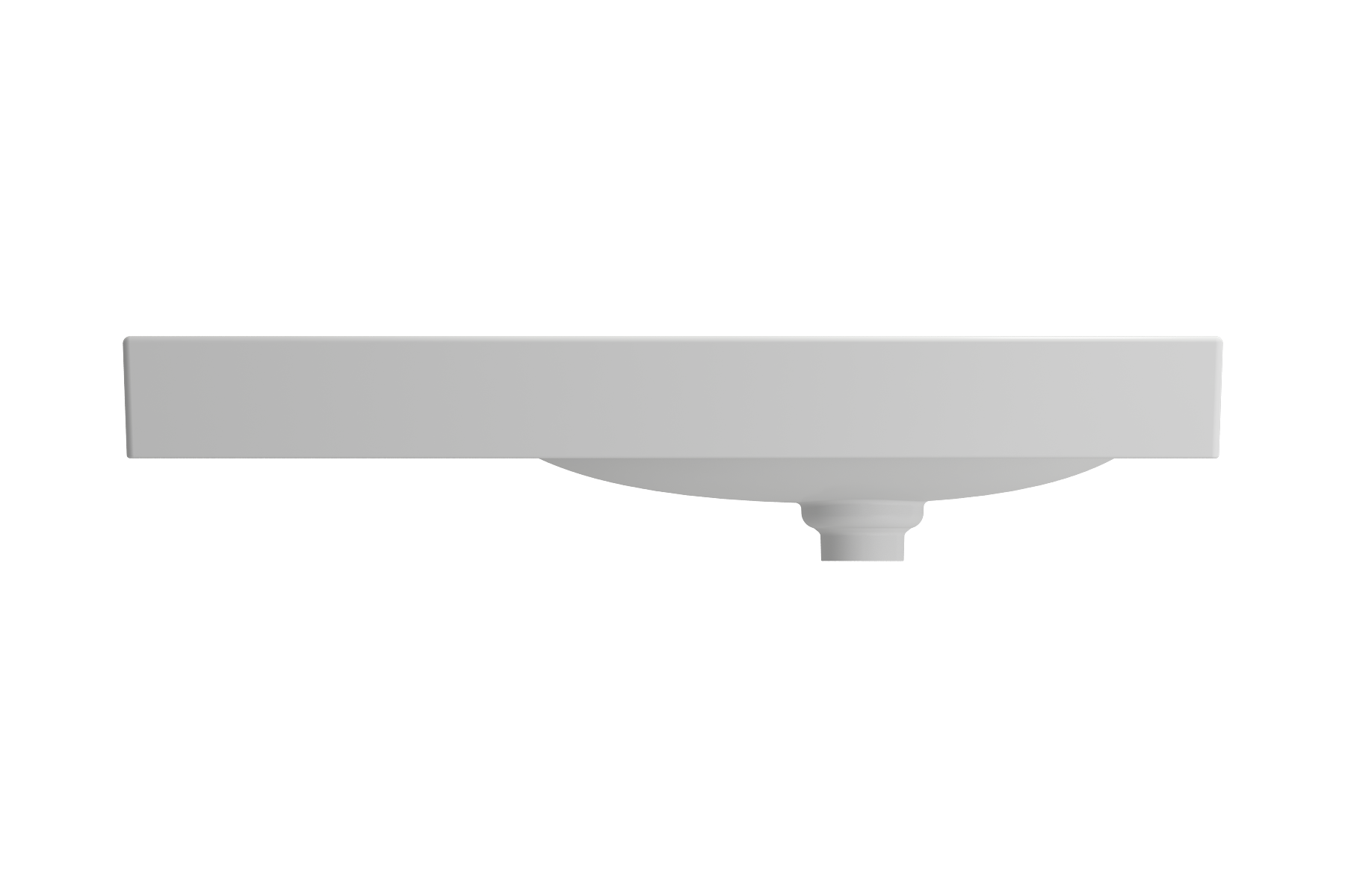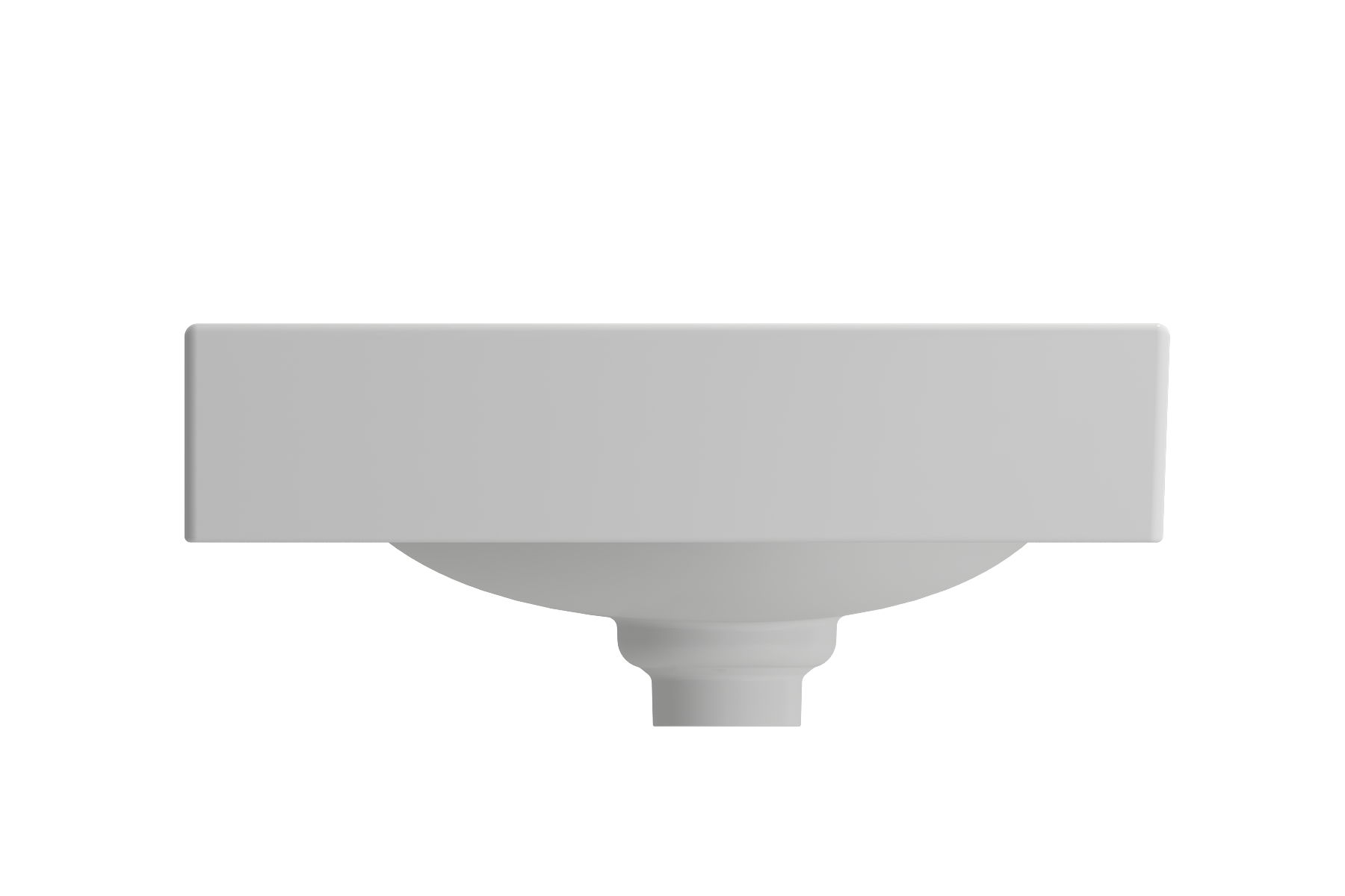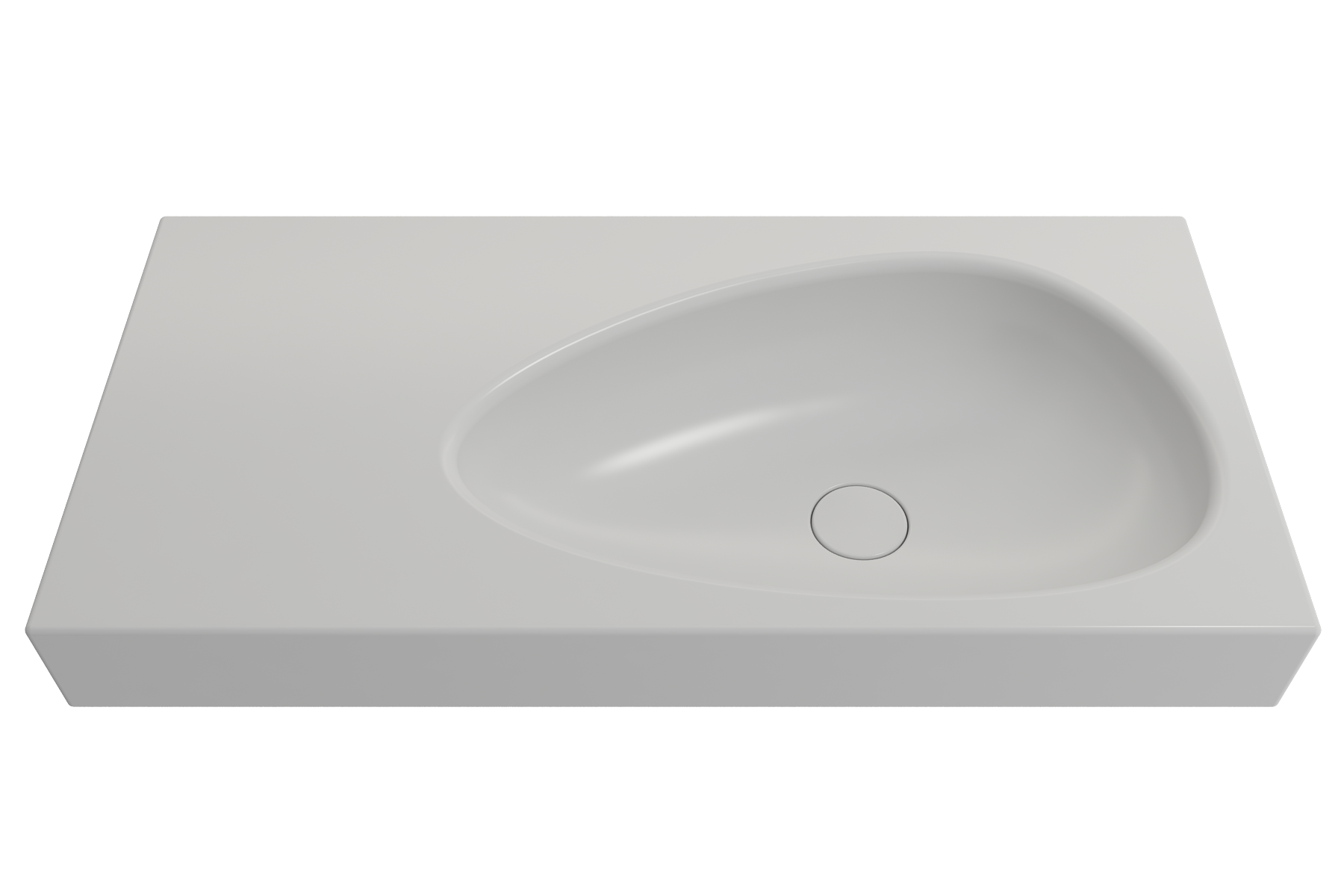 Unique wall-mount sink with counter shape and artist's palette shaped basin. Features counter area around the asymetrically, left-set basin. Without overflow or faucet setting; requires a wall-mounted faucet. Comes with a color-matched, pop-up drain cover.